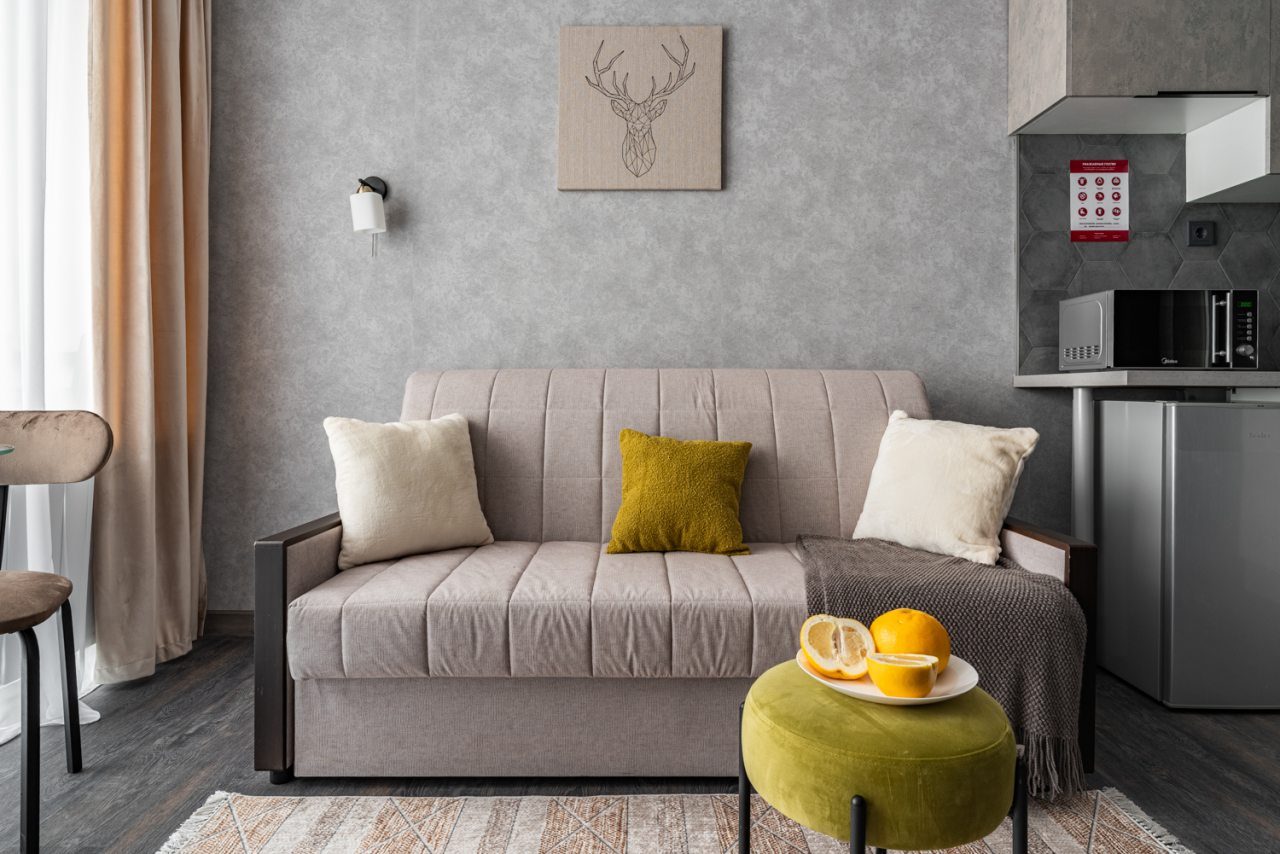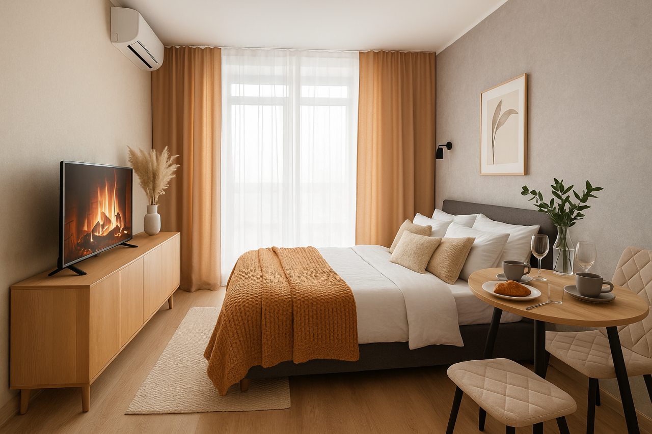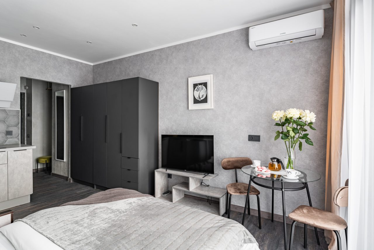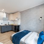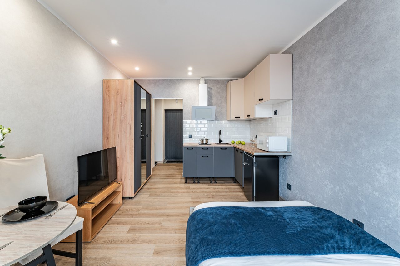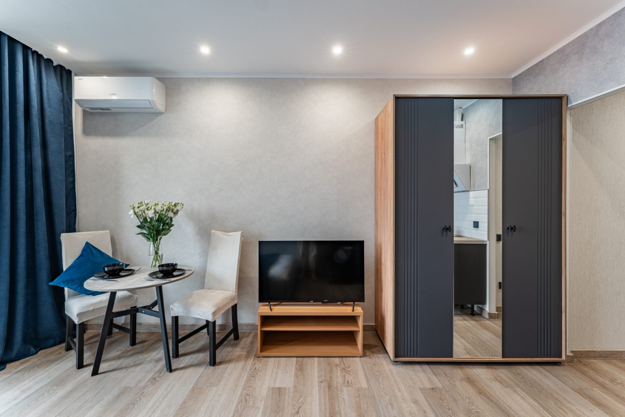 Апартаменты с современным ремонтом оснащены двуспальной кроватью, кондиционером для регулирования температуры, шкафом для хранения вещей, кухонной зоной и лоджией с видом на город. Доступна точка высокоскоростного интернета и ЖК-телевизор с онлайн-кинотеатрами. Санузел оборудован качественной сантехникой.