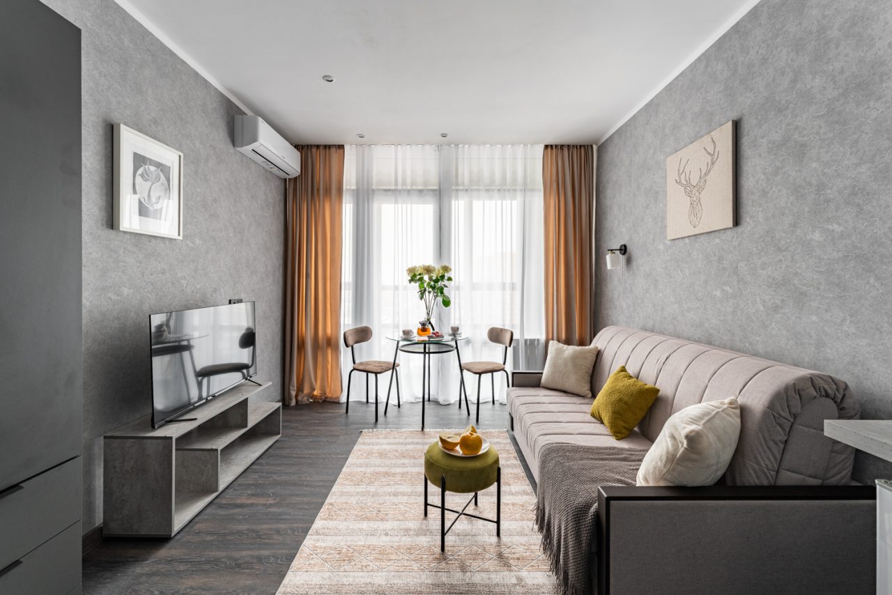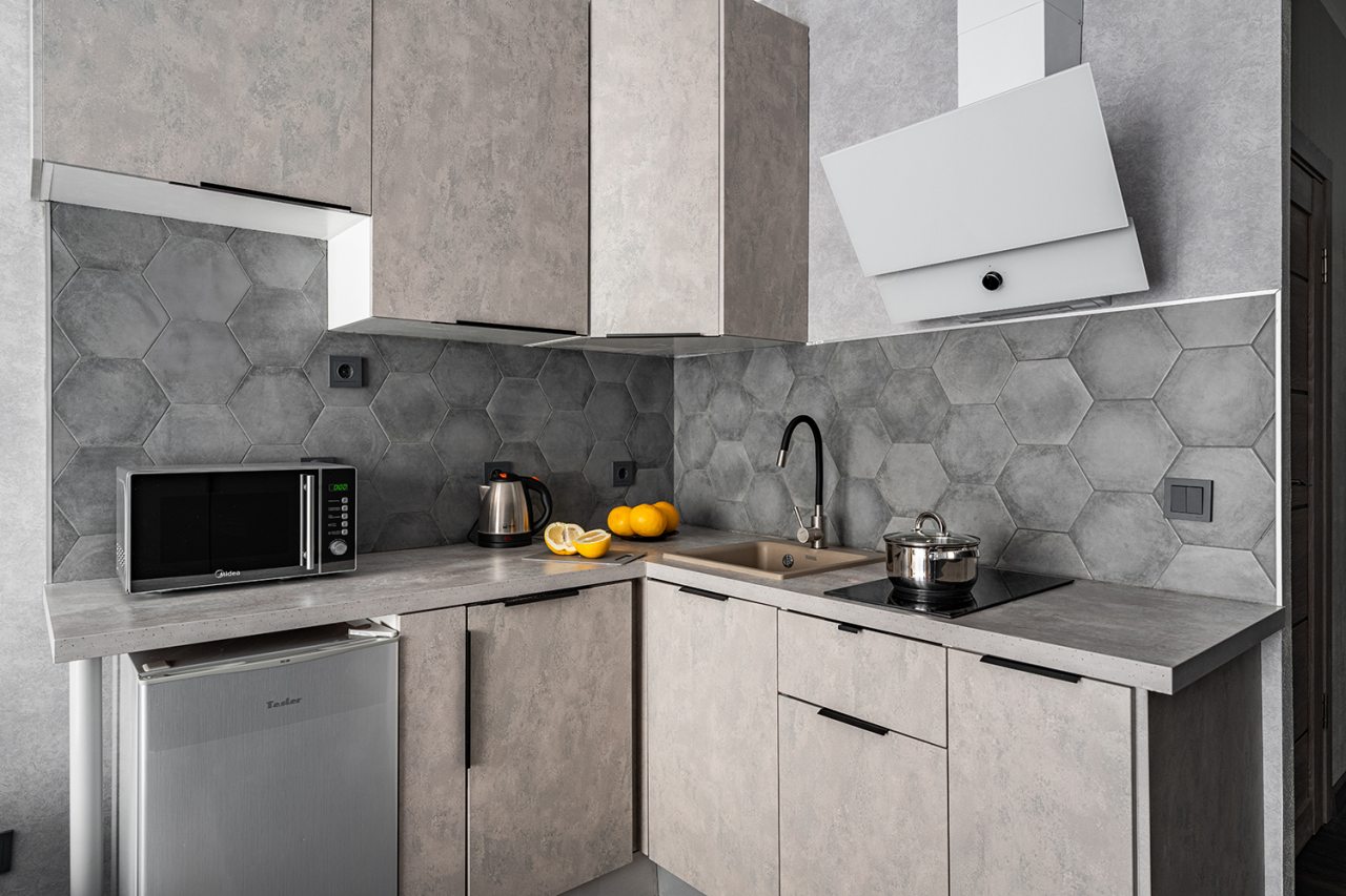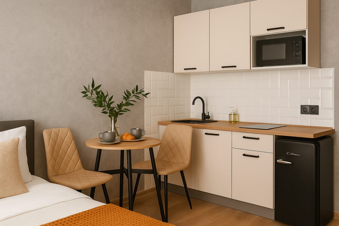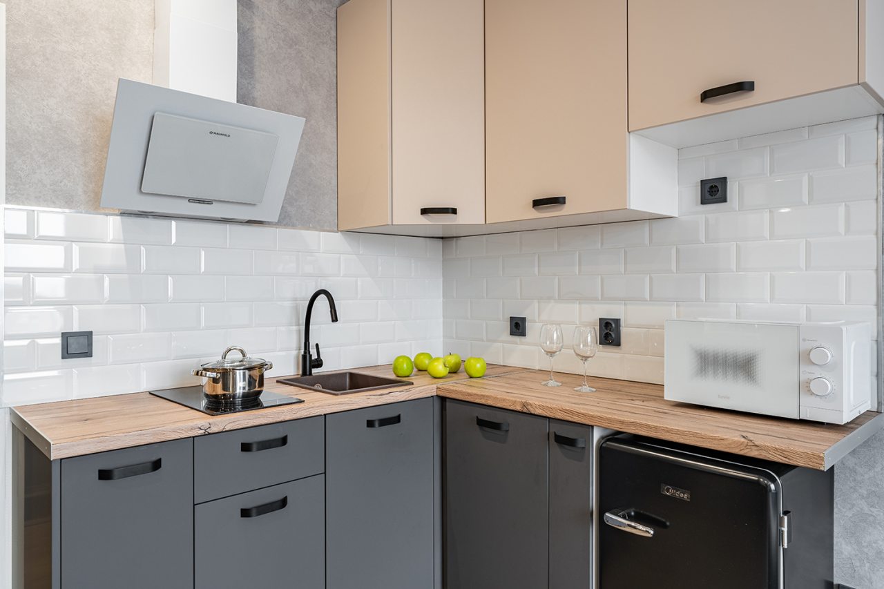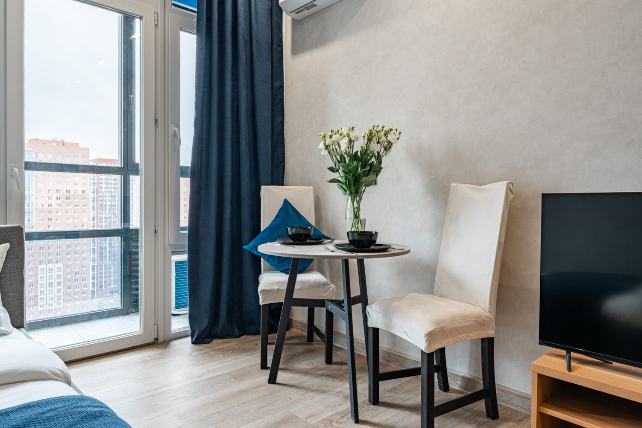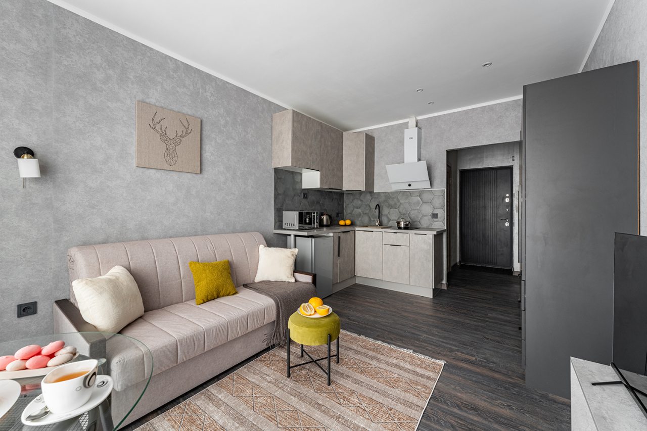 Апартаменты с современным ремонтом оснащены двуспальной кроватью, кондиционером для регулирования температуры, шкафом для хранения вещей, кухонной зоной и лоджией с видом на город. Доступна точка высокоскоростного интернета и ЖК-телевизор с онлайн-кинотеатрами. Санузел оборудован качественной сантехникой.