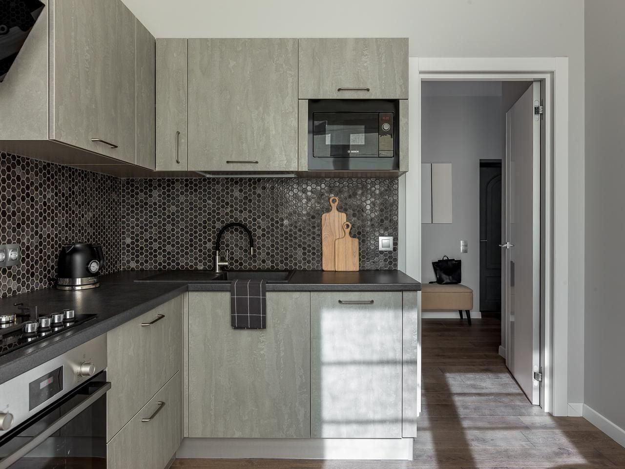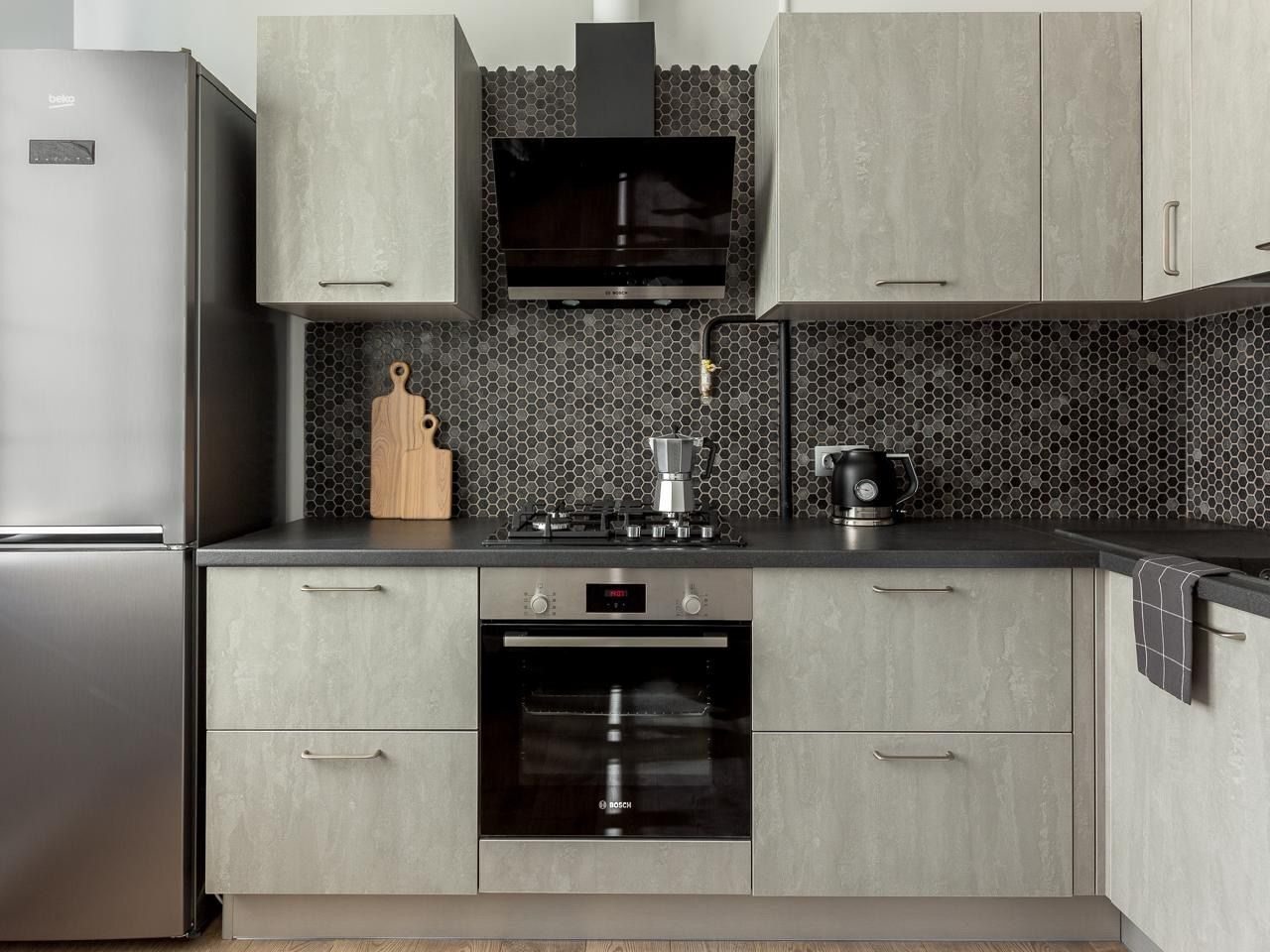 Для приготовления любимых блюд есть кухня, укомплектованная плитой, чайником, гейзерной кофеваркой, духовым шкафом, холодильником, обеденной зоной, различной посудой и столовыми приборами.