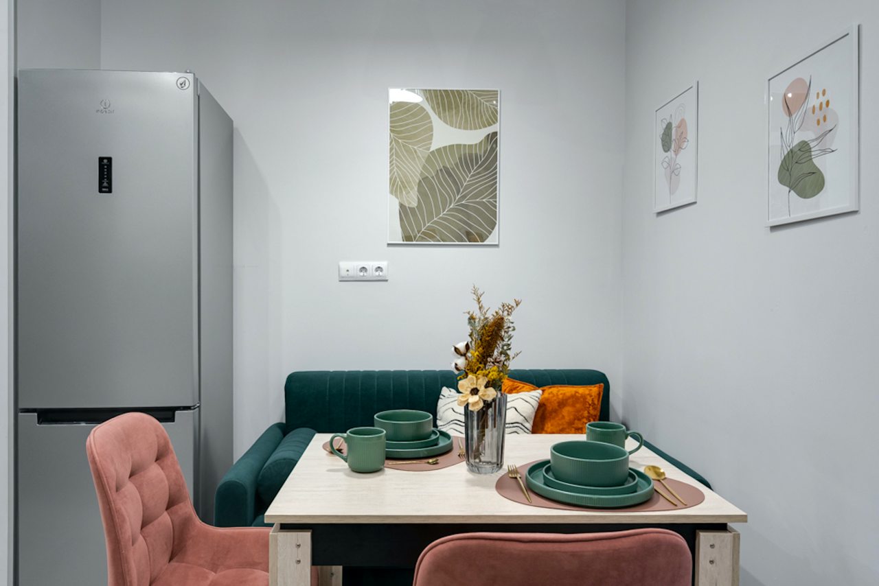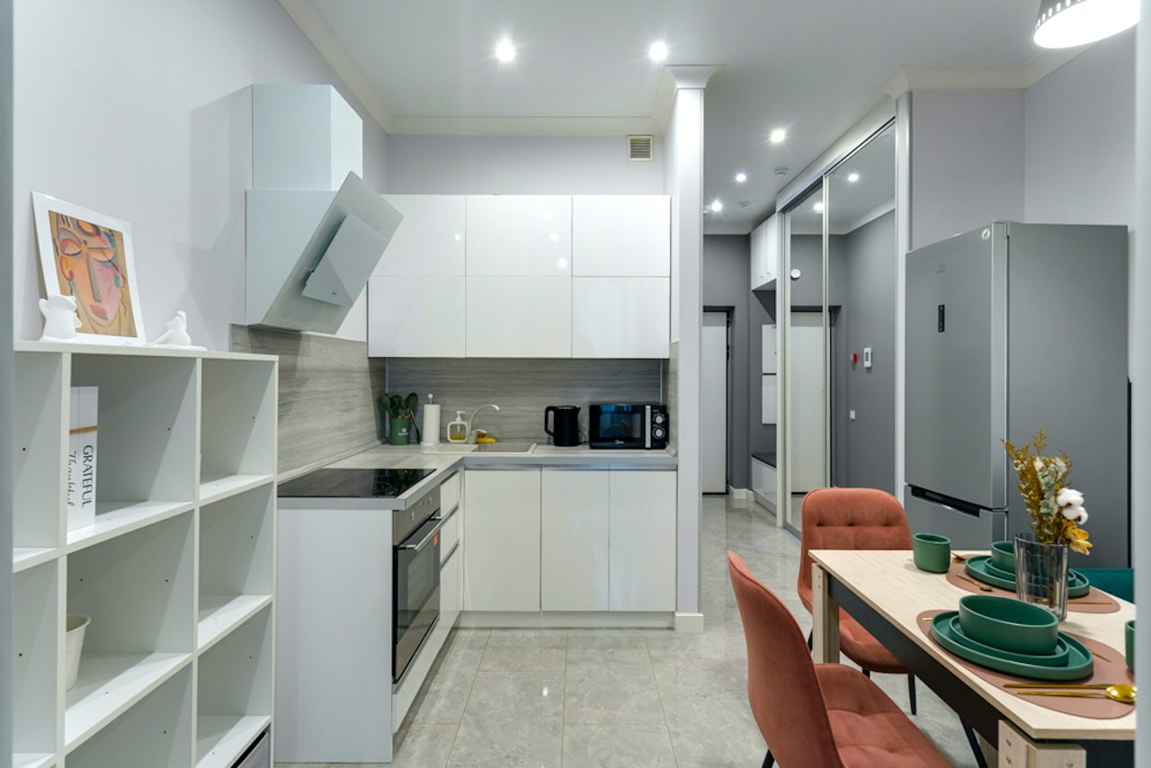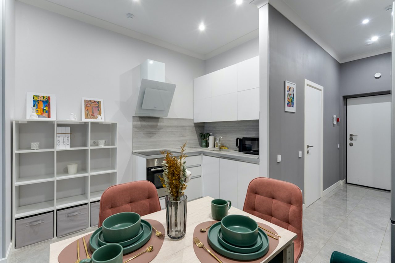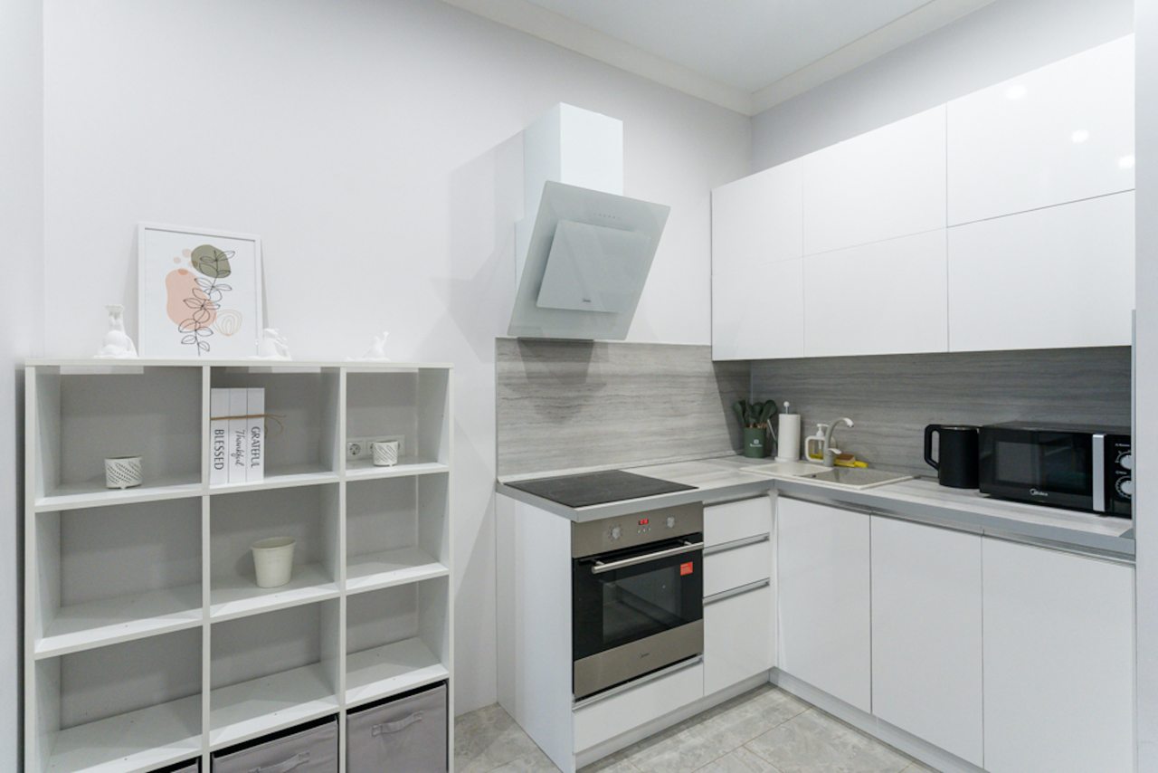 Кухней укомплектована белоснежным гарнитуром, духовым шкафом, вытяжкой, электроплитой, микроволновой печью, электрочайником, холодильником и набором посуды. В доступности кафе, кофейня и продуктовые магазины.