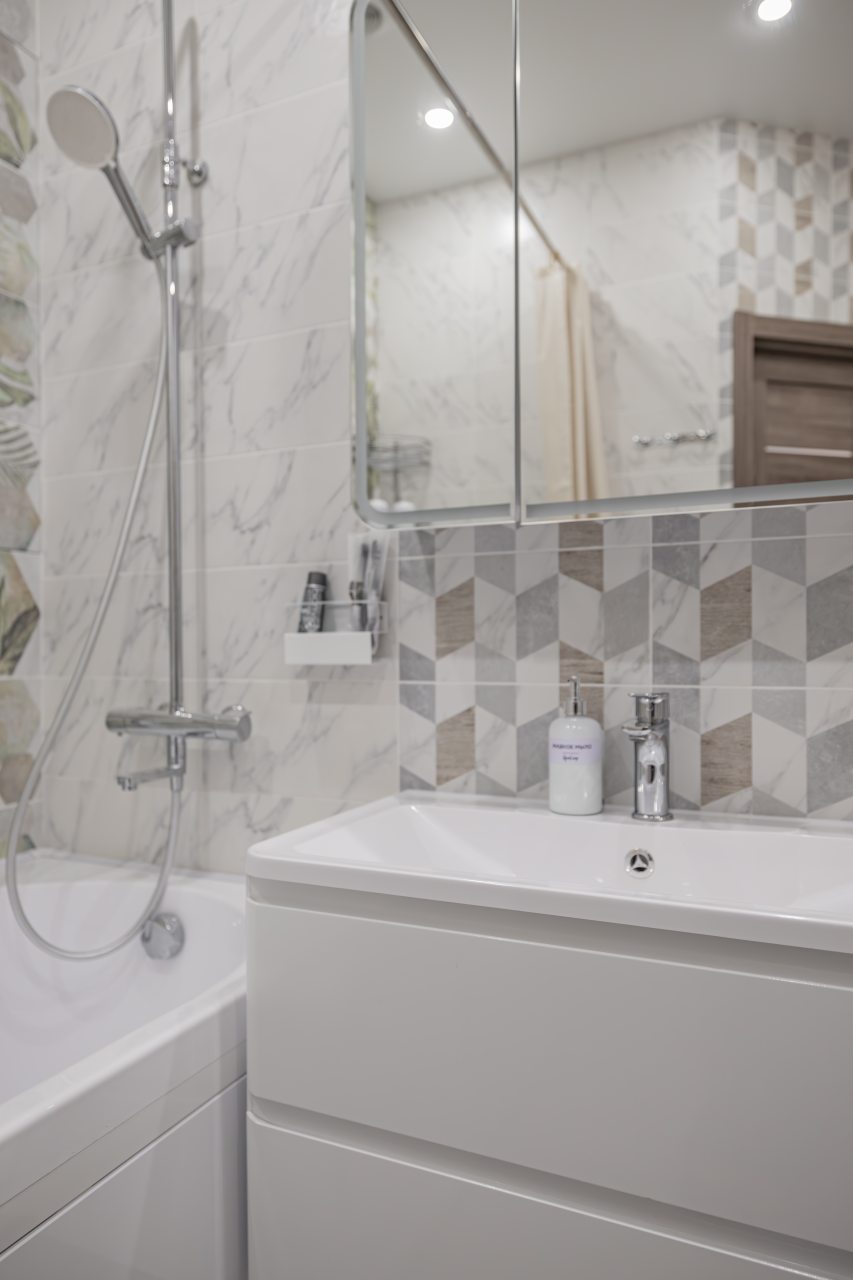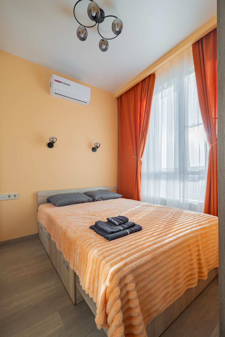 В апартаментах имеется большая кровать, на которой можно отдохнуть после долгой дороги, а также диван. Для постояльцев есть все необходимое для комфортного проживания: просторный санузел с ванной, туалетом, раковиной и феном, набор постельного белья и полотенец.