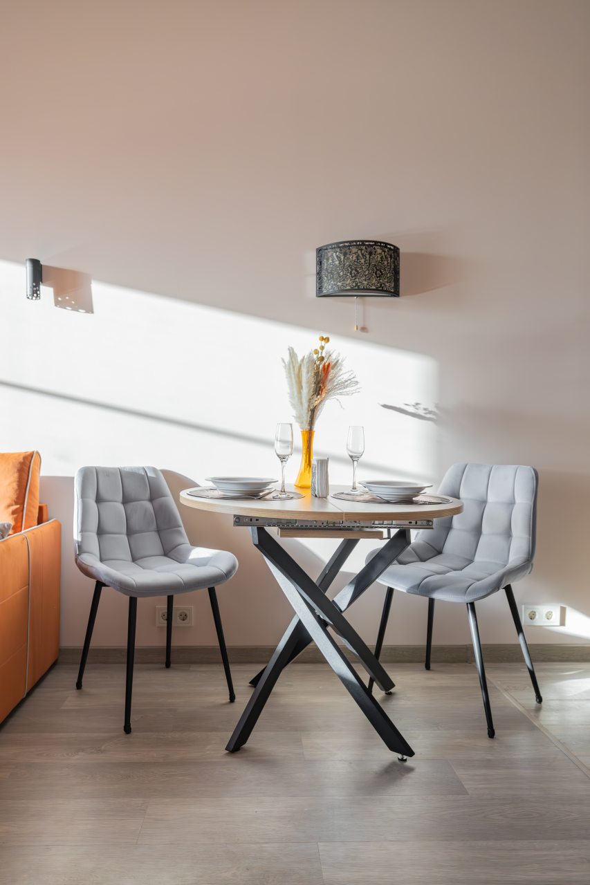 В обеденной зоне есть раскладной стол для большой компании, посуда и техника для приготовления пищи: духовой шкаф, варочная панель, холодильник, электрический чайник и микроволновая печь. Для удобства гостей установлена посудомоечная машина.