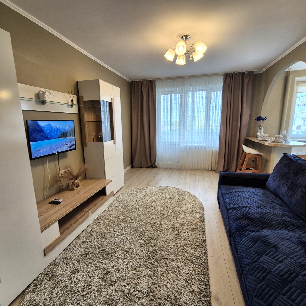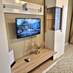 Внутри предусмотрено всё для комфорта гостей, в том числе удобный диван, двуспальная кровать с удобным матрасом, телевизор, шкафы, балкон с видом на деревья. В ванной комнате имеется стиральная машина.