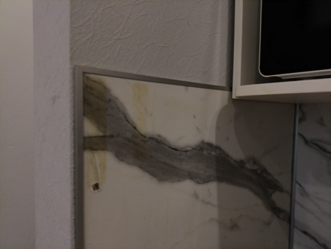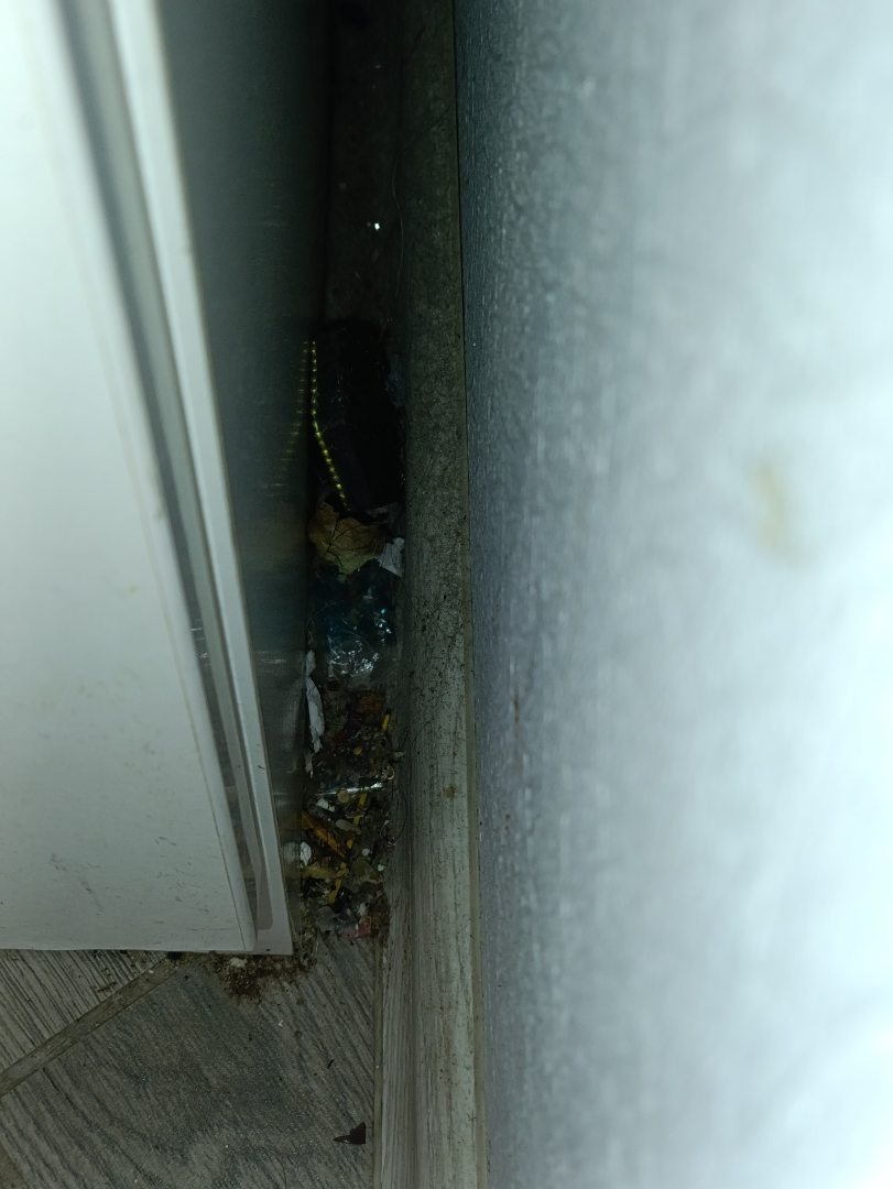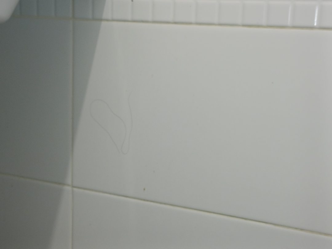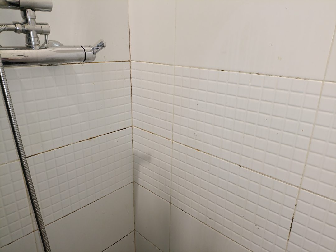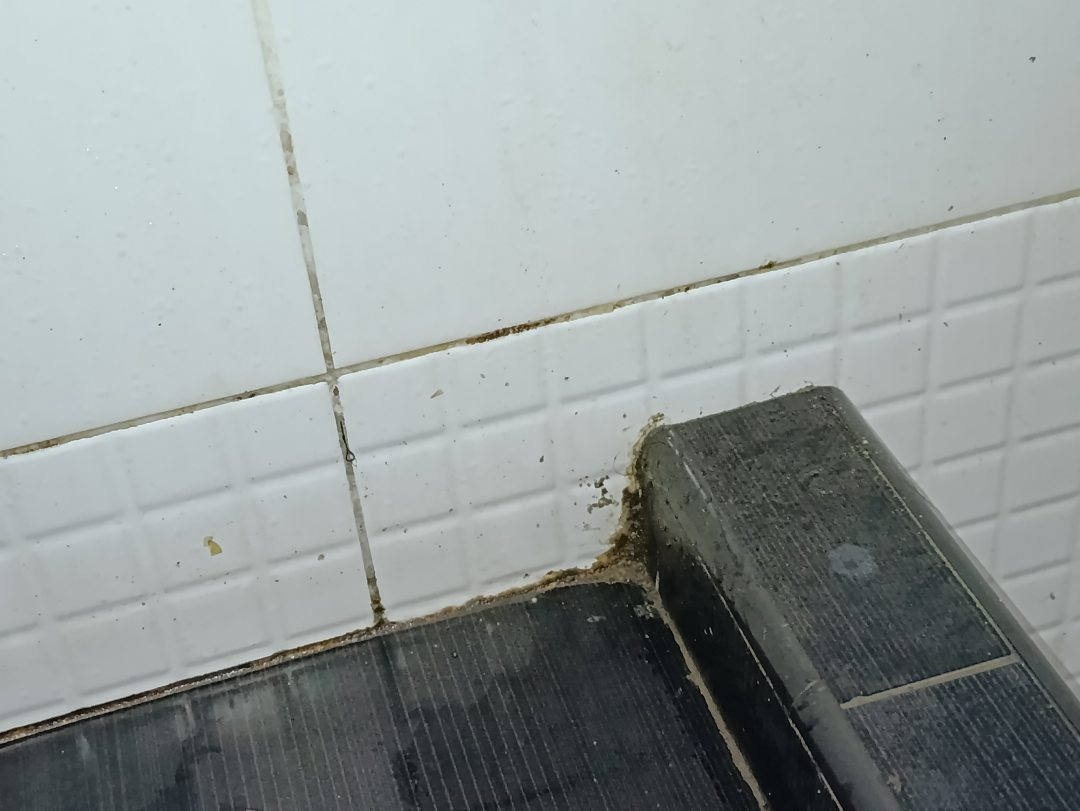 Затирка на белой плитке в ванной вместо белой стала черной. Часть мусора с пола сгребали в стык между шкафом и стеной.
