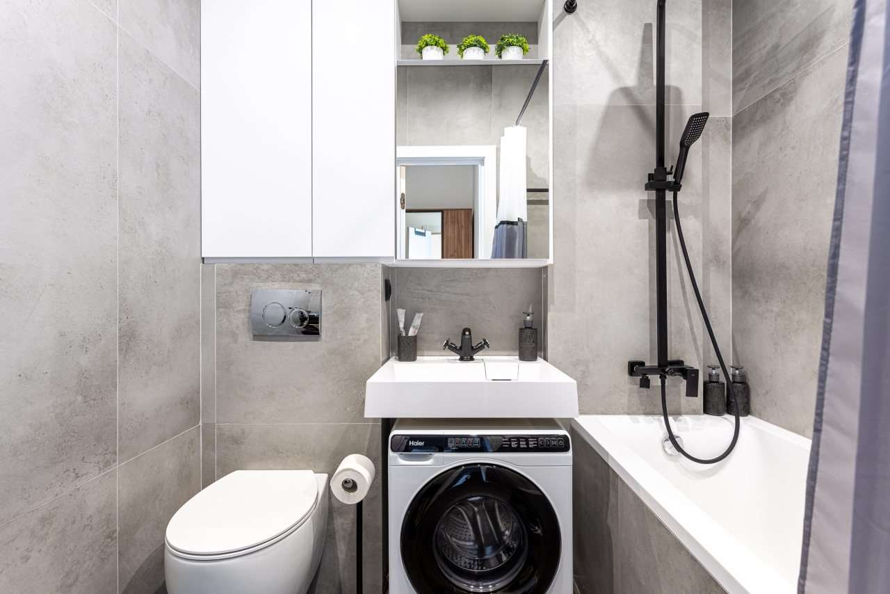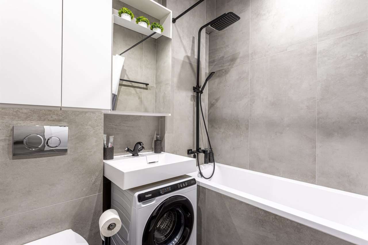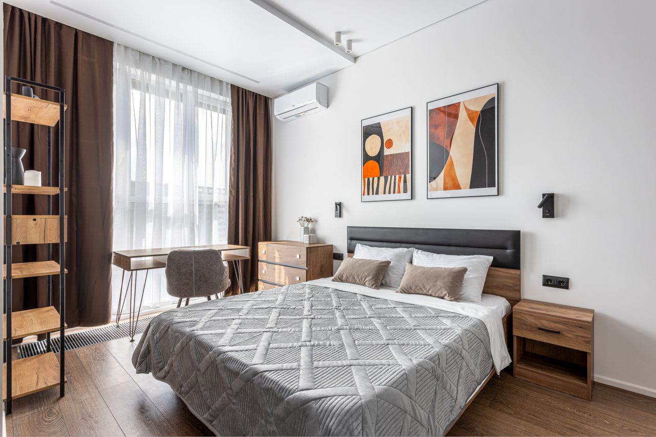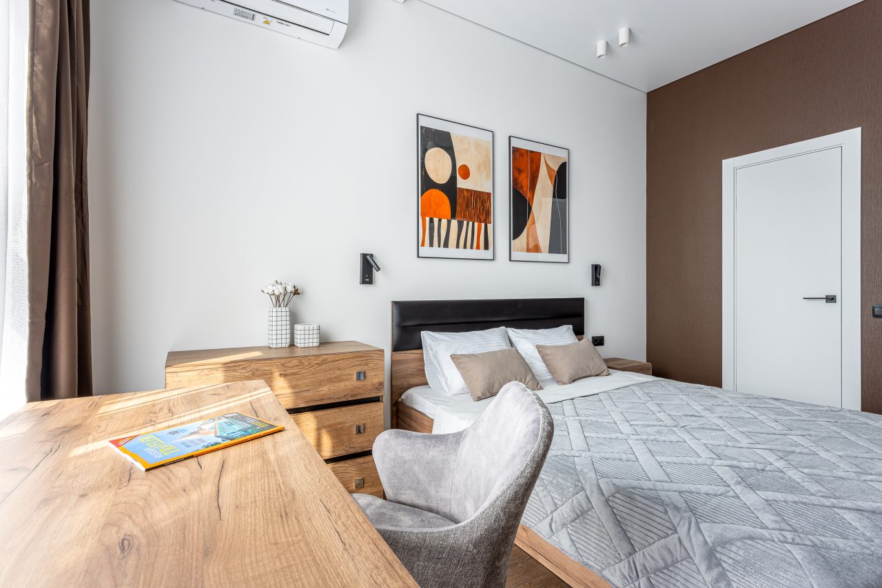 Внутри вас ждет стильный современный дизайн, удобная двуспальная кровать, прикроватные светильники, кондиционер, стеллаж и комод, рабочая зона, вместительная гардеробная. В санузле всё продумано для вашего комфорта: от стиральной машины до туалетно-косметических средств.
