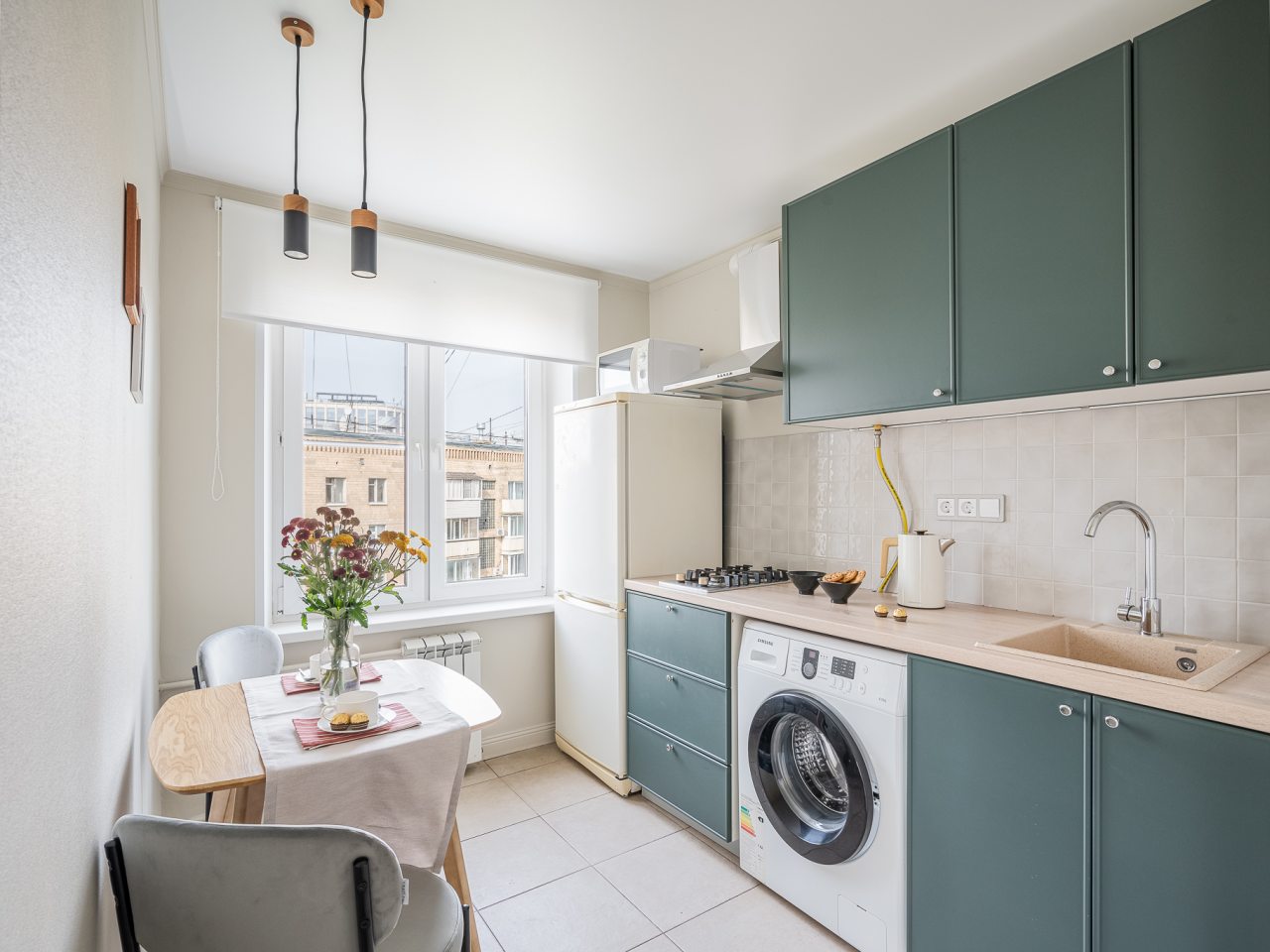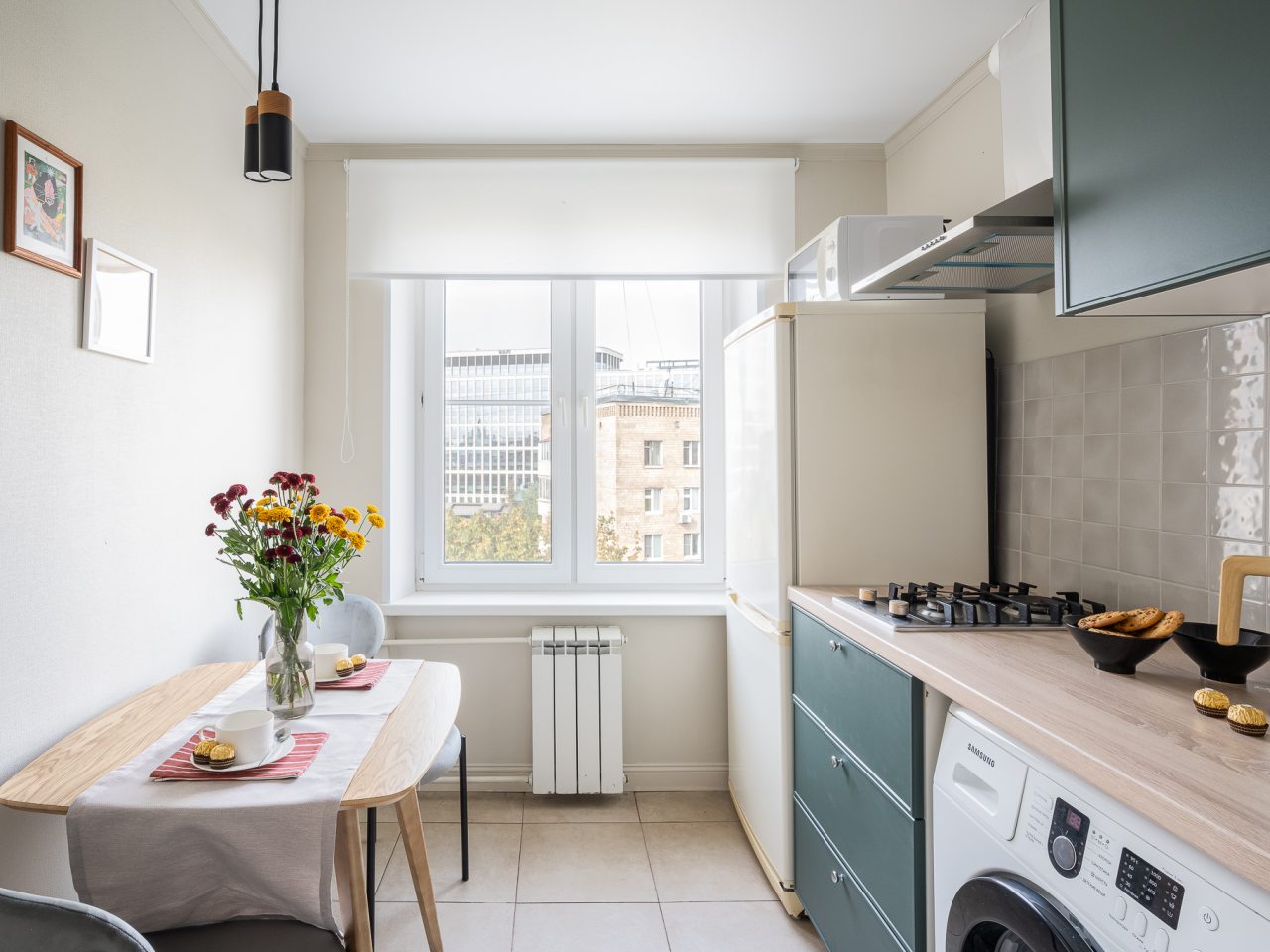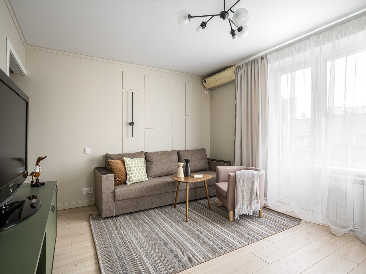 Квартира выполнена в мятно-зеленой гамме с выходом на балкон, откуда видны городские здания. К удобствам гостей имеется двуспальная кровать, диван, телевизор, кондиционер. Чтобы гости всегда оставались на связи подключен бесплатный Wi-fi. В ванной комнате приготовлено полотенце.