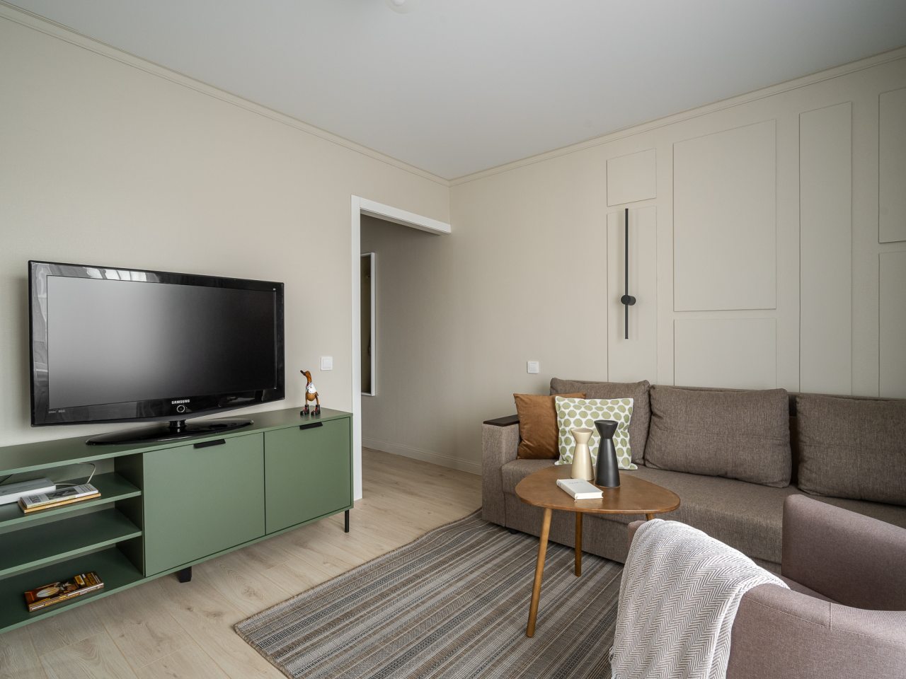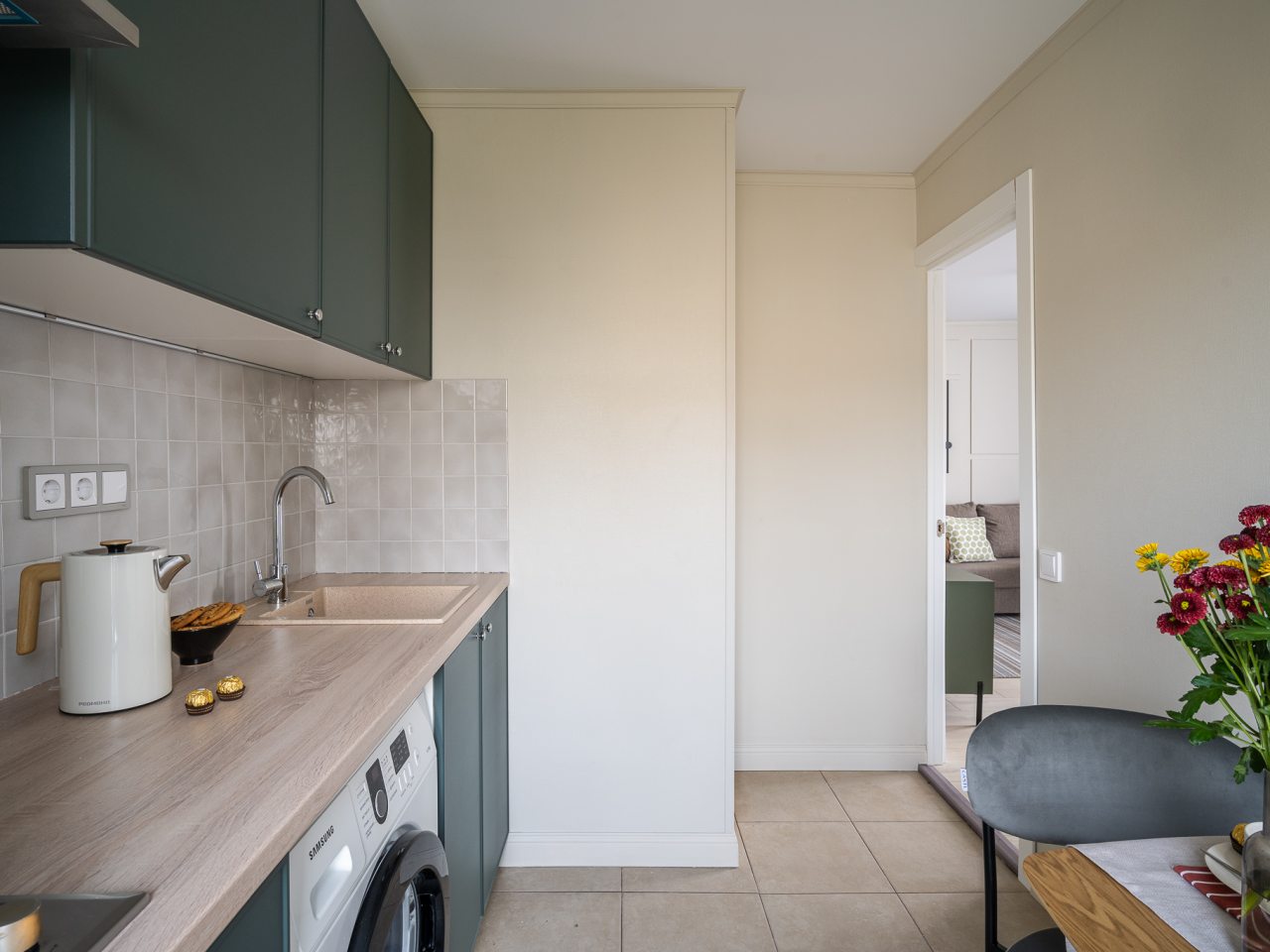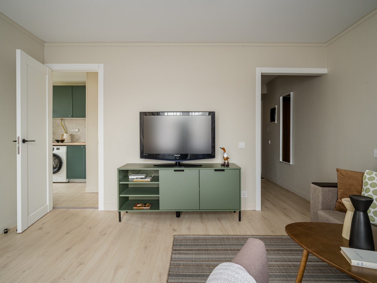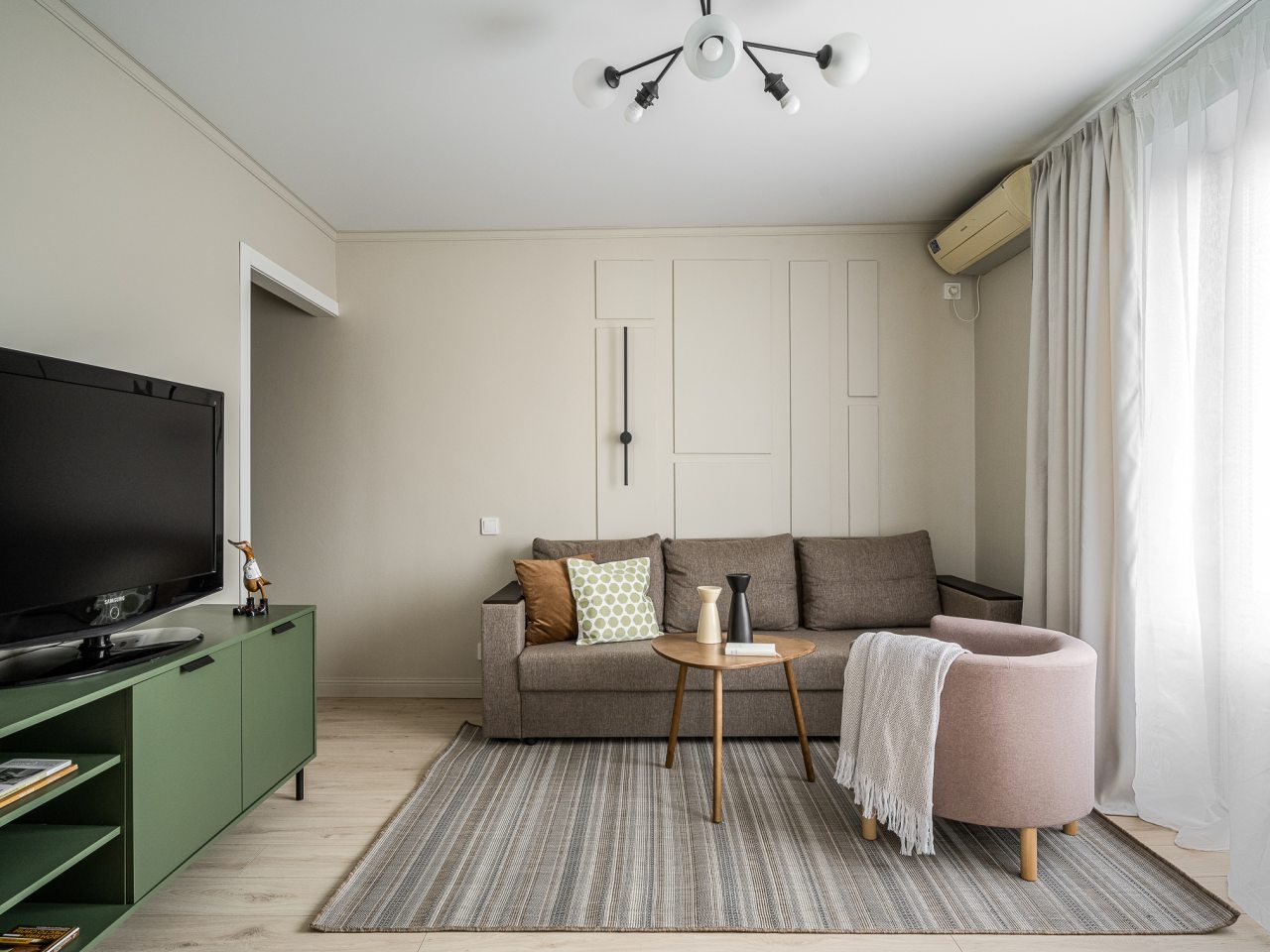 Квартира выполнена в мятно-зеленой гамме с выходом на балкон, откуда видны городские здания. К удобствам гостей имеется двуспальная кровать, диван, телевизор, кондиционер. Чтобы гости всегда оставались на связи подключен бесплатный Wi-fi. В ванной комнате приготовлено полотенце.