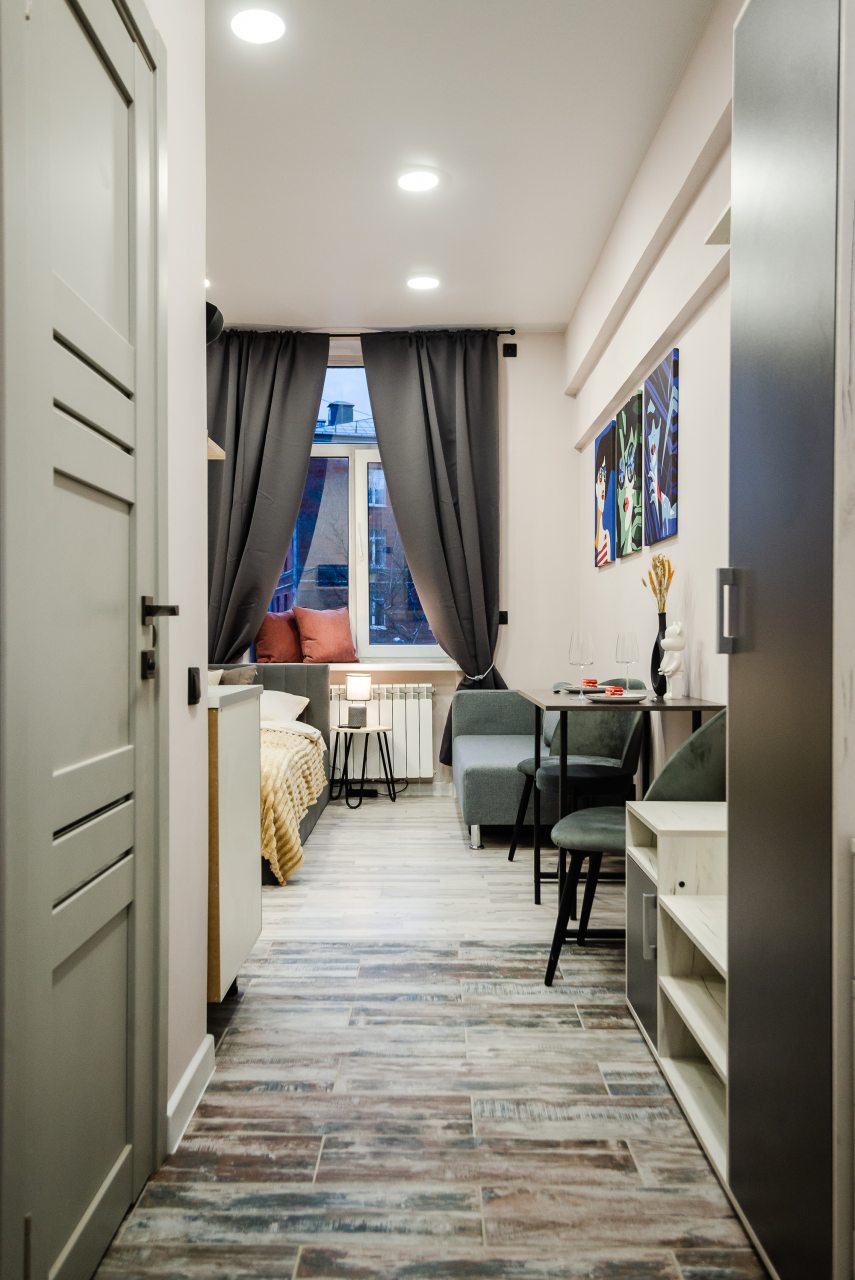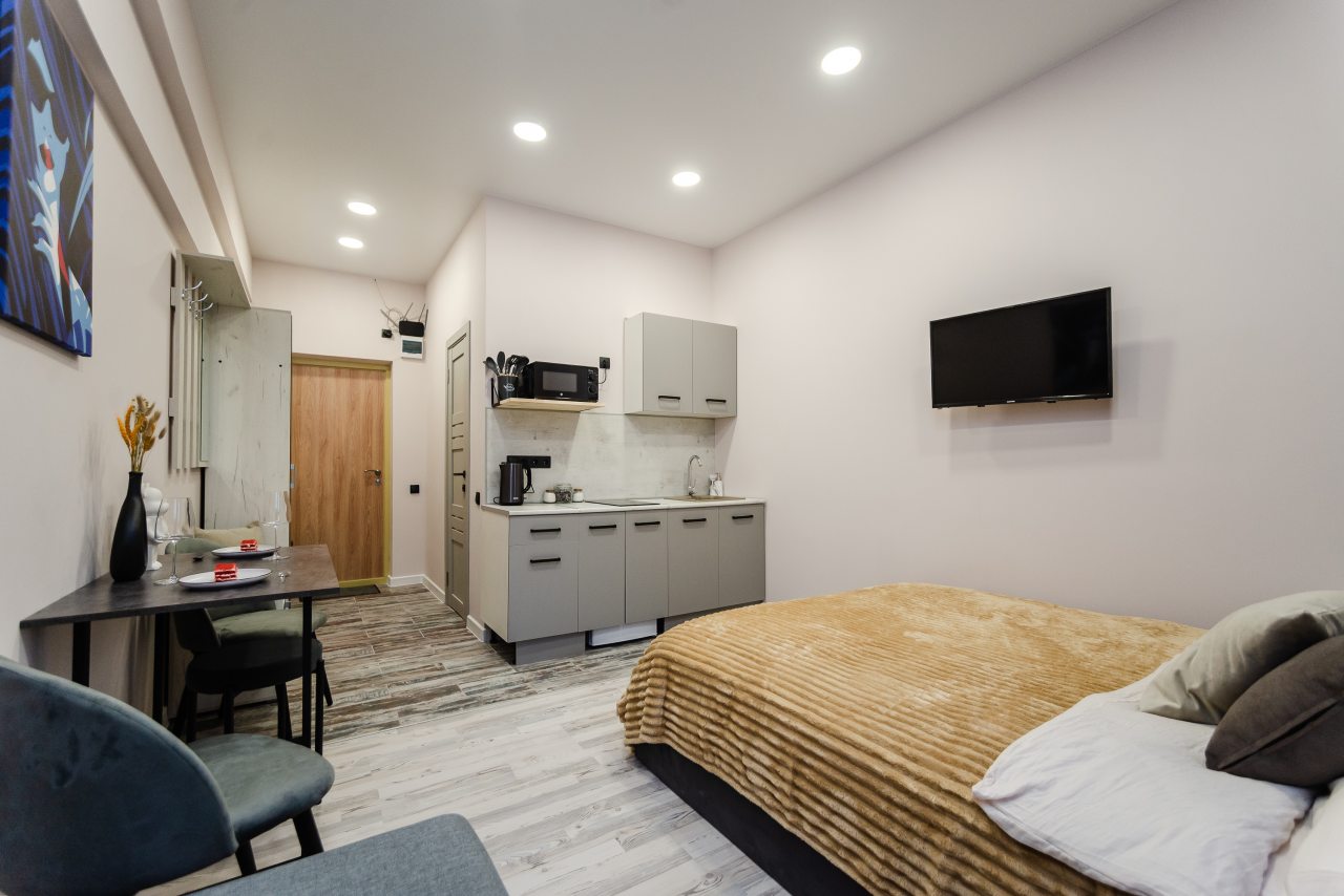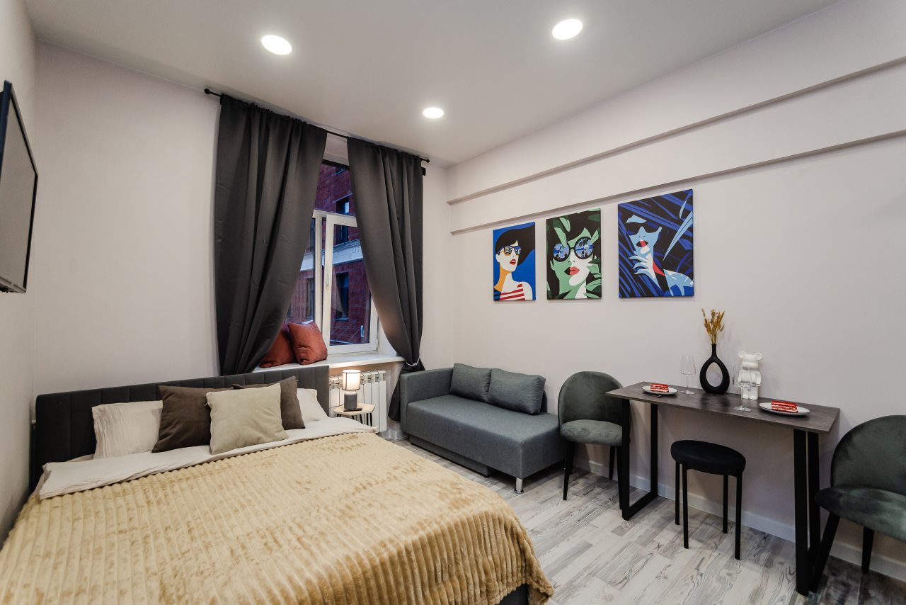 Это уютная двухуровневая студия с современным оформлением, в которой есть двуспальная кровать, раскладной диван, система «теплый пол», телевизор, подключение к Wi-Fi. В ванной комнате установлена стиральная машина, прилагаются гигиенические принадлежности, набор полотенец.