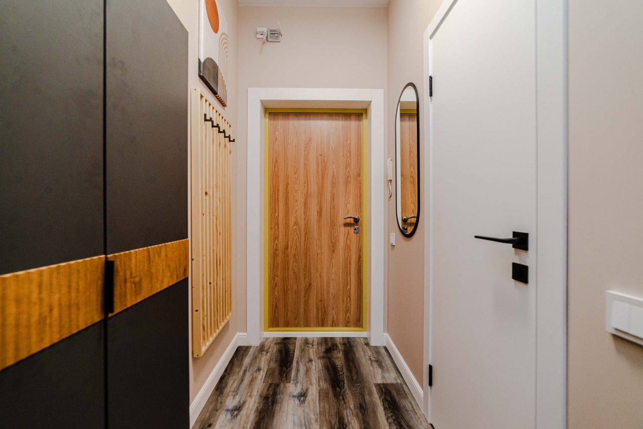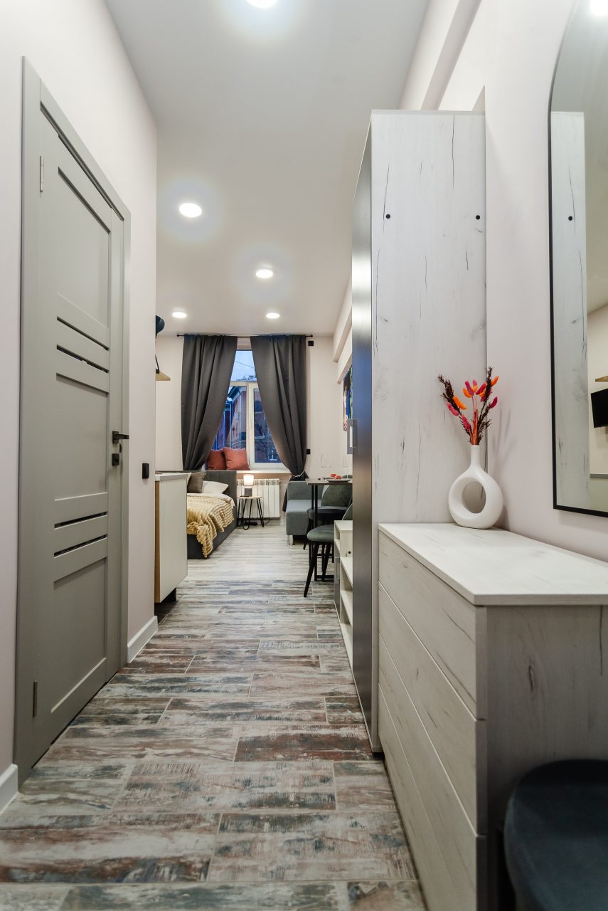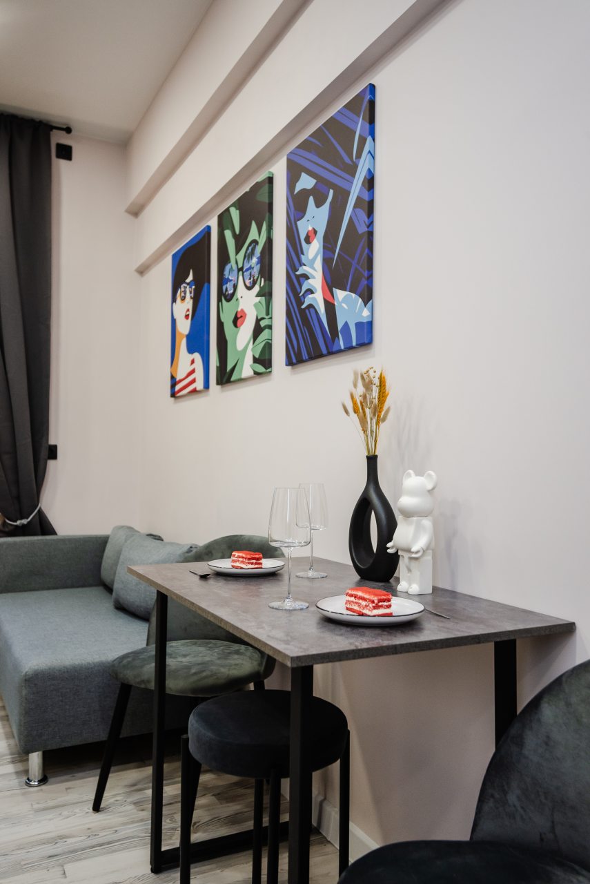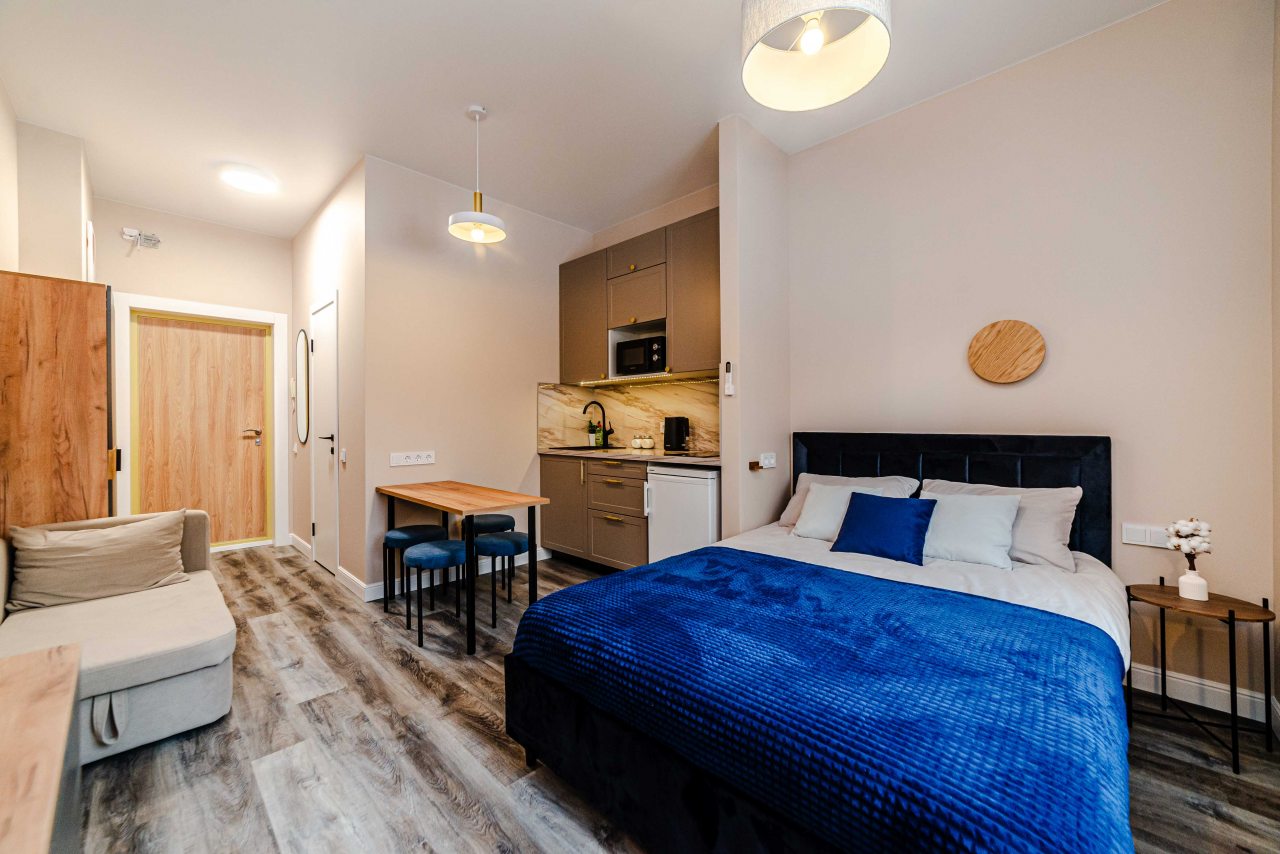 Это уютная двухуровневая студия с современным оформлением, в которой есть двуспальная кровать, раскладной диван, система «теплый пол», телевизор, подключение к Wi-Fi. В ванной комнате установлена стиральная машина, прилагаются гигиенические принадлежности, набор полотенец.