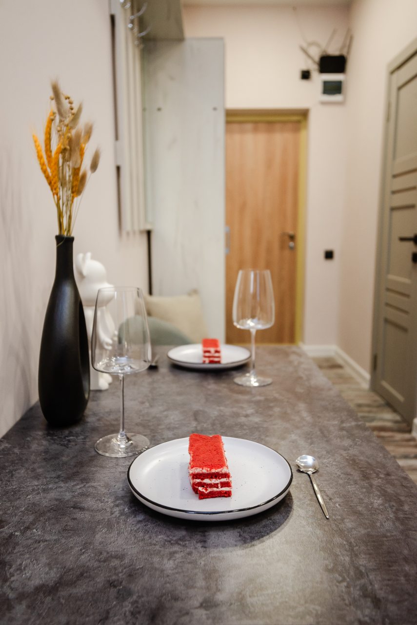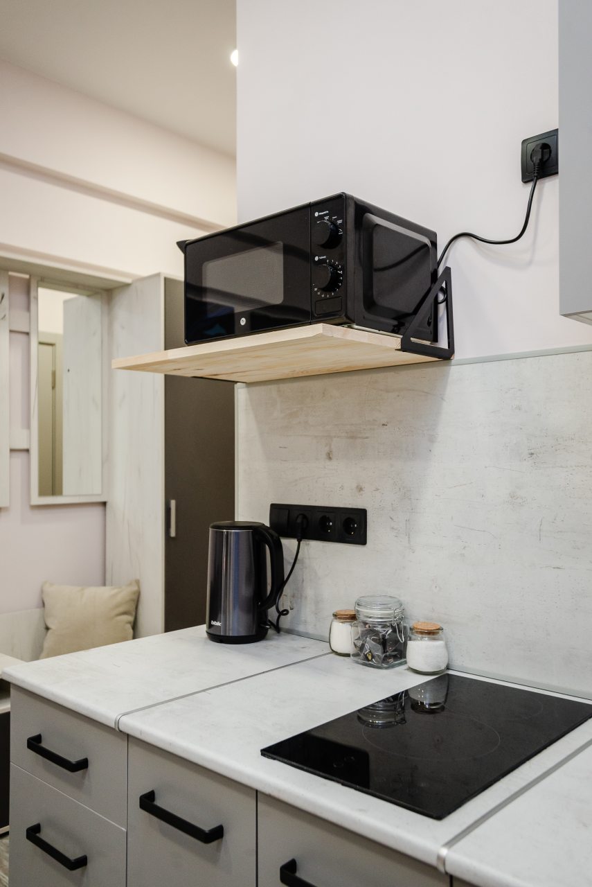 На кухне имеется такая техника и мебель, как СВЧ-печь, электрическая плита, чайник, холодильник, обеденный стол. Кофе, чай, посуда и столовые приборы в наличии для использования. В окрестностях работают кофейни, заведения питания, супермаркеты.