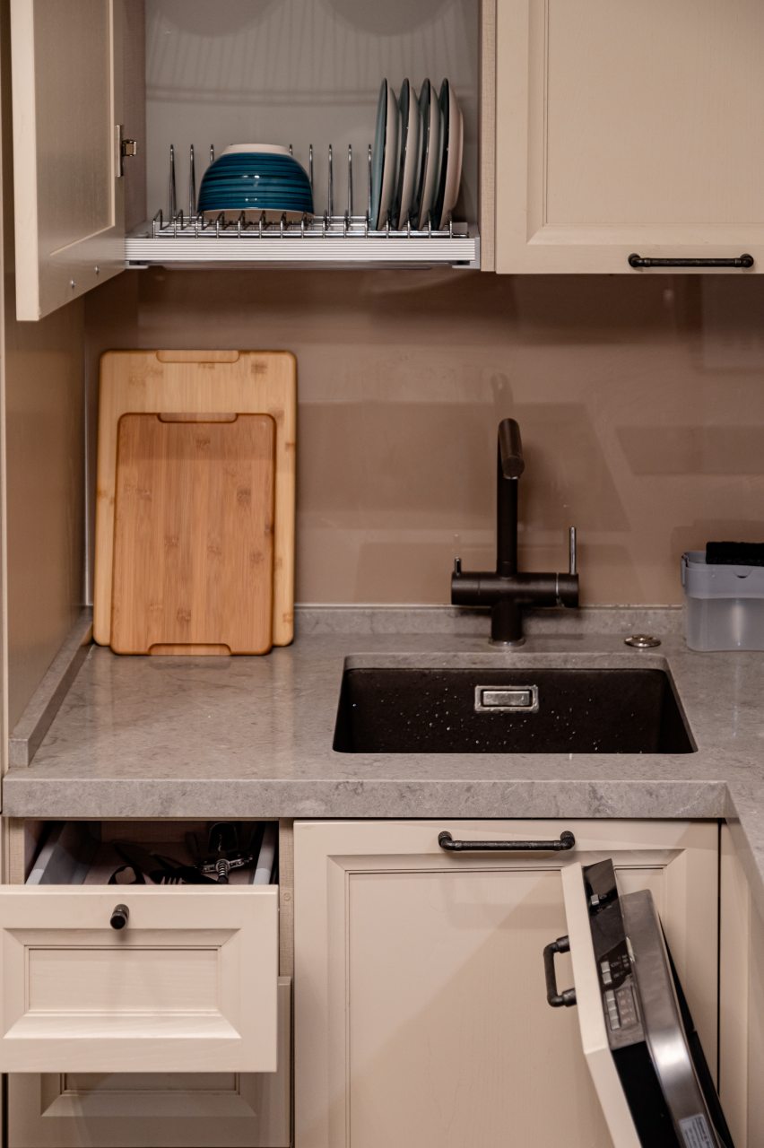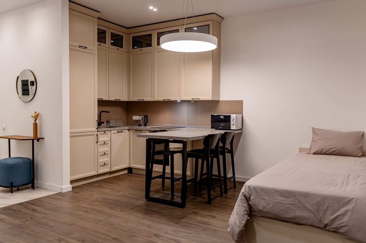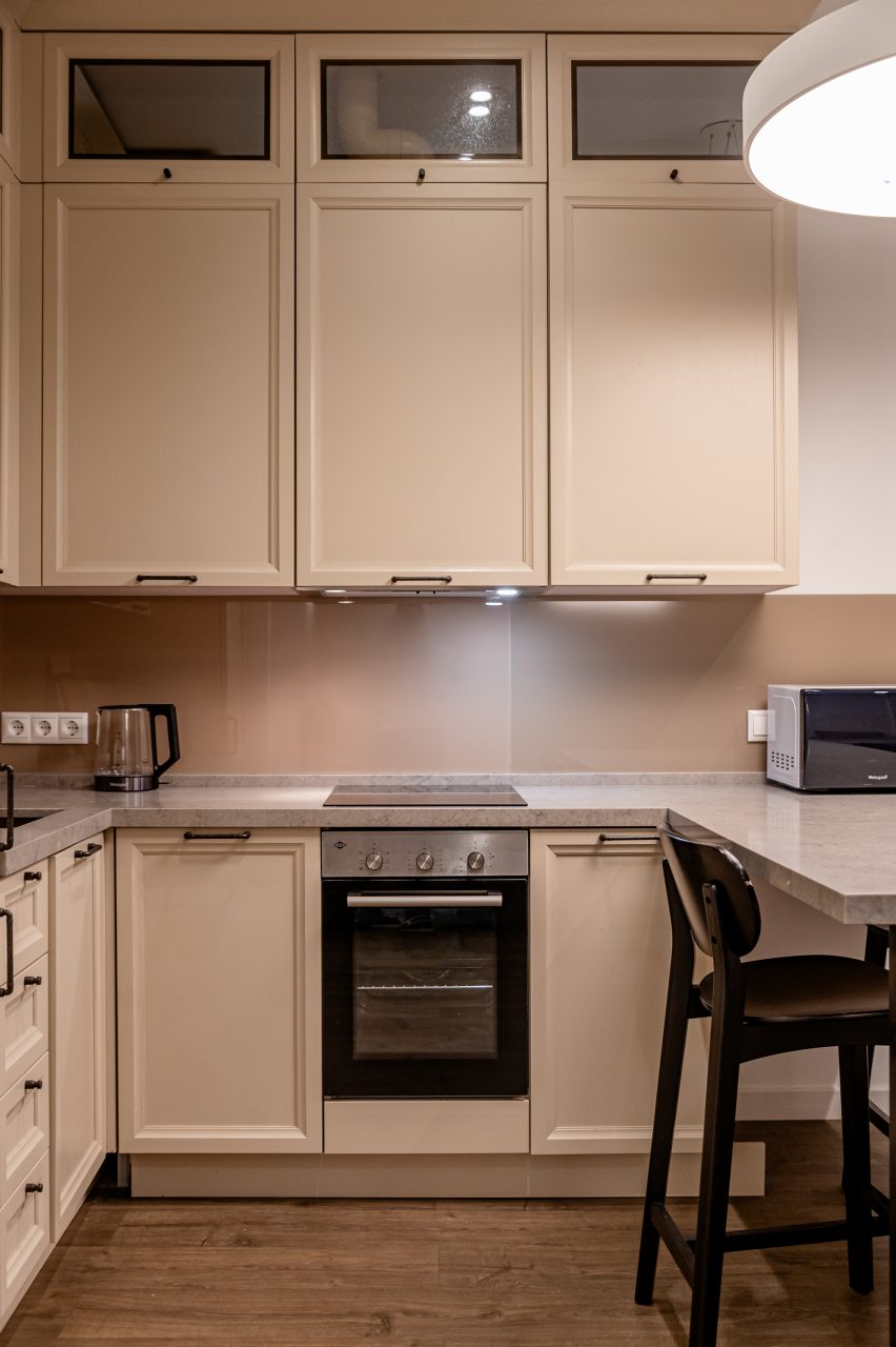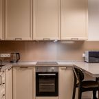 Кухонная зона имеет комплект стильного гарнитура, электроплиту, микроволновую печь, электрочайник, духовой шкаф, холодильник. Пообедать можно в ближайшем кафе.