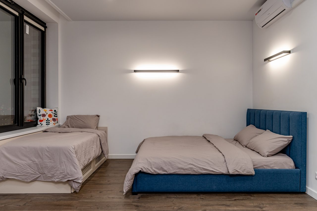 Уютные апартаменты оснащены удобными спальными местами, розетками возле кровати, кондиционером, телевизором с онлайн-кинотеатром КиноПоиск HD, wi-fi, гардеробной и др. Санузел укомплектован современной сантехникой, средствами личной гигиены, полотенцесушителем, стиральной машиной и гигиеническим душем.