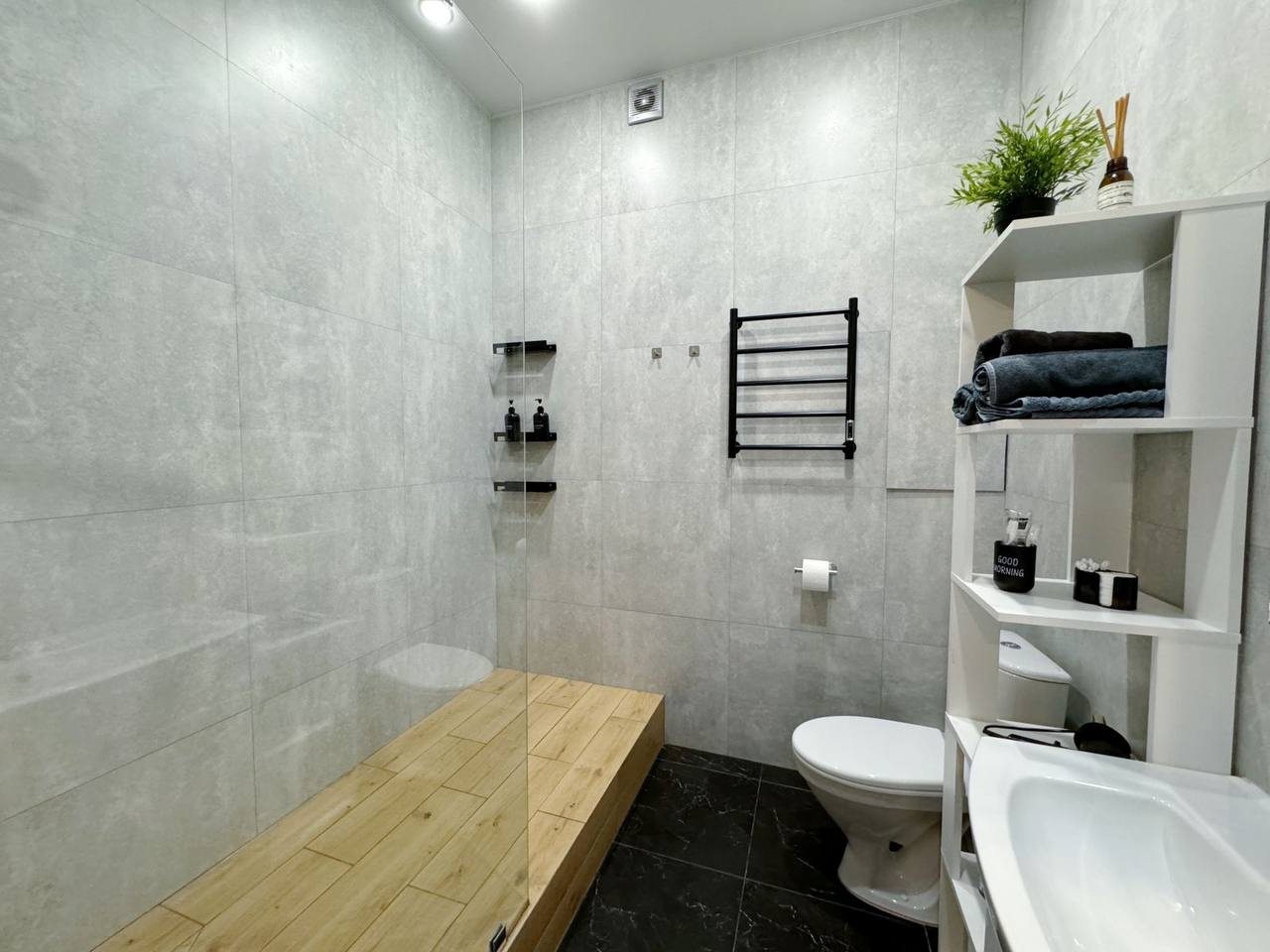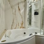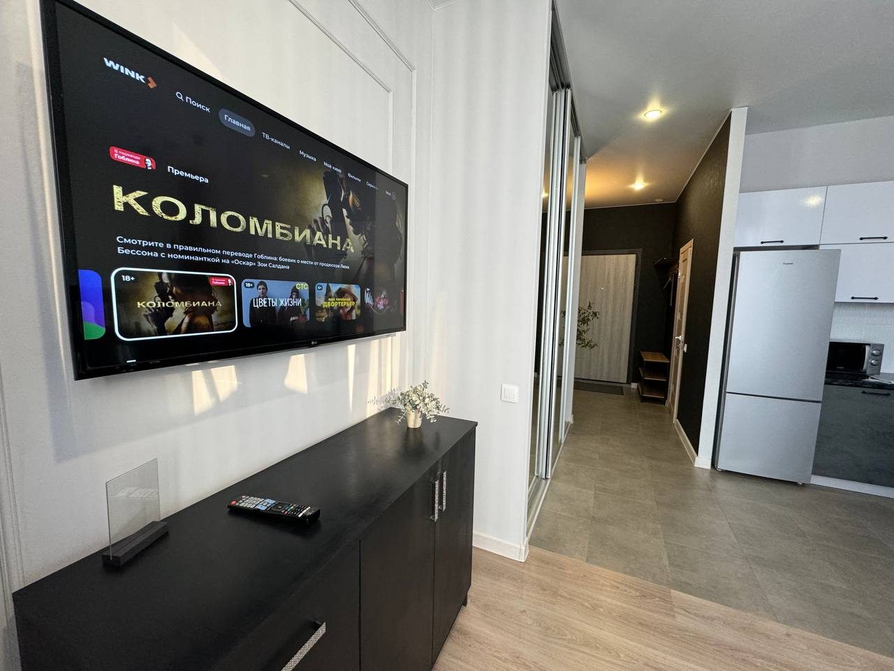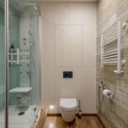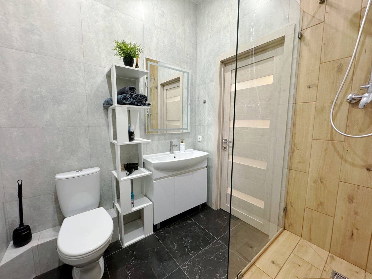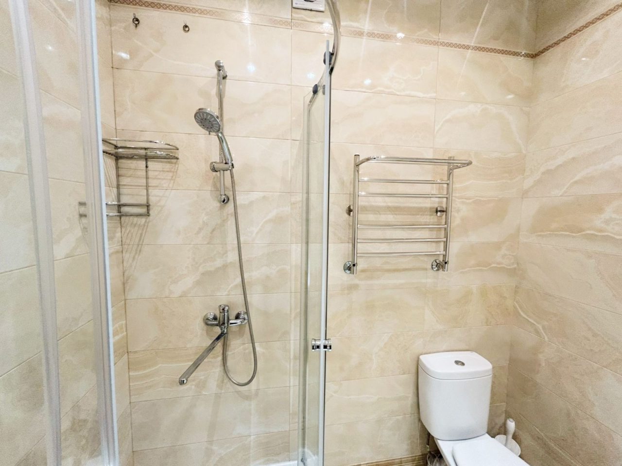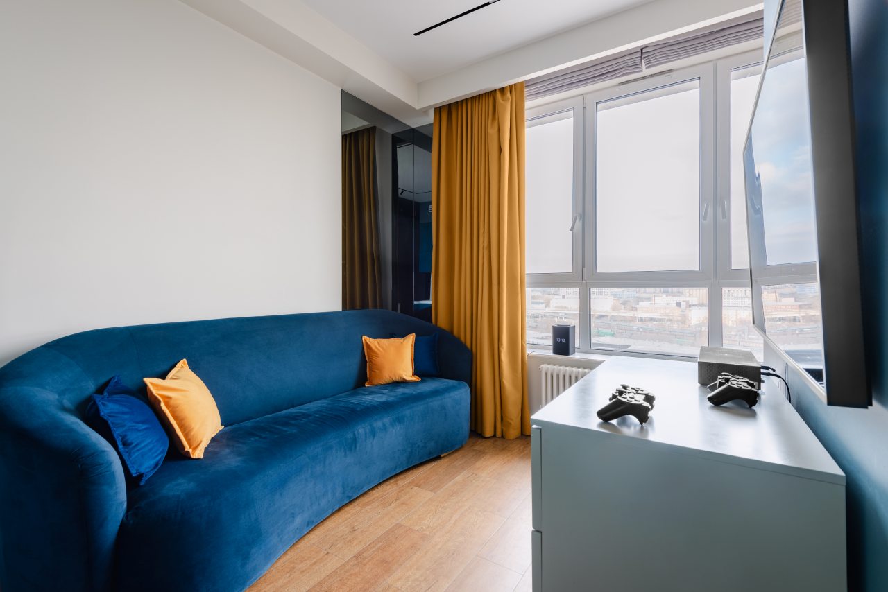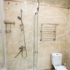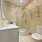 В апартаментах есть: ЖК-телевизор с игровой приставкой, комод, диван, кровать, отдельная ванная комната с душевой кабиной, туалетом и раковиной.
