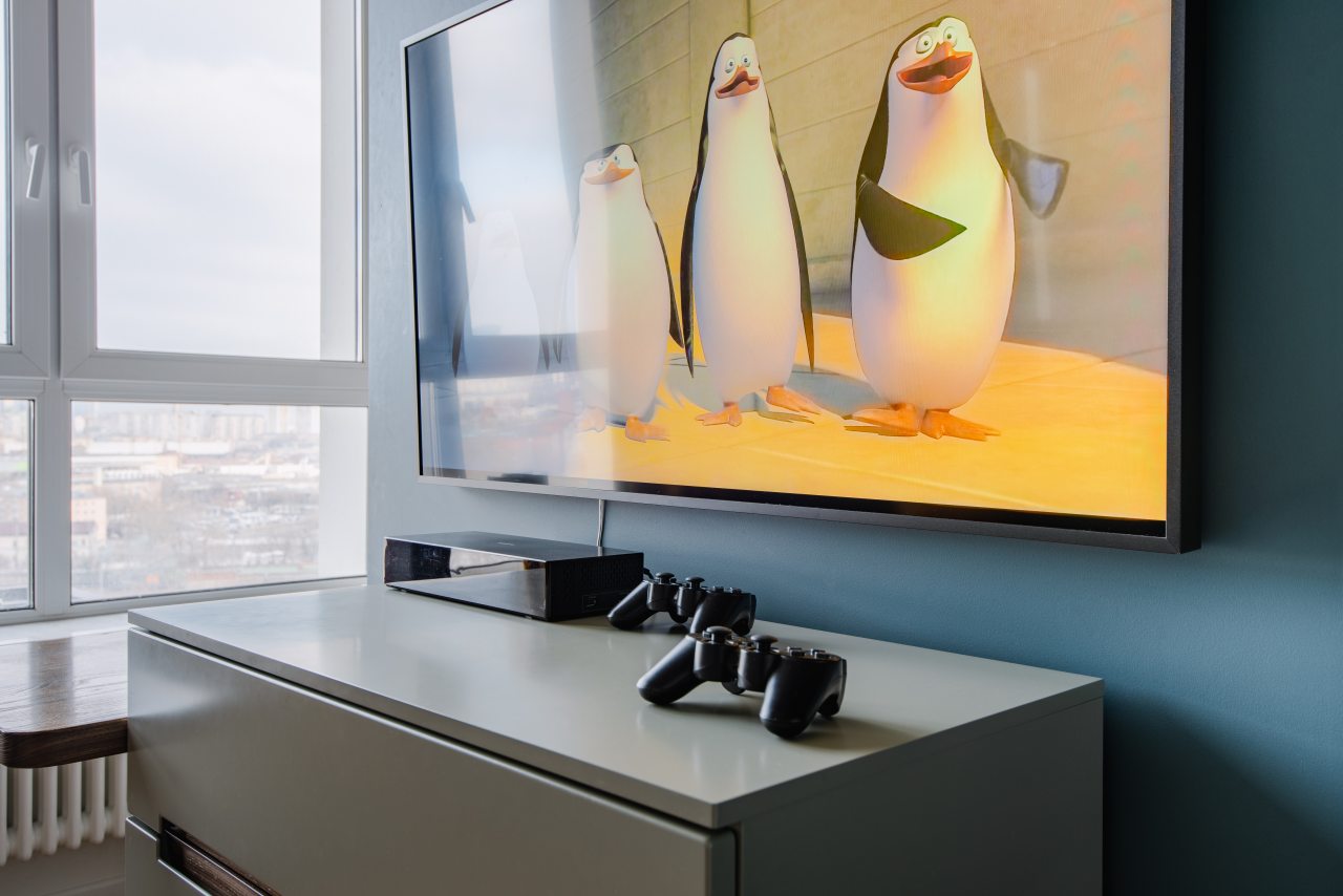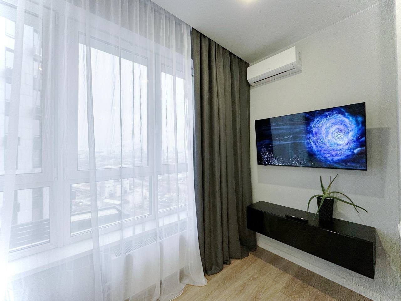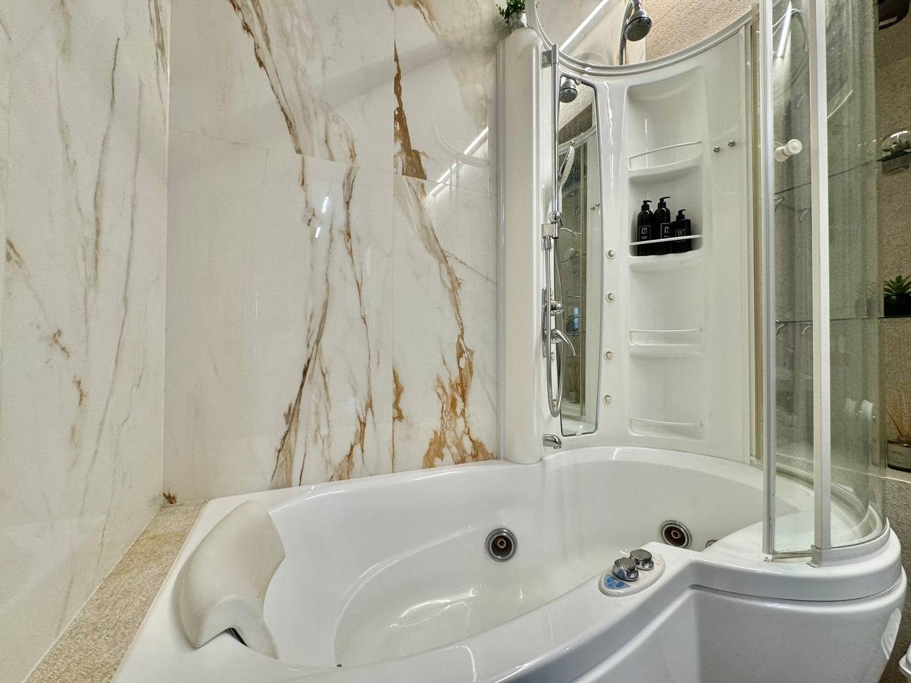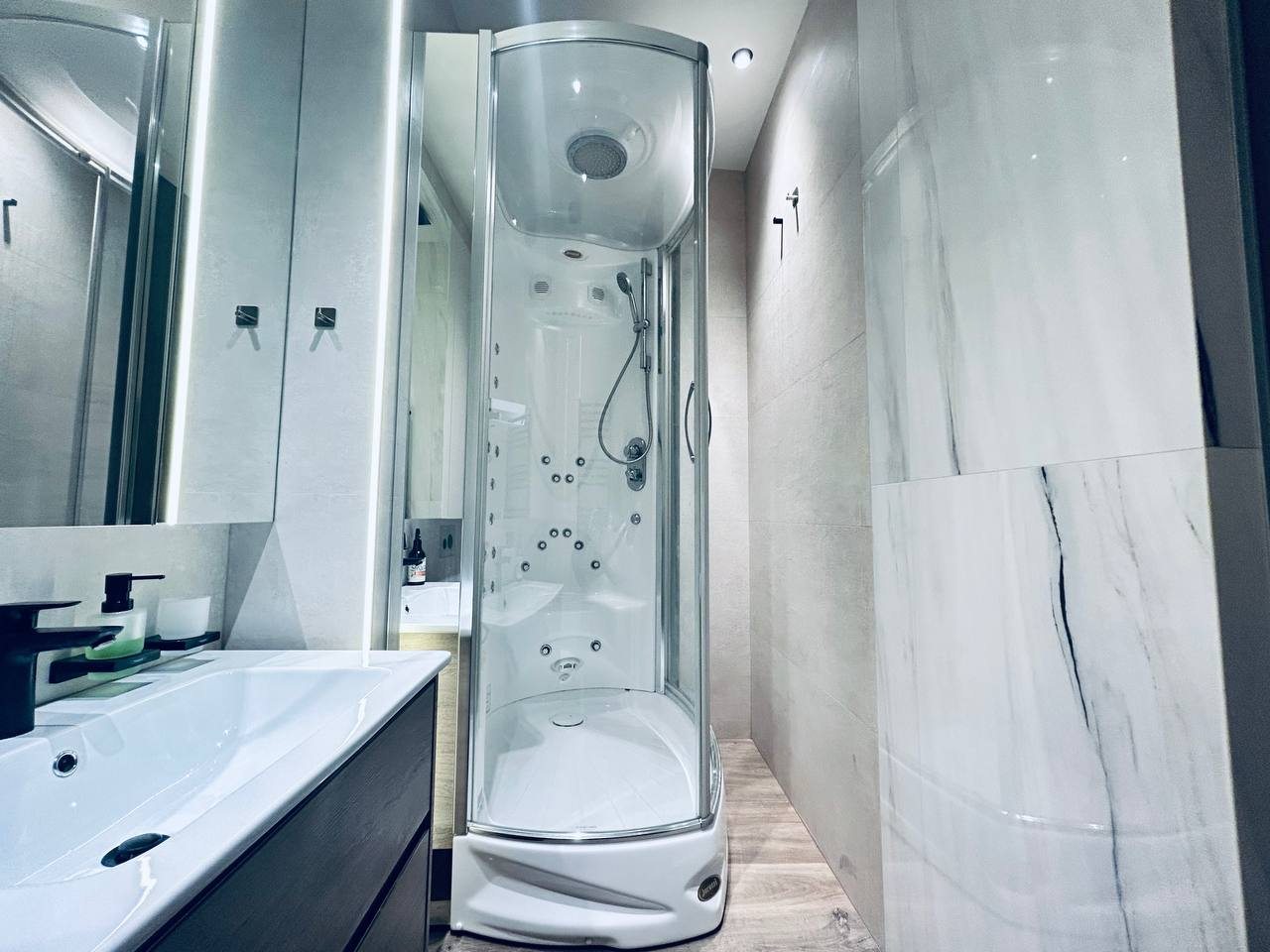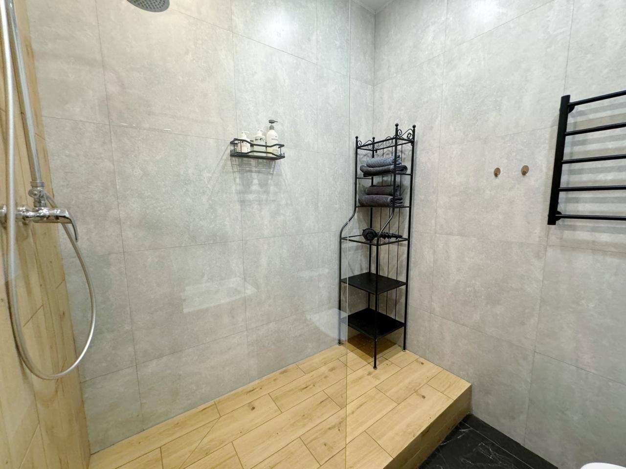 В апартаментах есть: ЖК-телевизор с игровой приставкой, комод, диван, кровать, отдельная ванная комната с душевой кабиной, туалетом и раковиной.