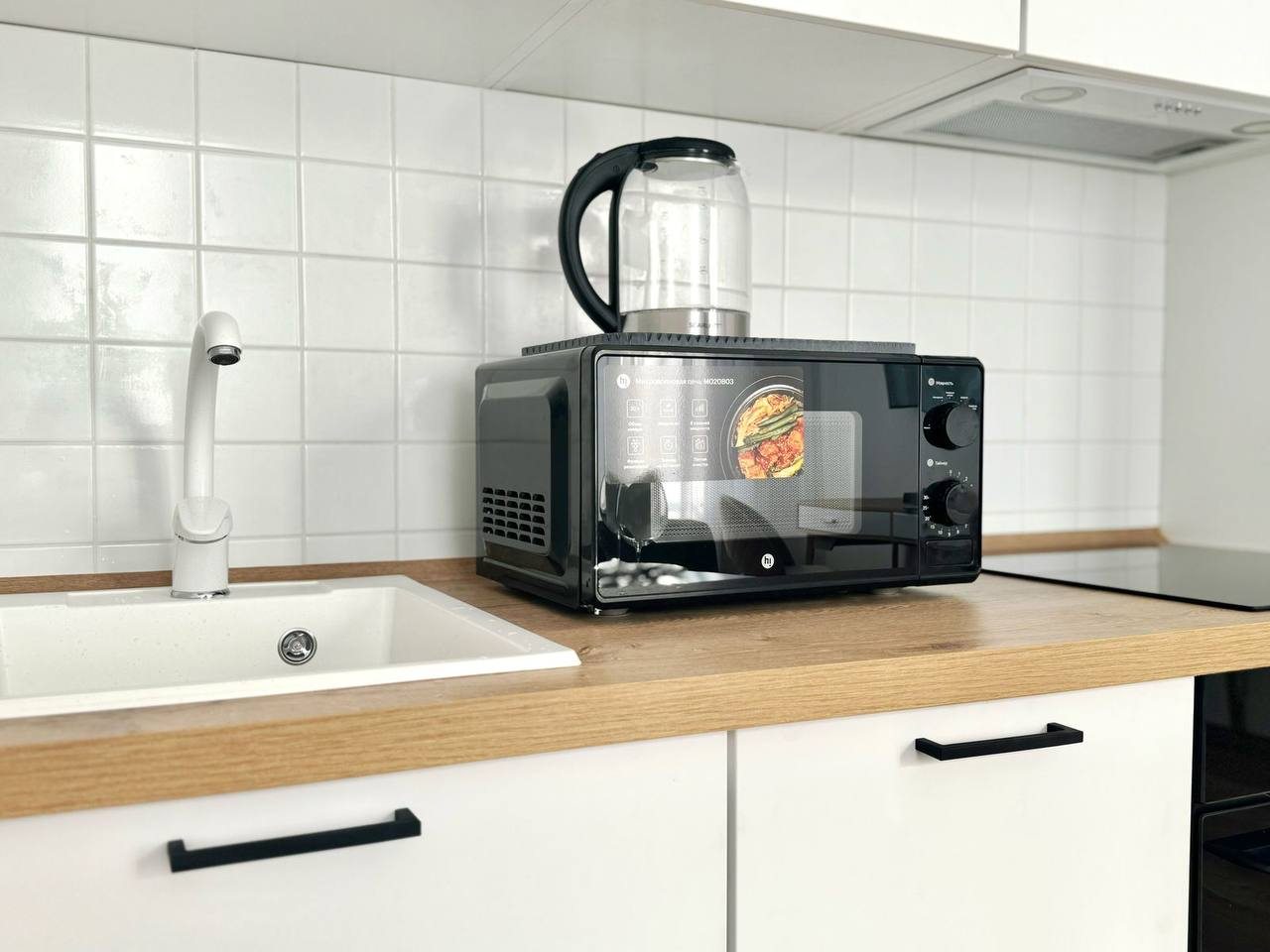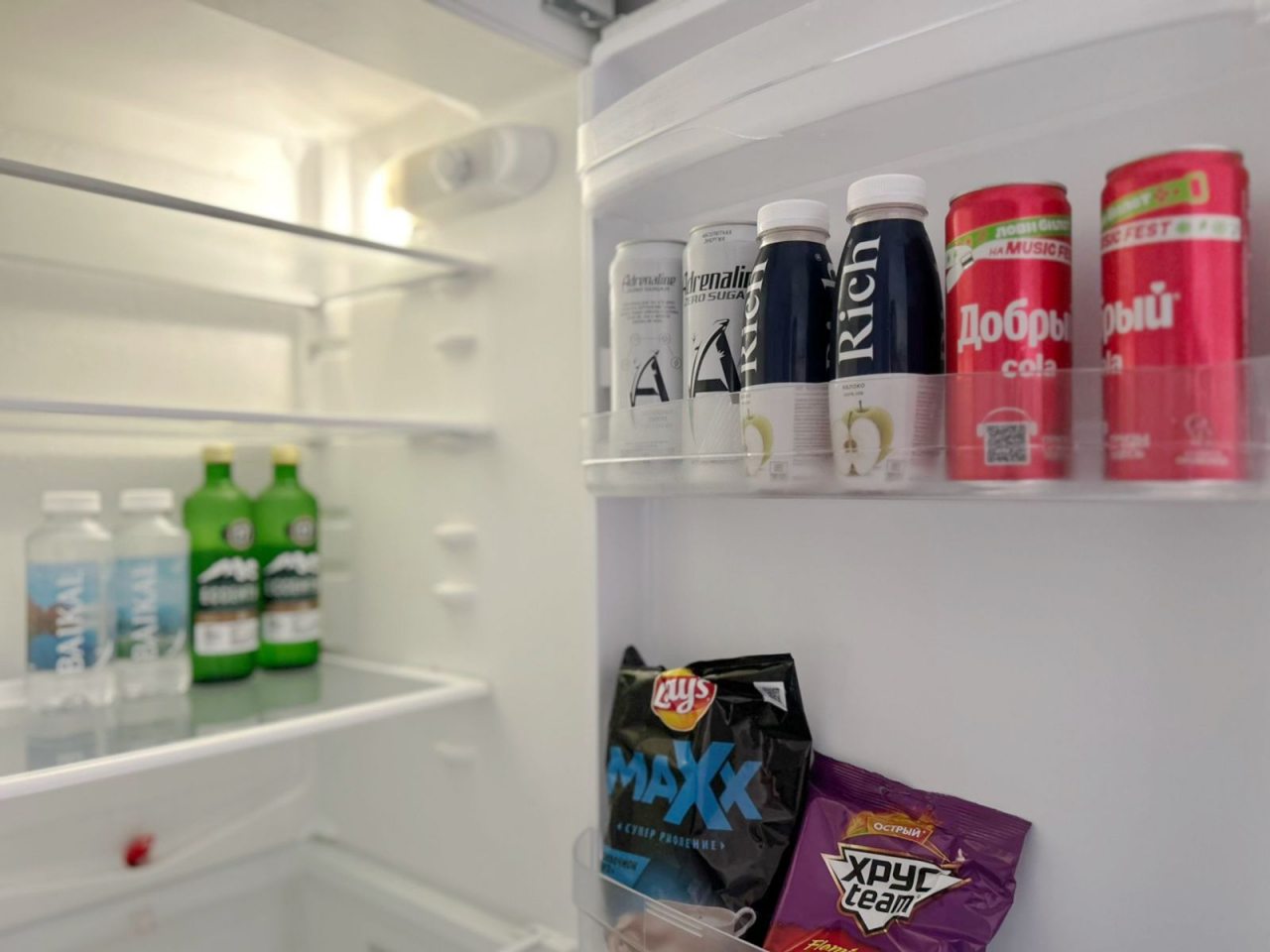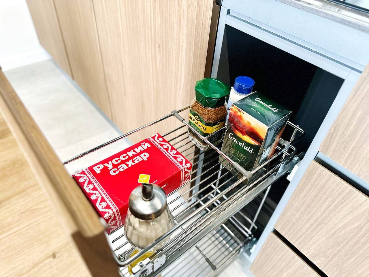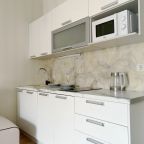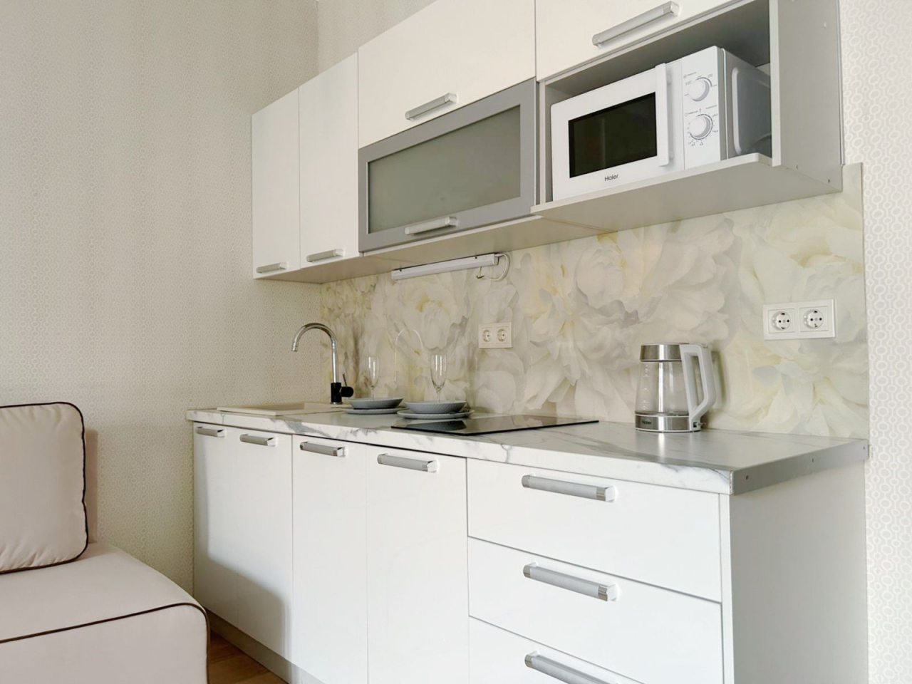 В небольшом кухонном уголке есть плита, электрочайник и холодильник. На территории ЖК работает пиццерия, ресторан вьетнамской кухни, кафе, кондитерская.