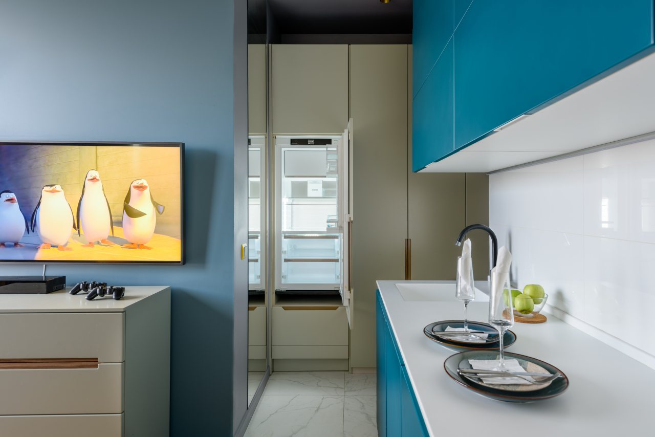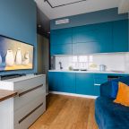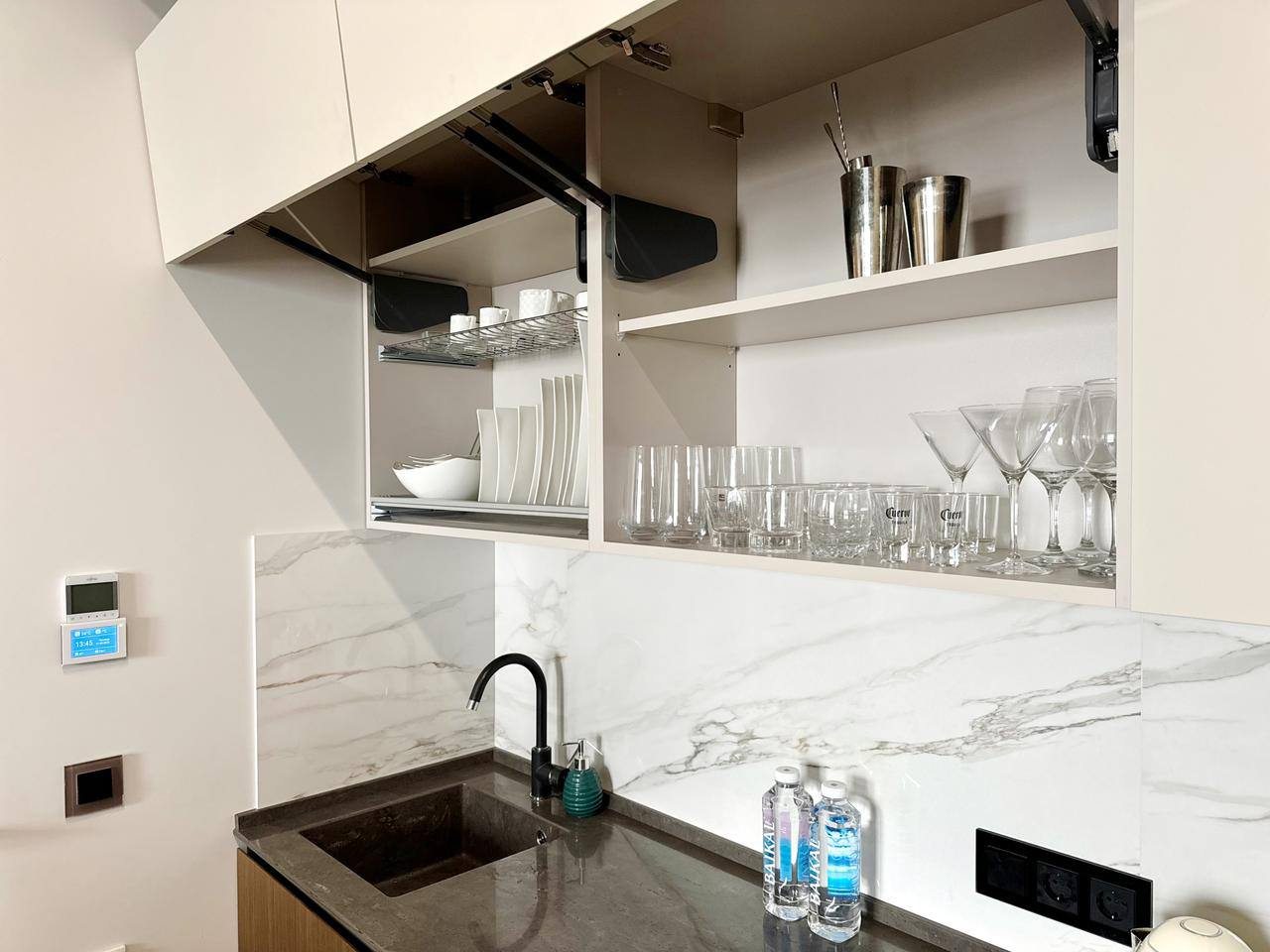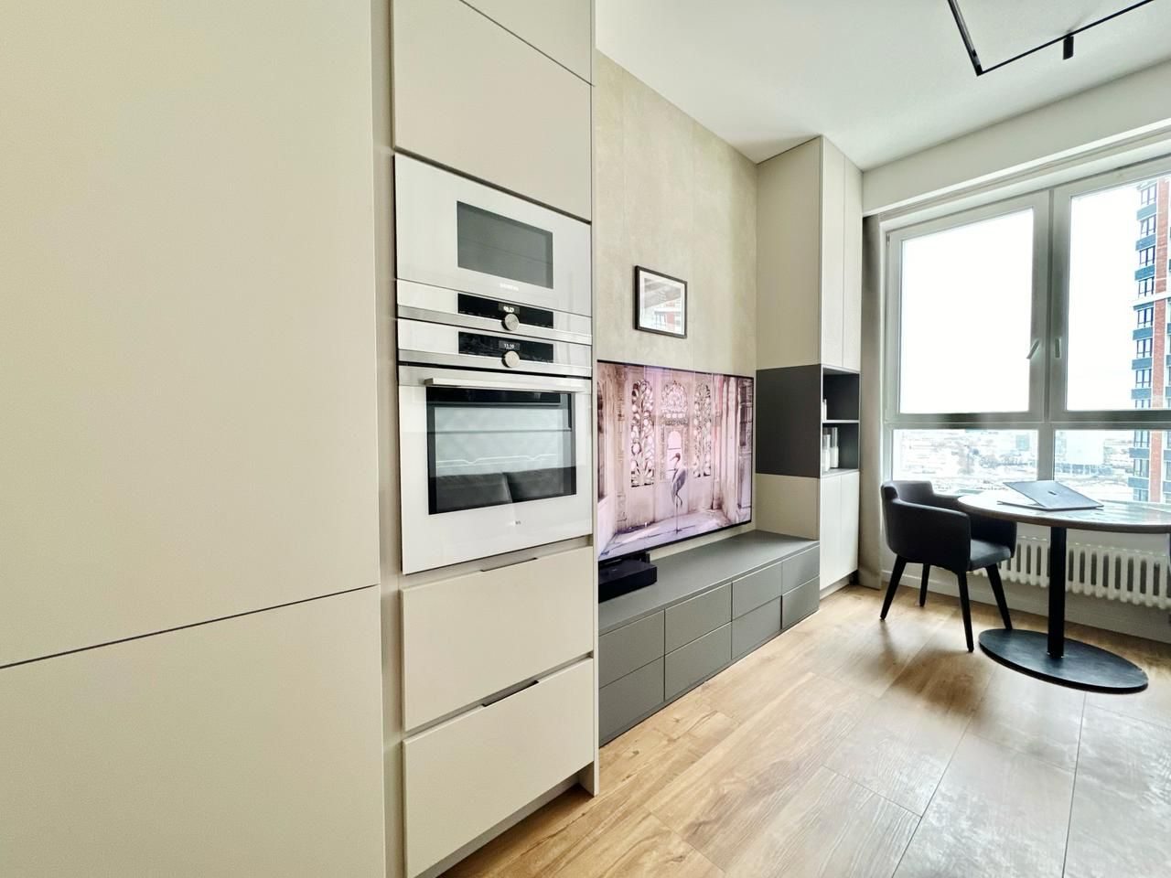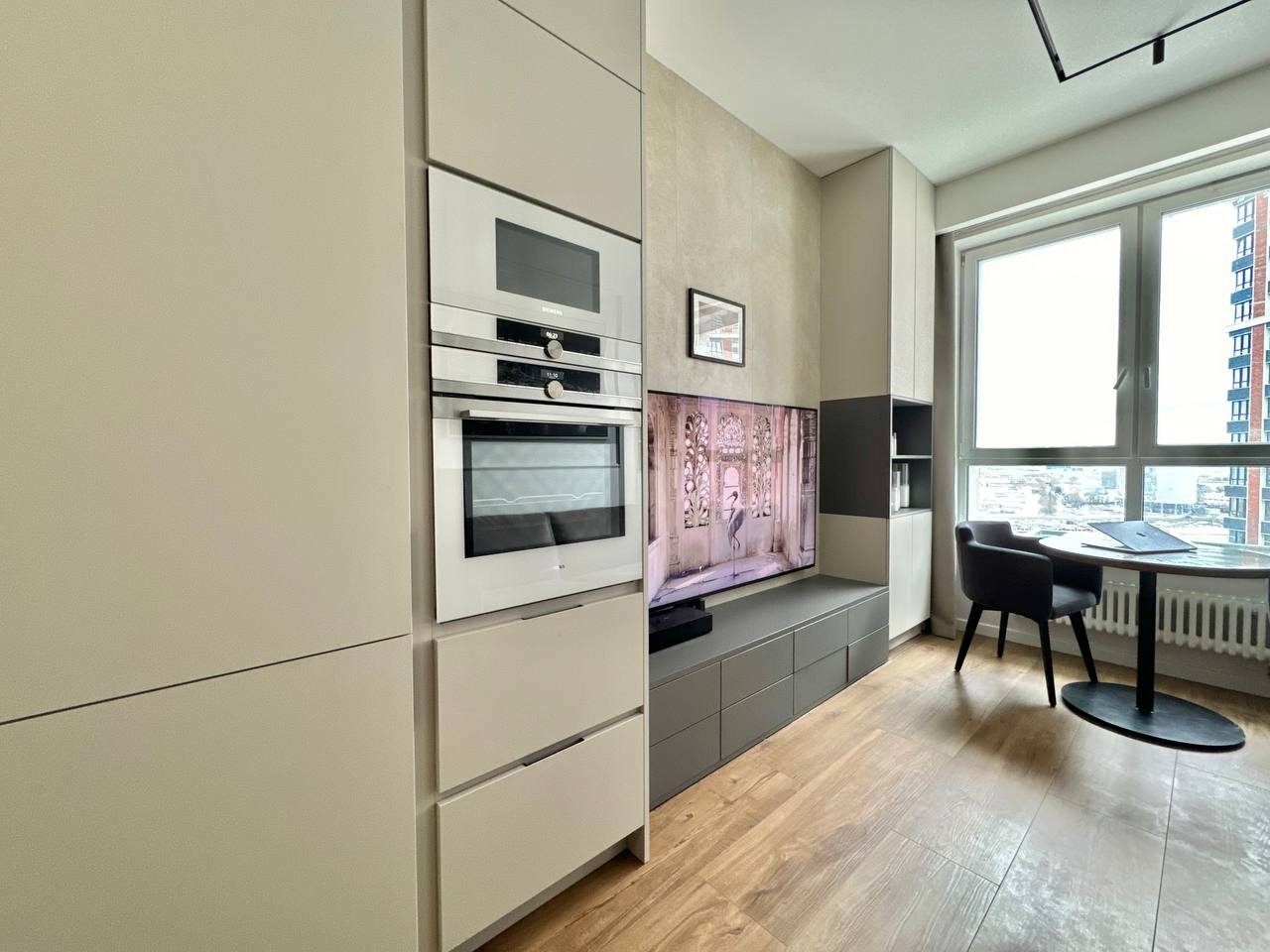 В небольшом кухонном уголке есть плита, электрочайник и холодильник. На территории ЖК работает пиццерия, ресторан вьетнамской кухни, кафе, кондитерская.