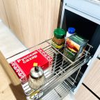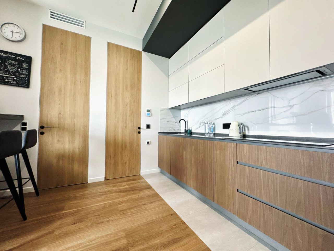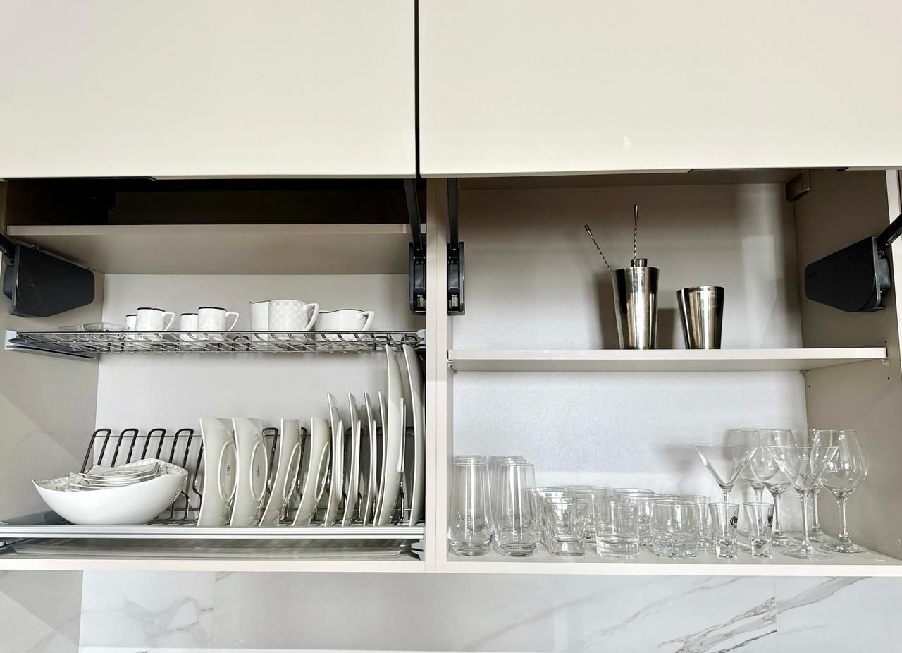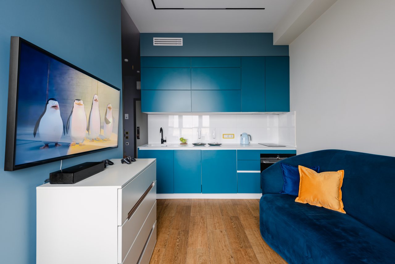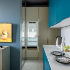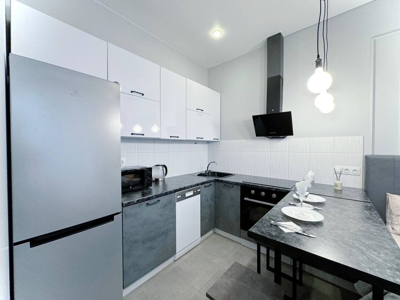 В небольшом кухонном уголке есть плита, электрочайник и холодильник. На территории ЖК работает пиццерия, ресторан вьетнамской кухни, кафе, кондитерская.