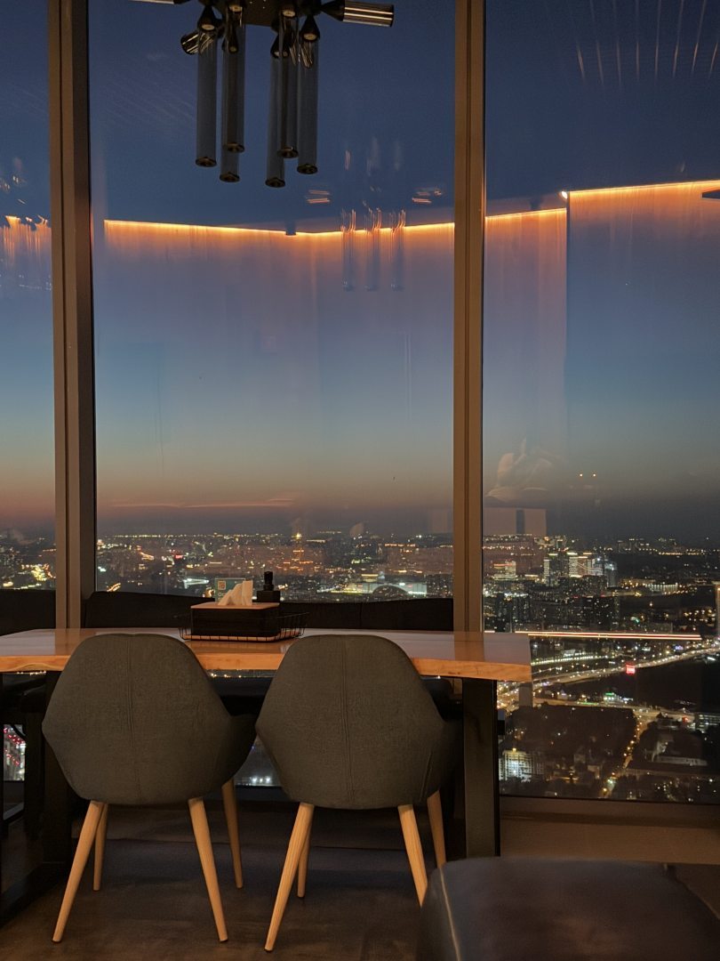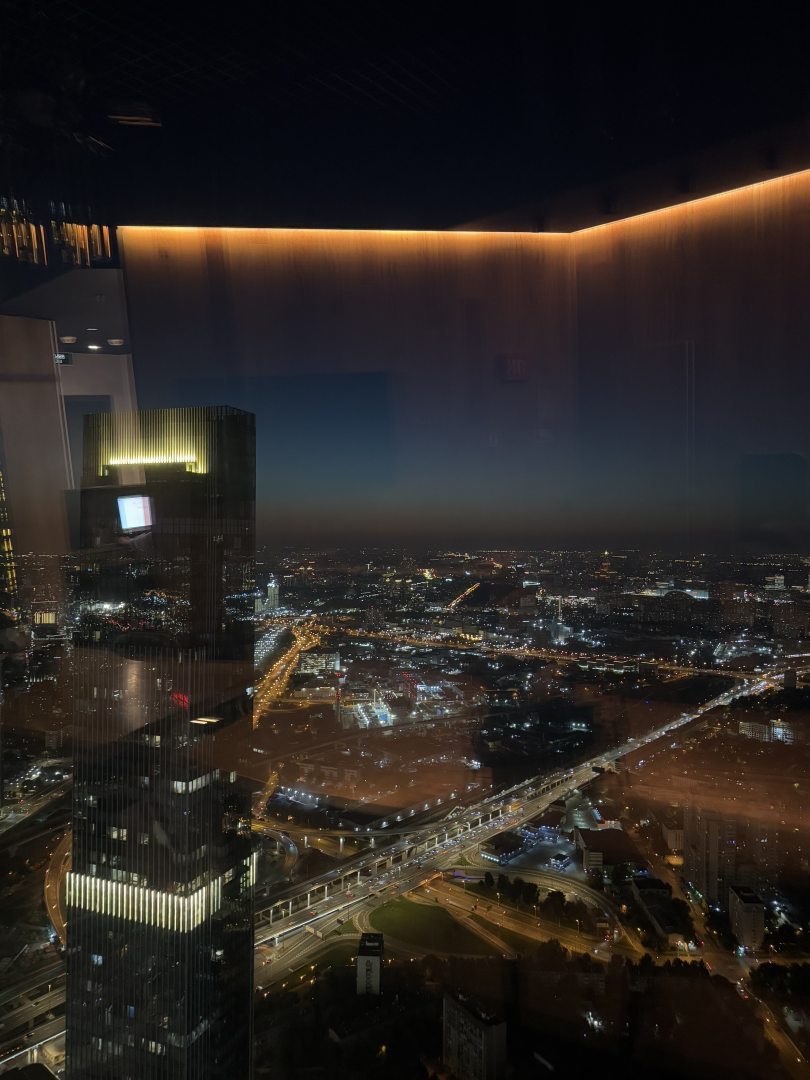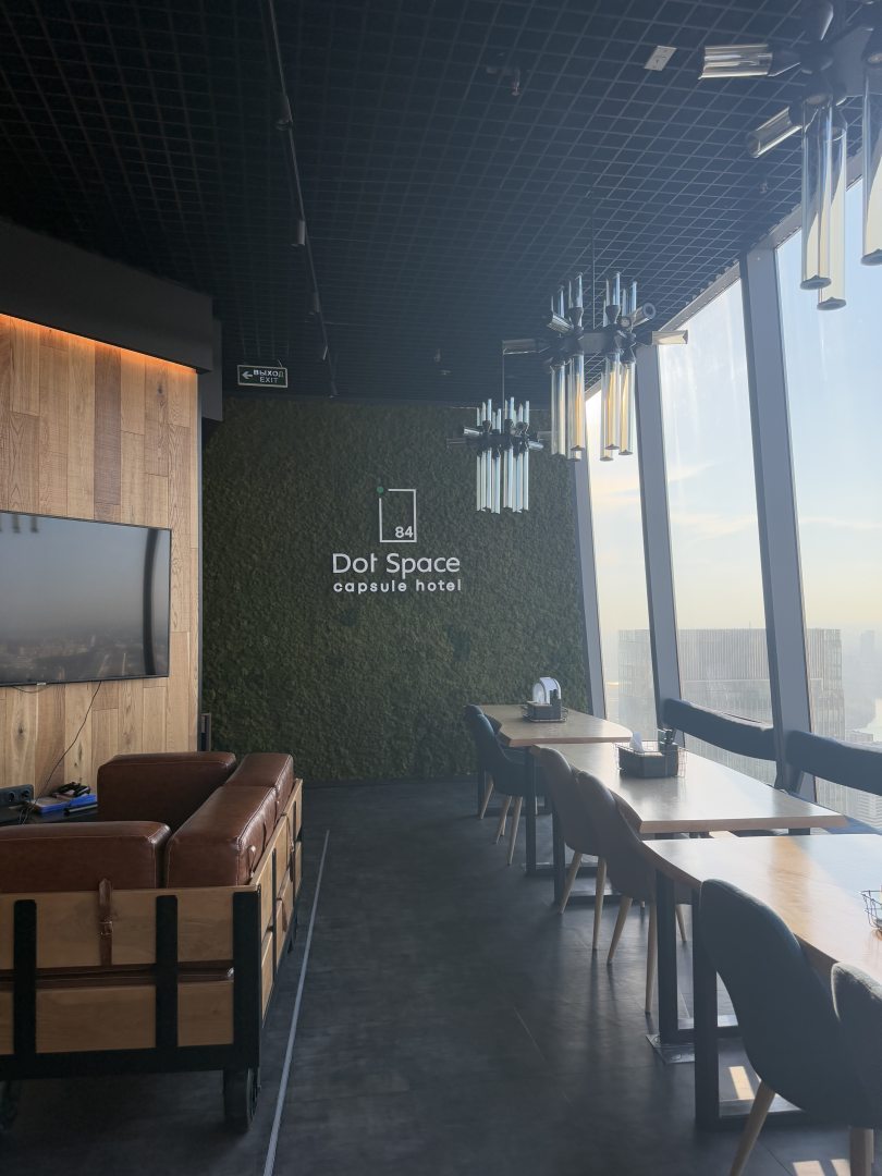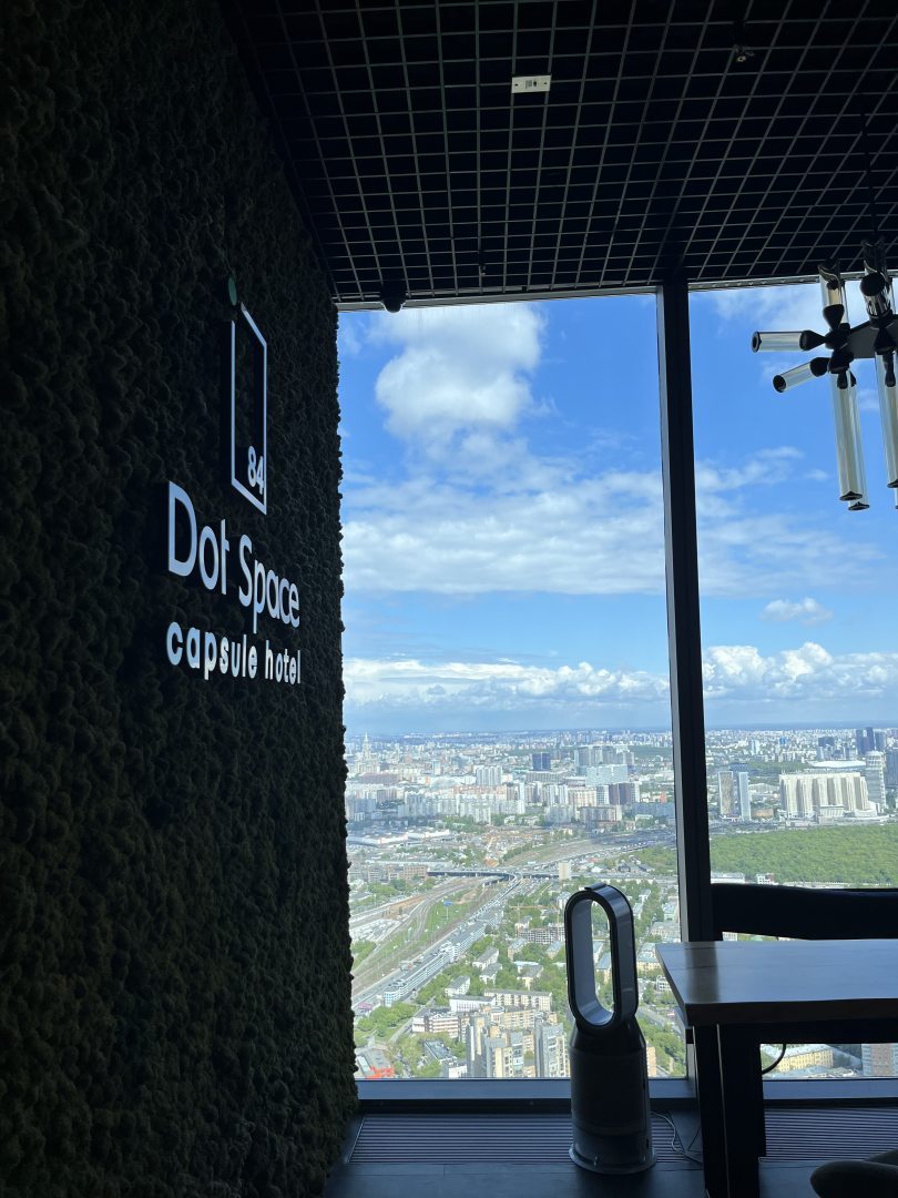 Красивый вид на Москву с 84 этажа. Сравнительно тихо. Удобная капсула с проходом и панорамным окном. Завтрак включен. Есть комната для хранения вещей.