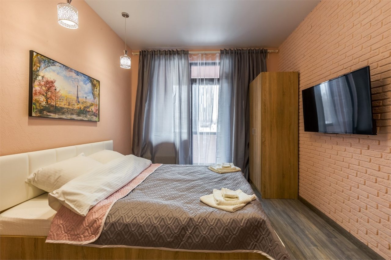 Апартаменты находятся в современном высотном доме. Здесь удобная планировка и качественный ремонт. Нам понравилась комплектация, как все обустроено. Пользоваться бытовой техникой, постельным бельем и прочими нужными вещами было удобно. Хороший душ со стеклянной перегородкой в санузле установлен. Вмонтирована под раковиной небольшая стиральная машина. По бытовым условиям все прекрасно. По расположению тоже, так как метро находится рядом.