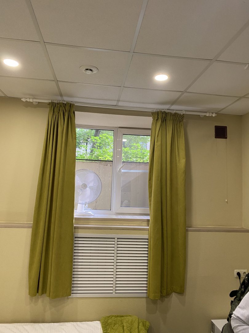 Вместо кондиционера - вентилятор, но нам он не понадобился. Холодильник маленький. но нам хватило. Есть возможность хранить продукты в большом холодильнике на общей кухне.