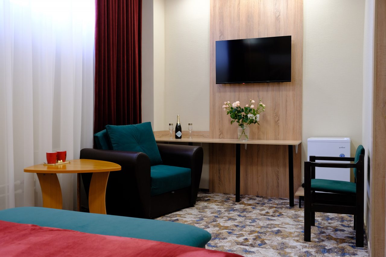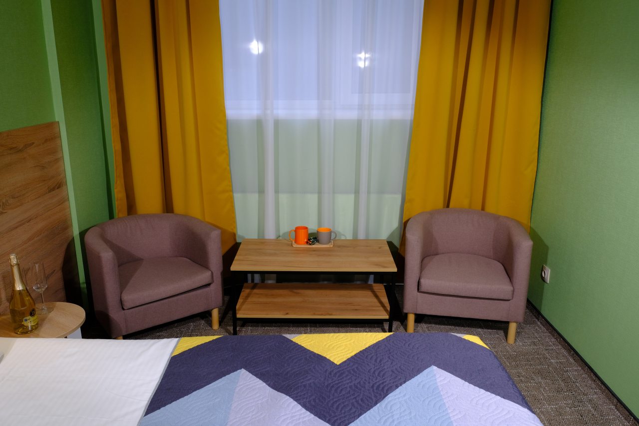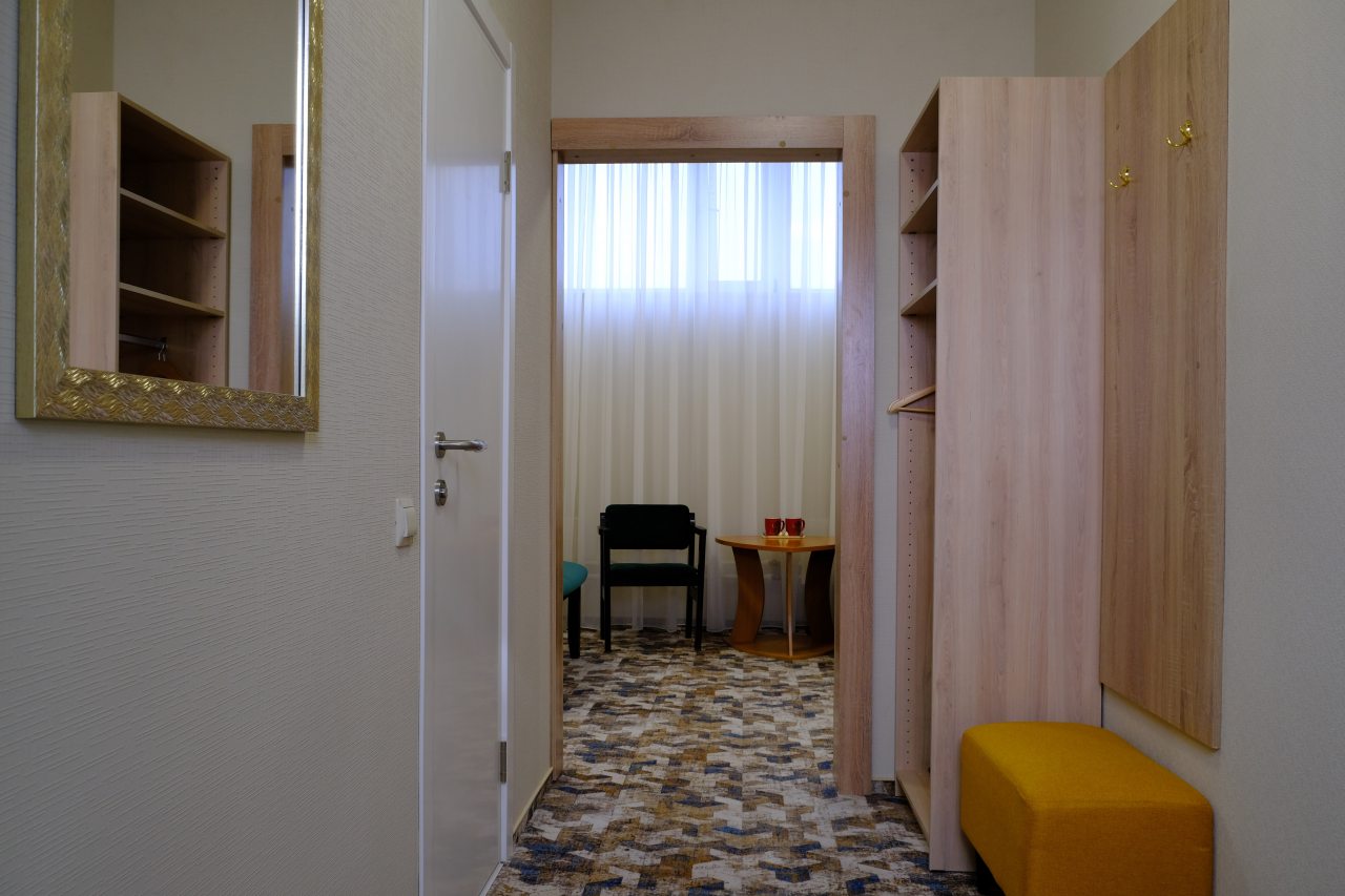 Отель расположен рядом с метро и торговыми центрами. Брали номер на четверых для семьи приятной неожиданностью было, что в номере две комнаты. Шкаф, стол и стулья, тв, холодильник.