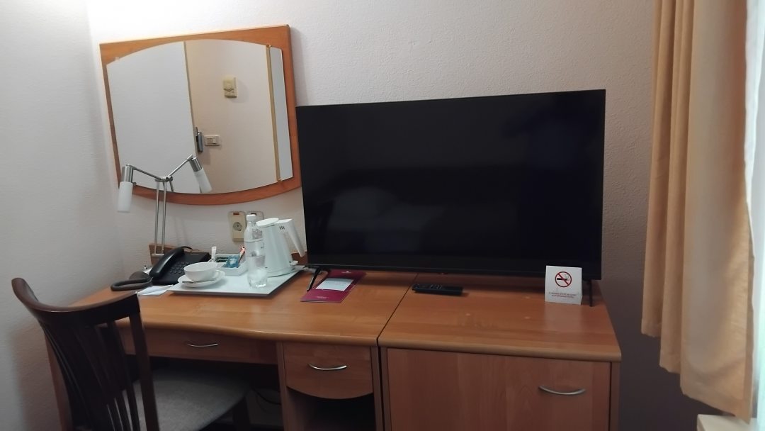 Останавливаемся в отеле второй раз. Снимали двухместный номер. Номер небольшой, но есть все необходимое: чайник, чай, кофе, сахар, питьевая вода 0.5, холодильник, телевизор, душевые принадлежности, фен. Цена-качество соответствует.