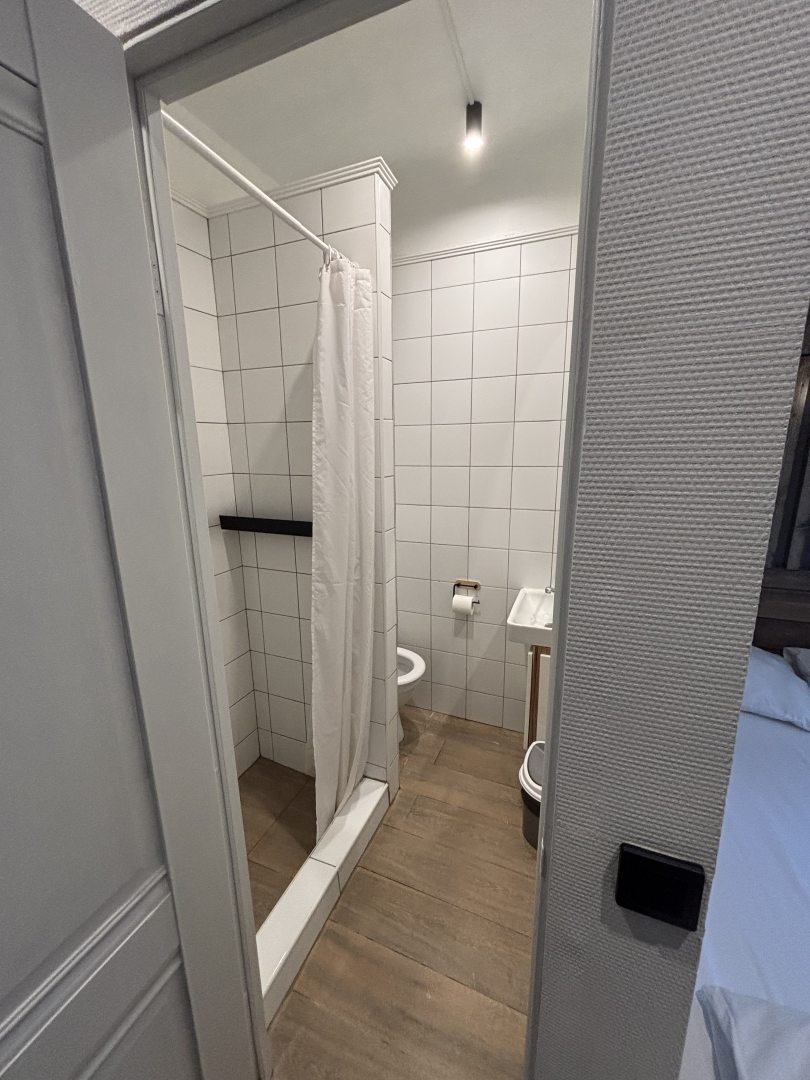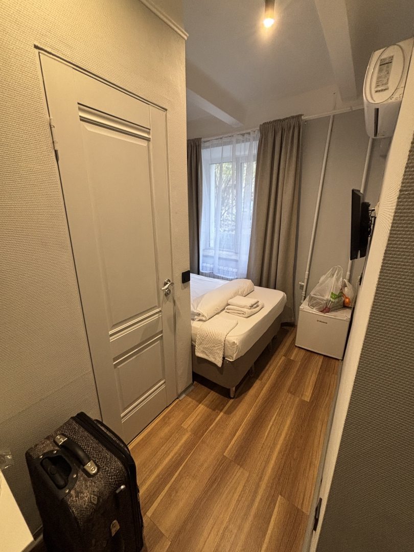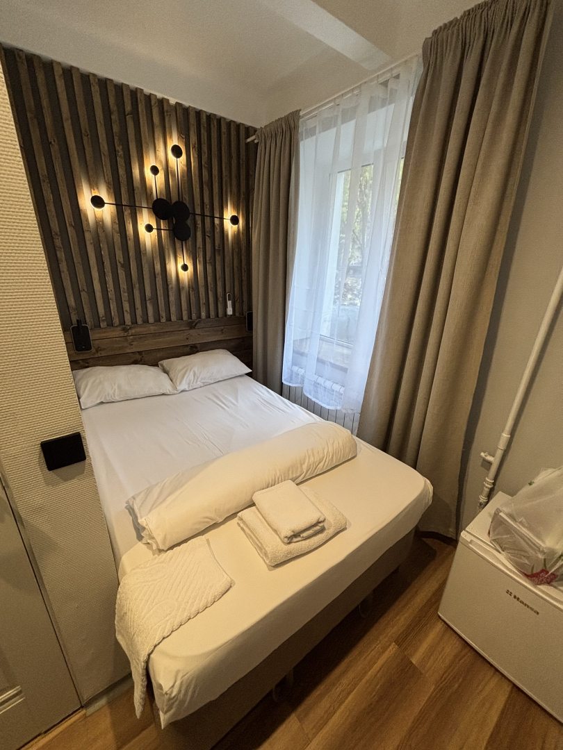 Номер стандарт для 2х. Соответствует описанию и фото. Реально 9кв.м вместе с туалетом и душем. В номере прихожая 1м1м (если есть чемоданы, объёмные сумки ставить будет не куда). Туалет, душ, раковина-2м2м. Кровать, малюсенький столик, маленький холодильник, чайник,телевизор на стене. Все это 2м2м. Вдвоем размещались с трудом, только сидя на кровать. Вещи можно повесить на вешалку только те, в чем одеты и поставить на пол маденькую сумку и обувь. Белье белое, качество хорошее. По два полотенца +ножное. В туалете 2 флакончика геля и шампуня, одноразовые тапочки. Кондиционера нет. Окно отрывается во двор, находится в цокольный этаже жилого дома. Решётки нет, войти со двора, как в дверь, может любой))). В номере было тихо, соседей особо не слышно. Около номера гладилка с утюгом. На ресепшене в доступе большой холодильник, чай, кофе из кофемашины, печеньки. Брали завтрак шведский стол. Накрывают на ресепшене. Омлет, сосиски, греча, тушёная картошка с мясом, блины, запеканка творожная, колбаса, сырная нарезки, каша рисовая молочная, йогурт, масло, сгущенка. Всего вдоволь, позавтракать можно сытно. При выходе из отеля прямо метров 100 Пятёрочка. Вечером сходить поесть не куда. Слева дойти до Большой Грузинской есть несколько ресторанов, ценник заоблачный и сытной вкусной еды особо нет. Но немного вперёд, правее есть Советская Чебуречная и Перекрёсток. Там можно сытно и вкусно поесть по приемлемой цене.