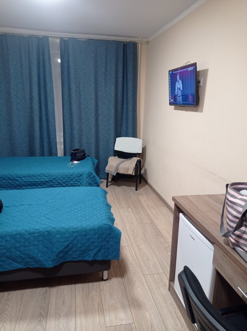 Номер на 3 этаже, в номере есть холодильник, телевизор, стол, шкаф, тумбочки, 2 стула. В коридоре на этаже есть кулер с горячей и холодной водой.