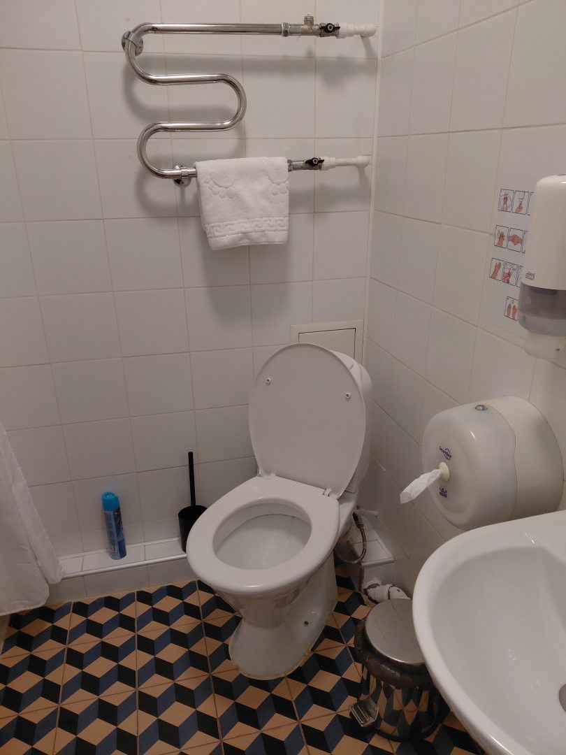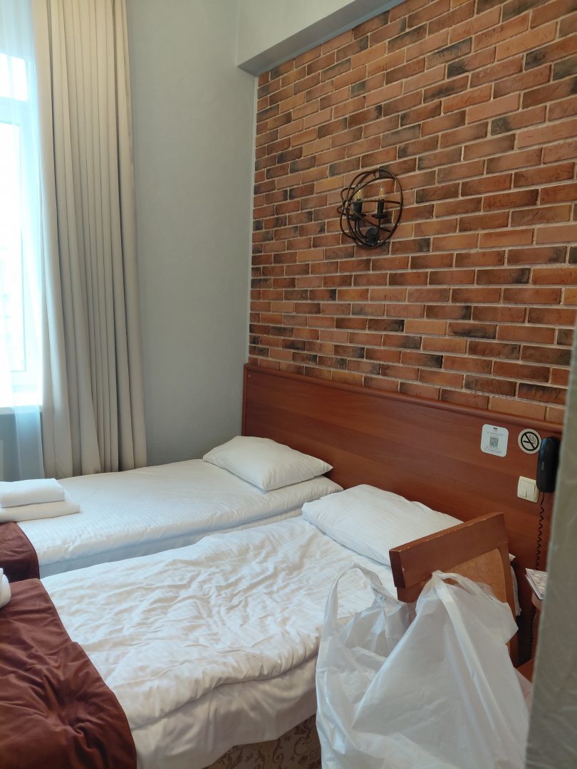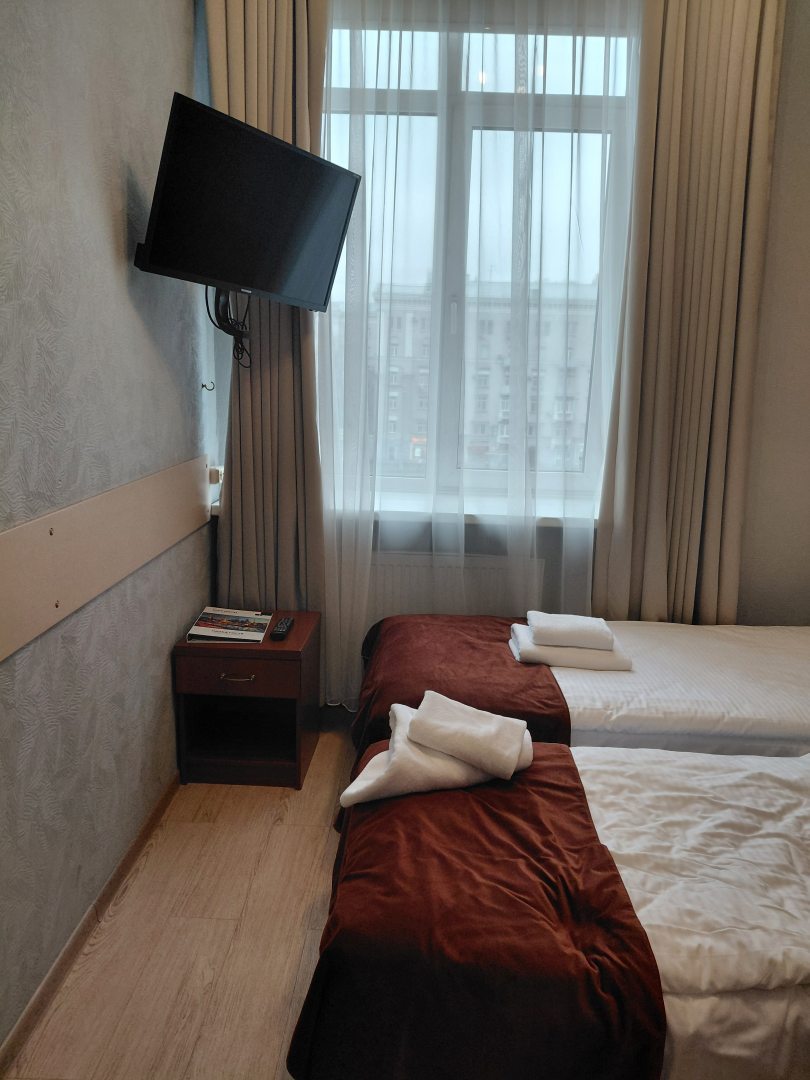 Из недостатков: номер очень тесный, из-за тумбочки не подойти к окну, можно только перелезть через кровать) Не хватает сеток на окне