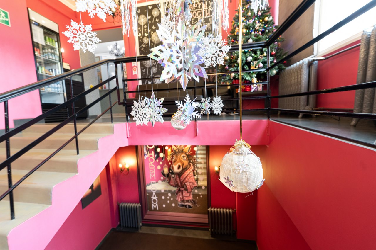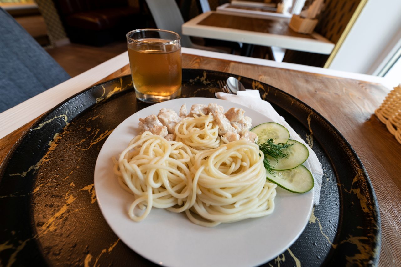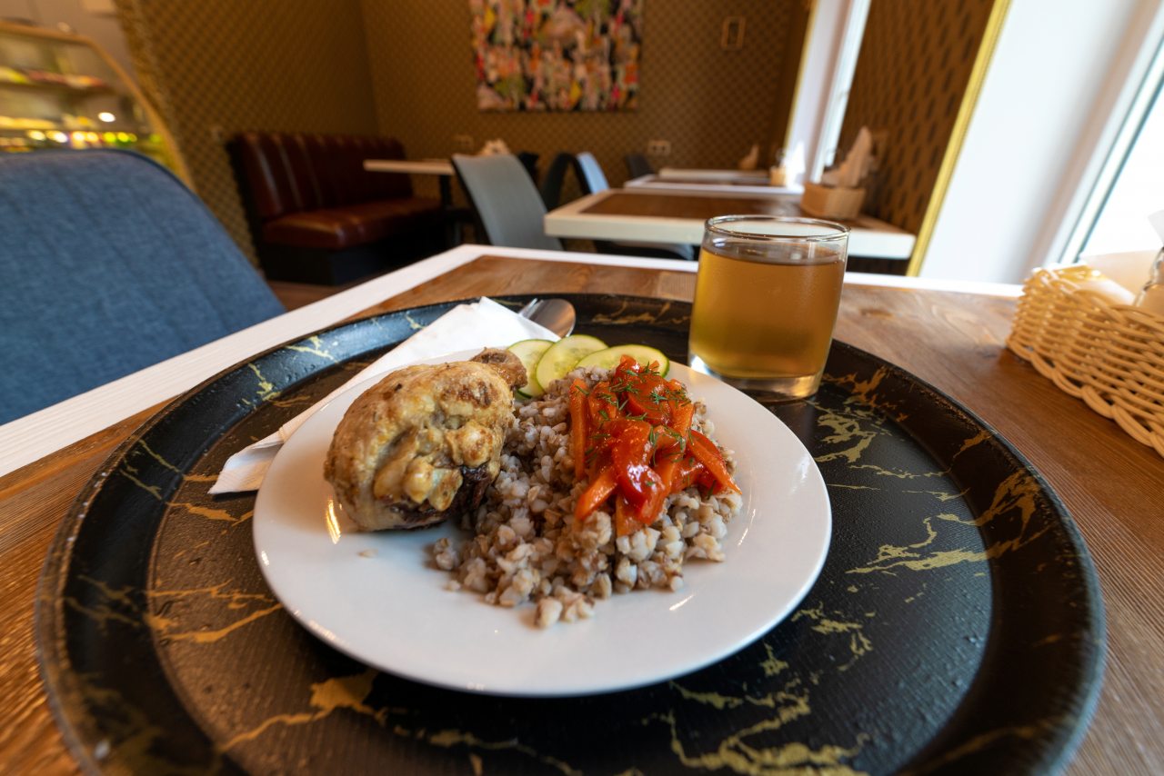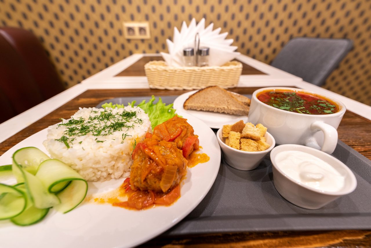 Различные вкусные блюда русской кухни подаются в кафе гостиницы, работающего с раннего утра до поздней ночи. Поблизости от здания находятся продуктовые магазины, рестораны: «Вкусно и точка», «Чайхона №1» и «Тануки».