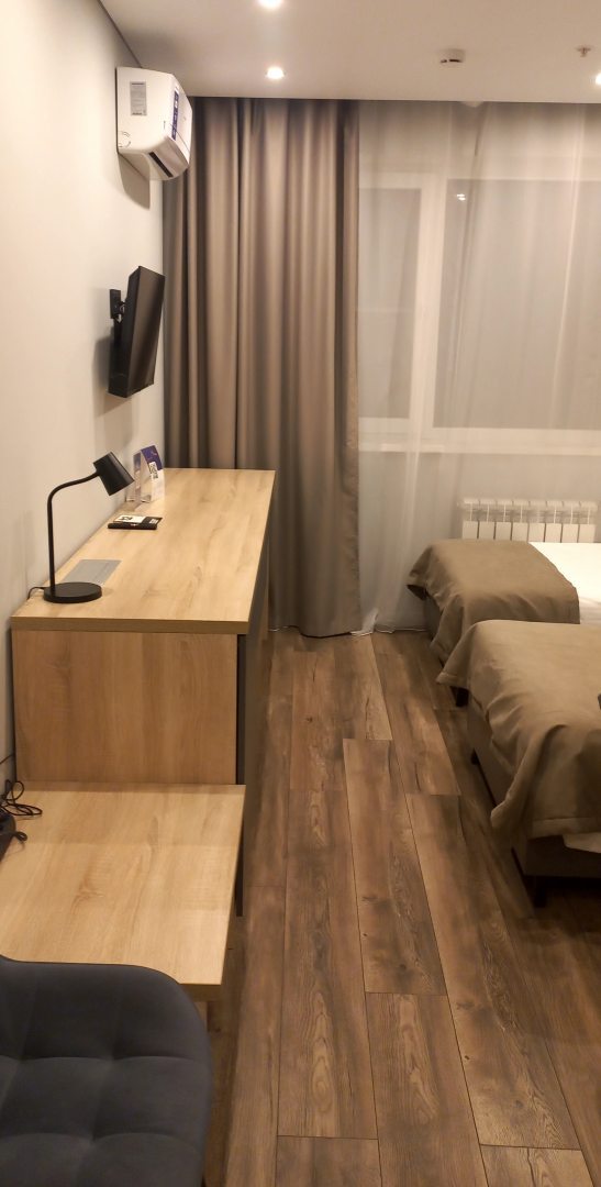 Отличный отель!В номере все необходимое: ванные принадлежности,чайник,микроволновка, даже электрическая поверхность. Расположение отличное: 2 мин через подземный переход- горговый центр,Лента, Евроспар. Остановка еще ближе,каждый автобус идет к ст.метро Тропарево- 2 остановки. Обратно также ,хотя от метро можно и пешком. Завтраки отличные,шведский стол: нарезки,овощи,фрукты,каши, омлет,творог запеканки, кофе на выбор из кофе-маши6ы,есть соки. Если завтрак не включен,то на 1 этаже 2 буфета со свежей выпечкой,напитками и готовыми блюдами. Персонал вежливый и внимательный. Есть огромная парковка. Очень довольны и рекомендую к посещению!!!
