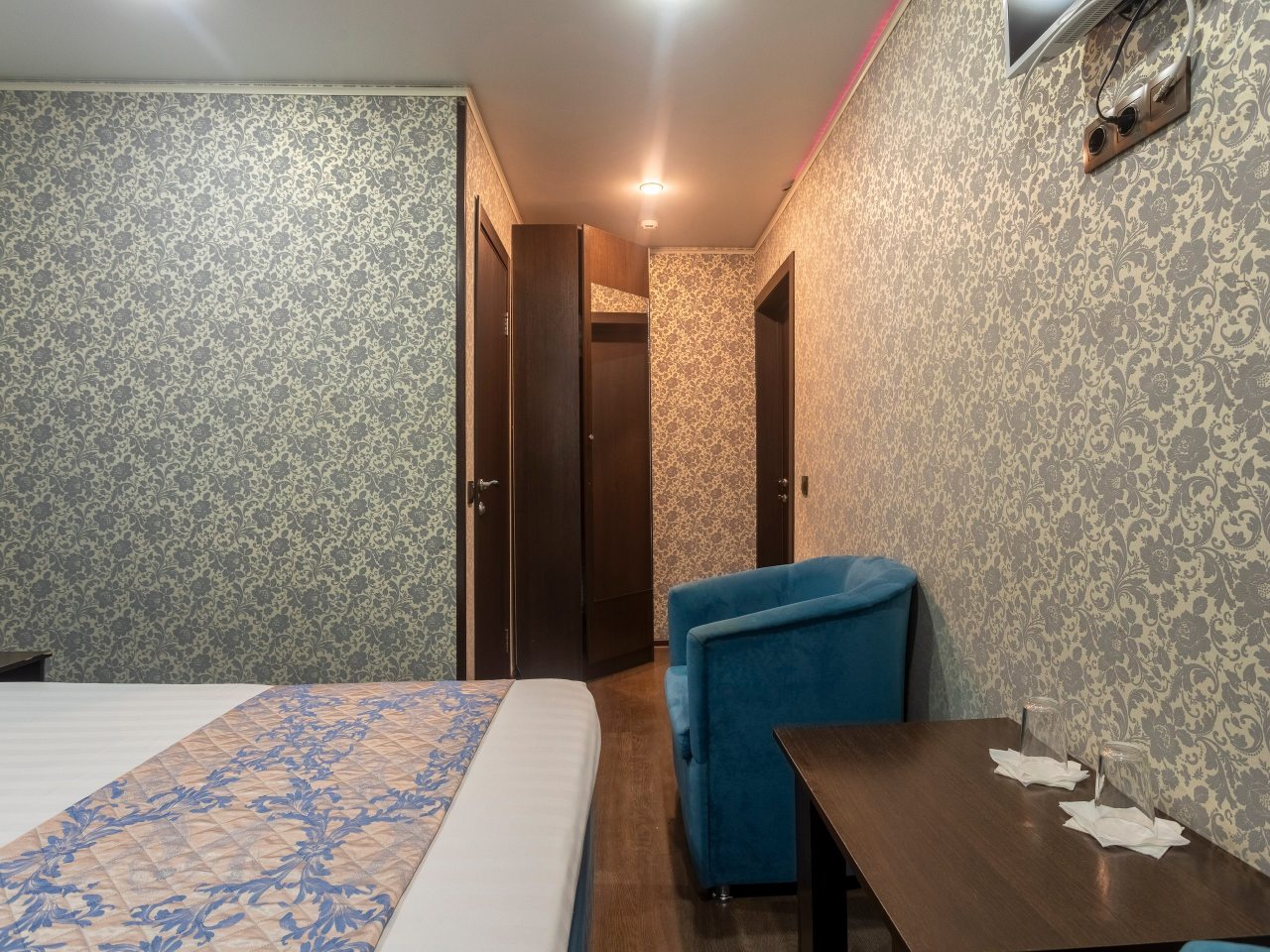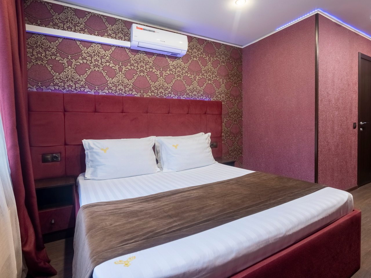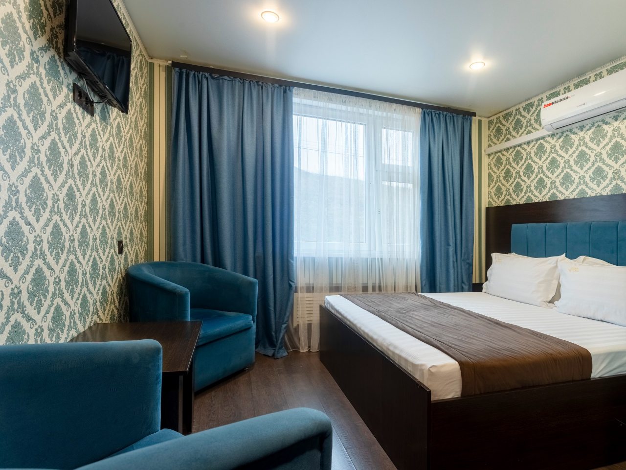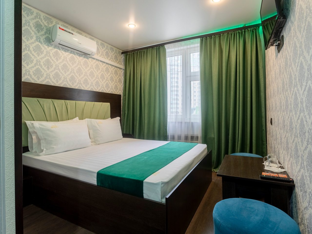 Для размещения представлены номера категории «Стандарт» вместимостью от одного до двух гостей. Все варианты укомплектованы качественной мебелью и техникой для приятного времяпровождения и отдыха: двуспальная кровать, кондиционер, телевизор. В собственном санузле установлена необходимая сантехника и есть индивидуальные средства гигиены.
