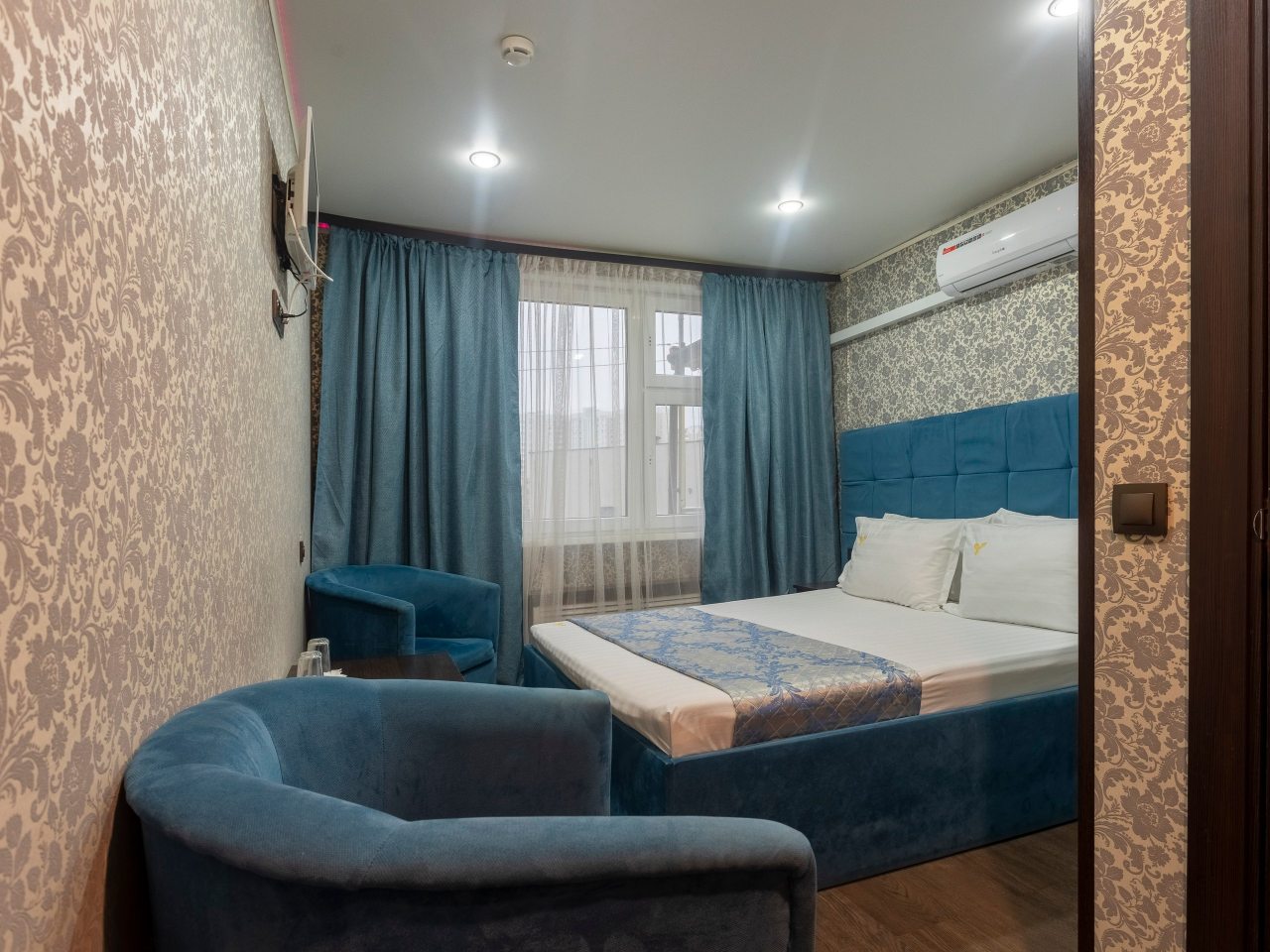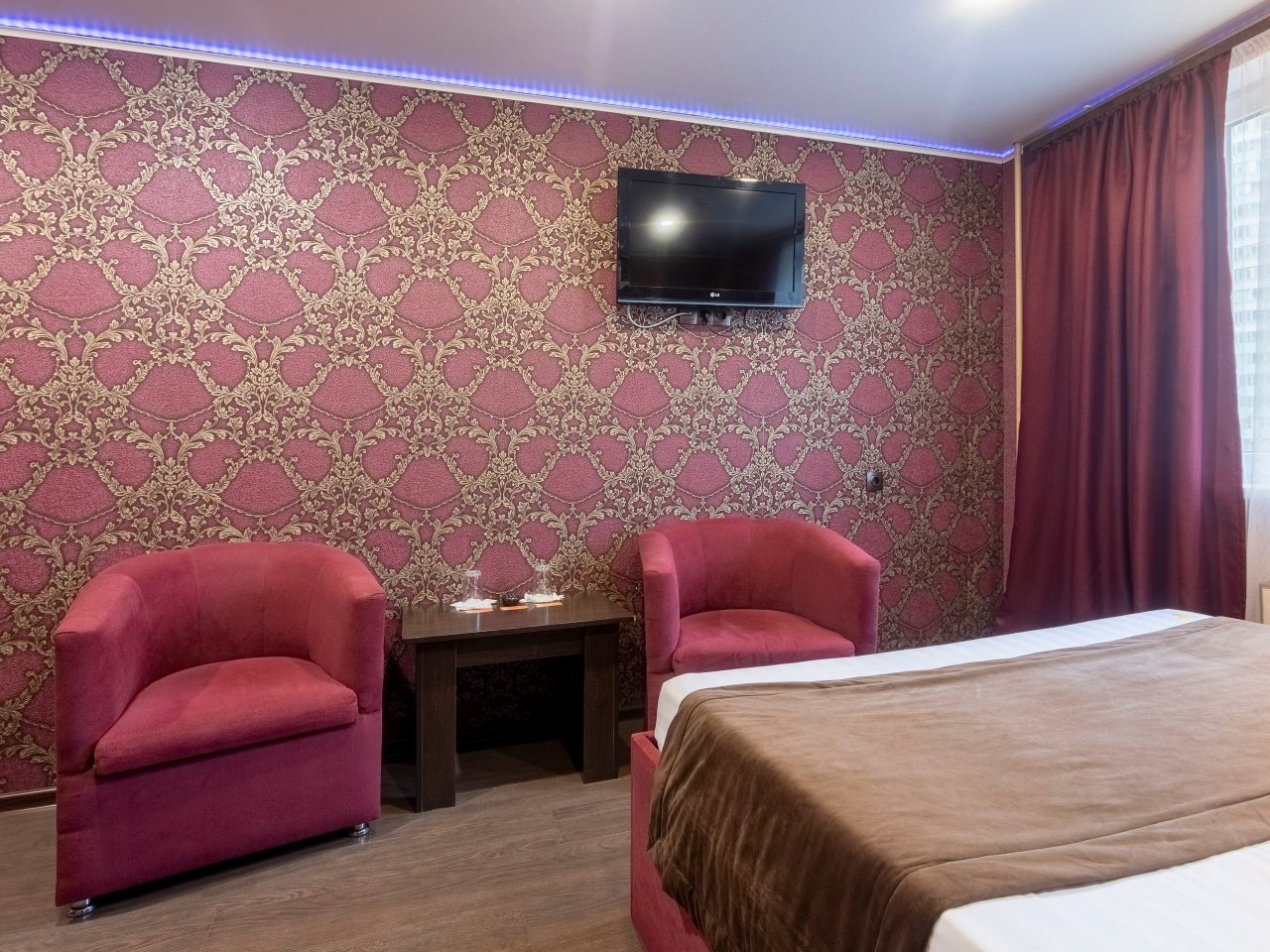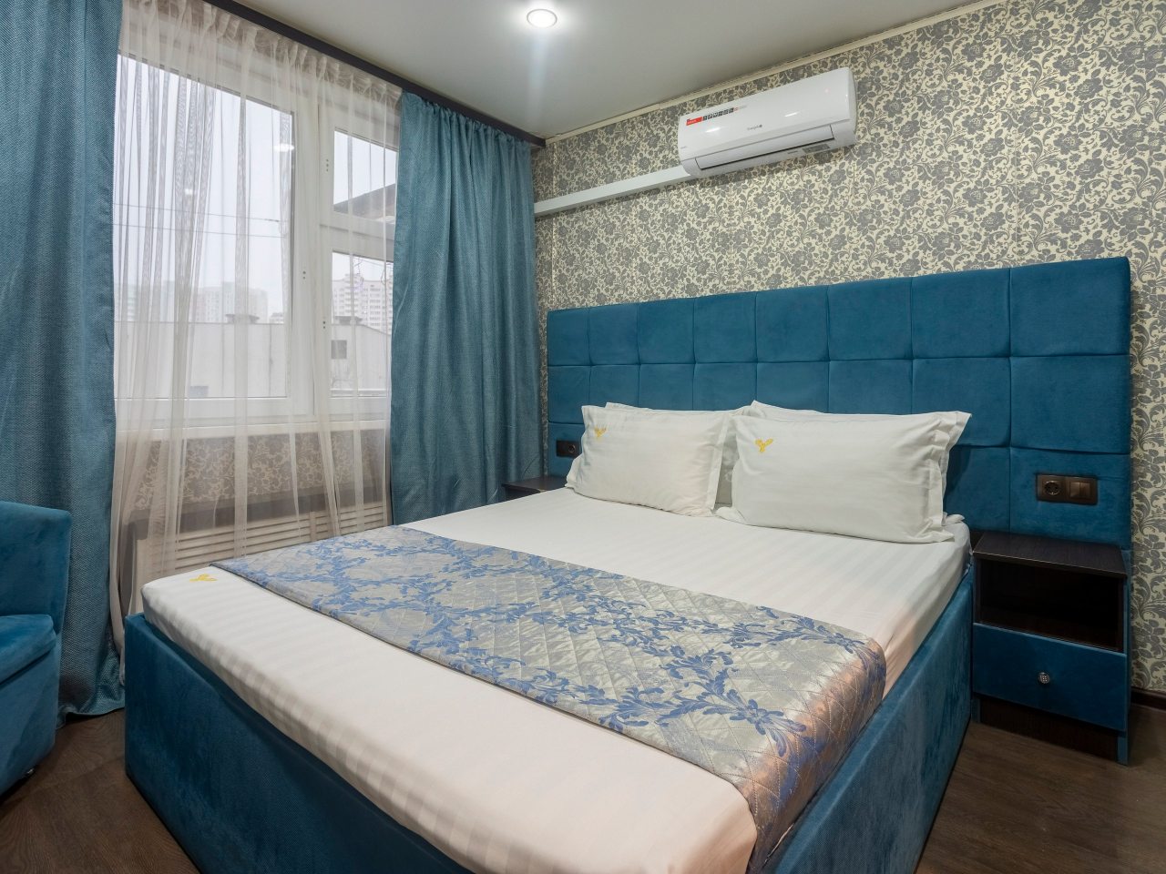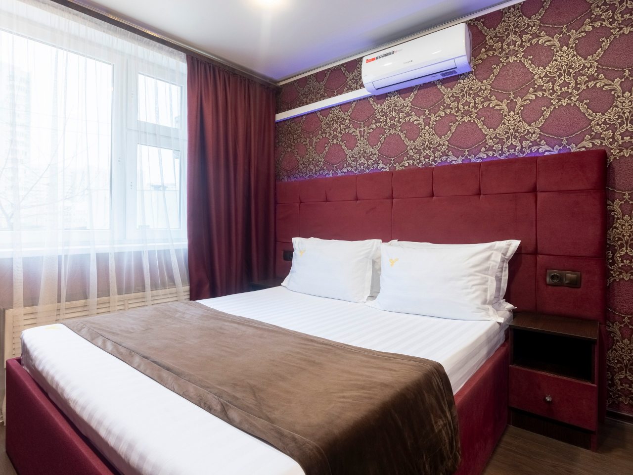 Для размещения представлены номера категории «Стандарт» вместимостью от одного до двух гостей. Все варианты укомплектованы качественной мебелью и техникой для приятного времяпровождения и отдыха: двуспальная кровать, кондиционер, телевизор. В собственном санузле установлена необходимая сантехника и есть индивидуальные средства гигиены.
