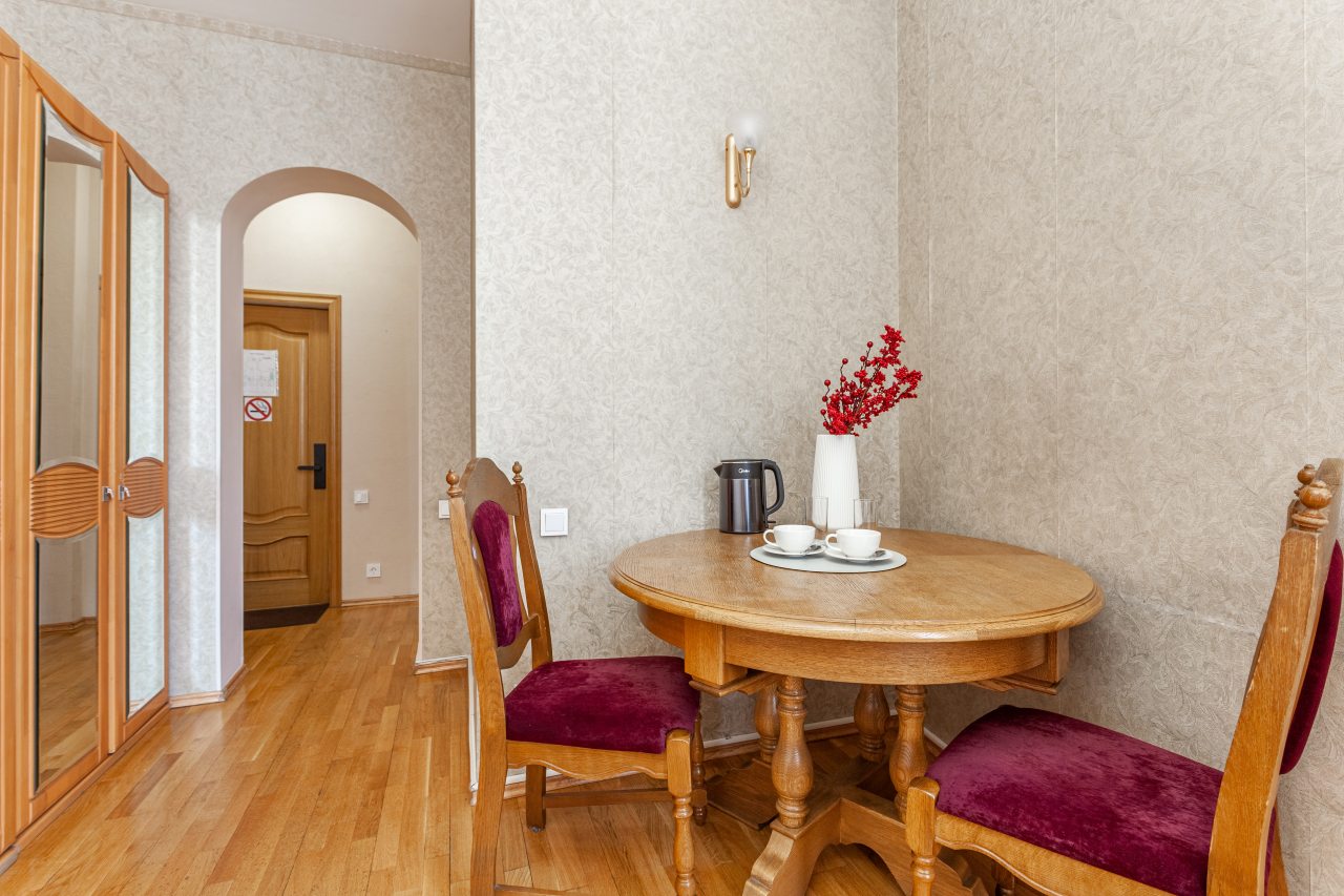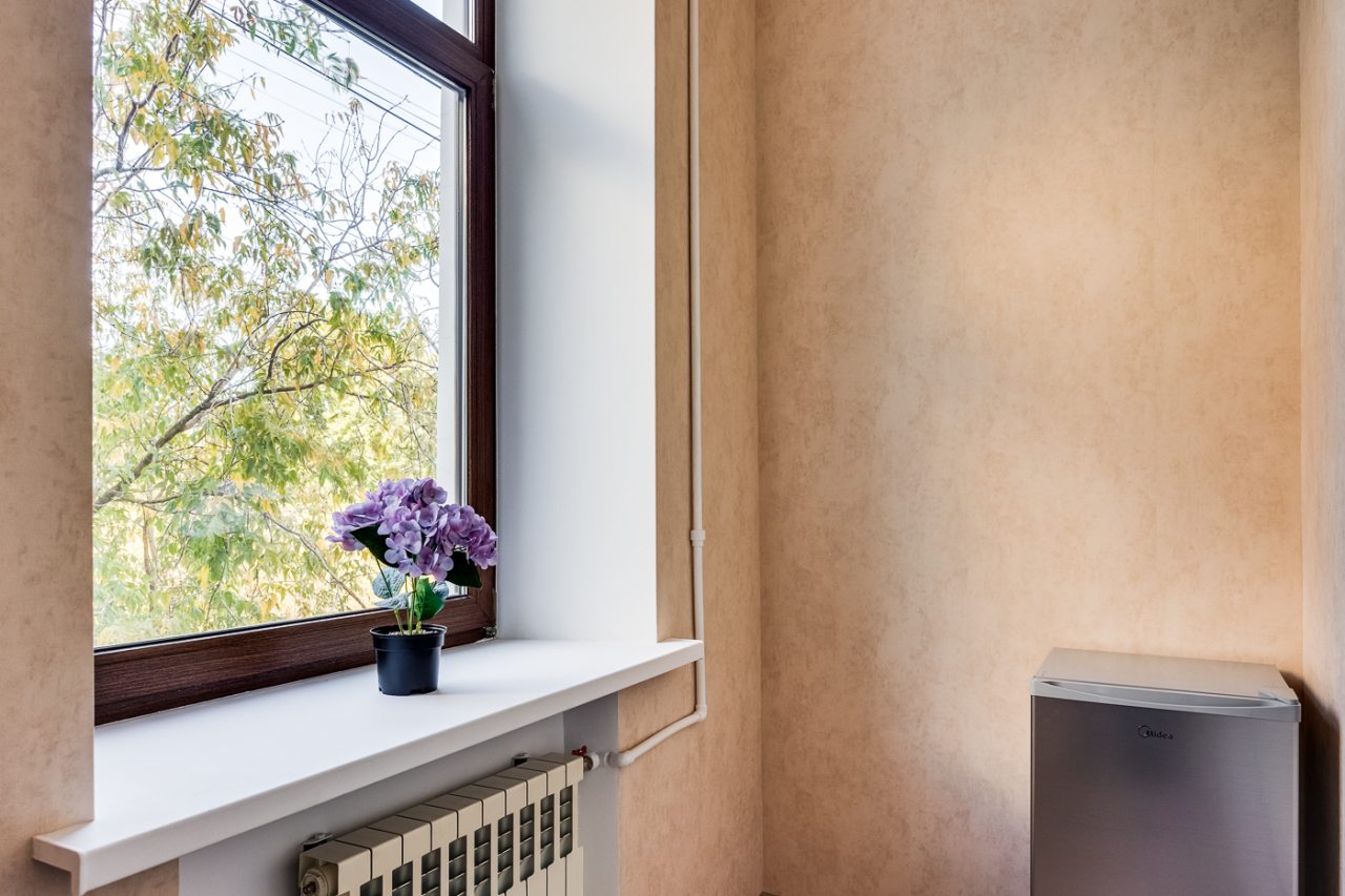 Для организации перекусов и чаепитий в номерах имеется холодильник, посуда и чайник. А неподалеку работают различные заведения питания, где можно полноценно и вкусно пообедать.