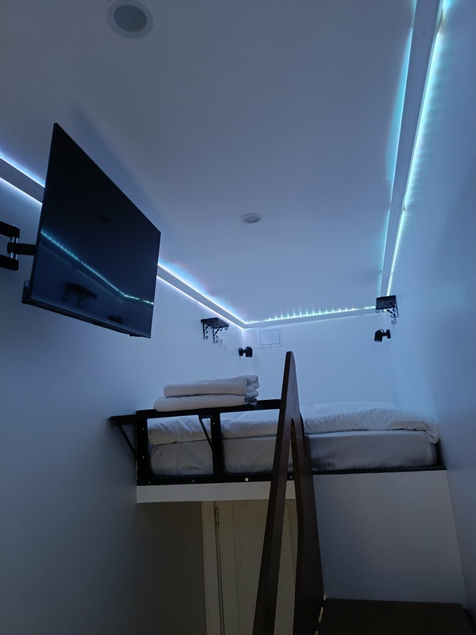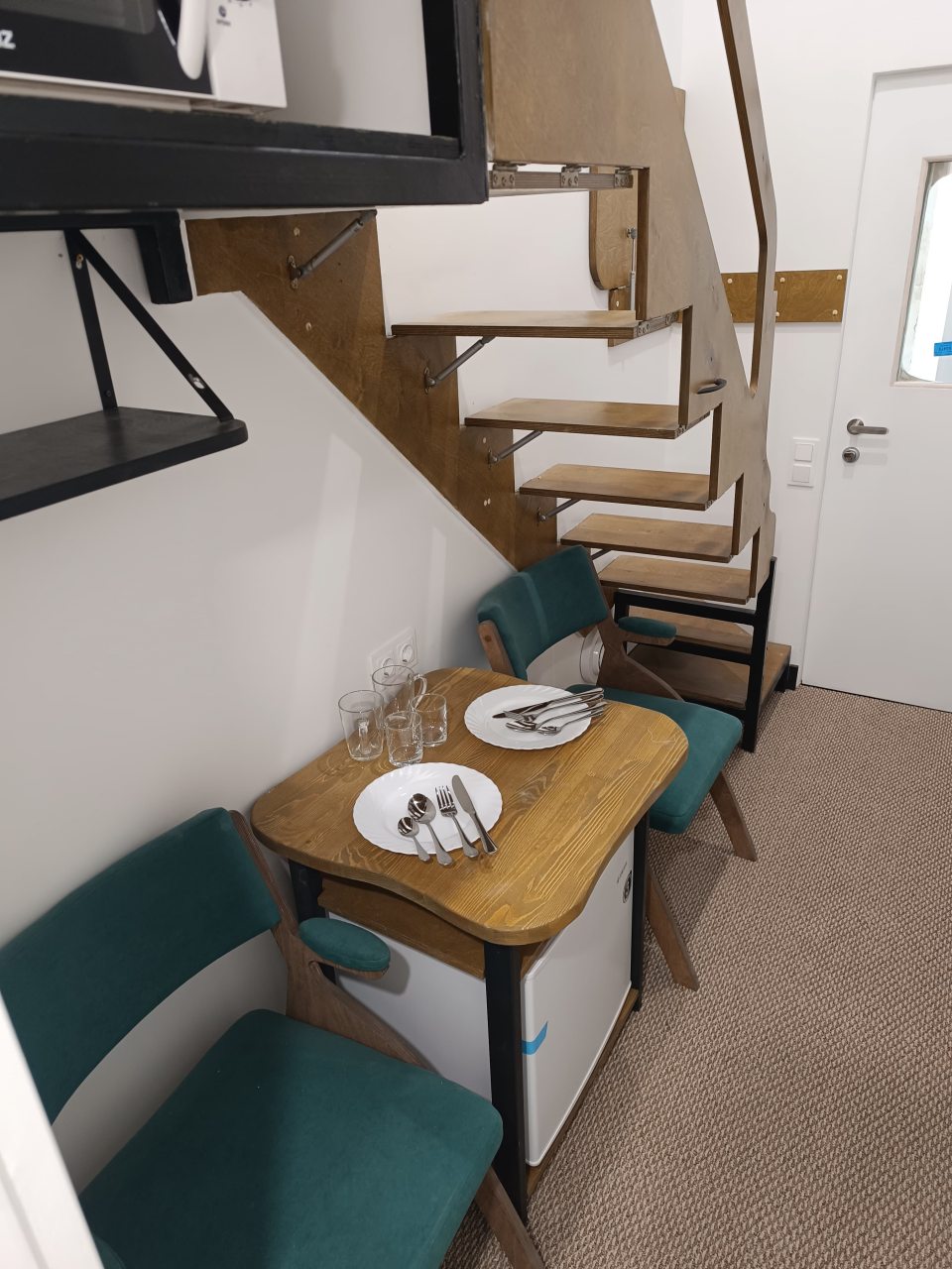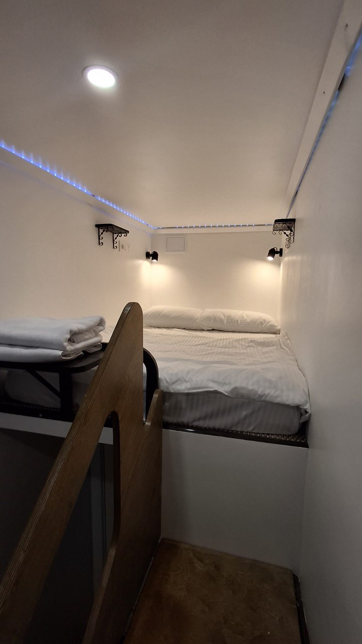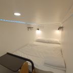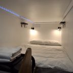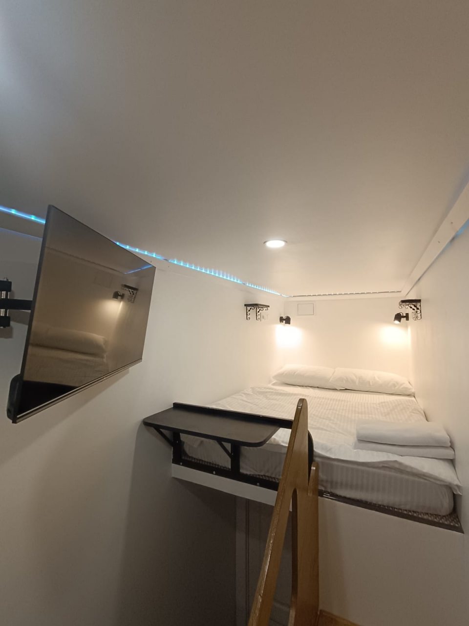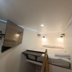 Для проживания предлагаются двухместные капсульные номера-лофт со всеми удобствами: двуспальной кроватью, бра, светильниками. Возле кровати имеются розетки для удобной подзарядки. Вечером можно посмотреть любимые программы по телевизору. Доступна точка доступа Wi-Fi. Гладильные принадлежности на этаже в общем пользовании. В ванной комнате есть туалет, душ, фен, набор полотенец, тапочки.