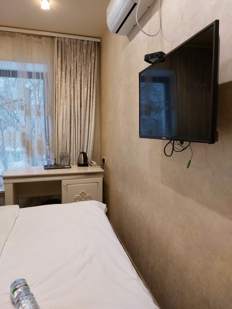 Из недостатков: очень маленький номер - едва можно пройти рядом с кроватью, нет платяного шкафа - только вешалка для верхней одежды при входе, из душа вода вытекает на пол, несмотря на закрытую дверцу.