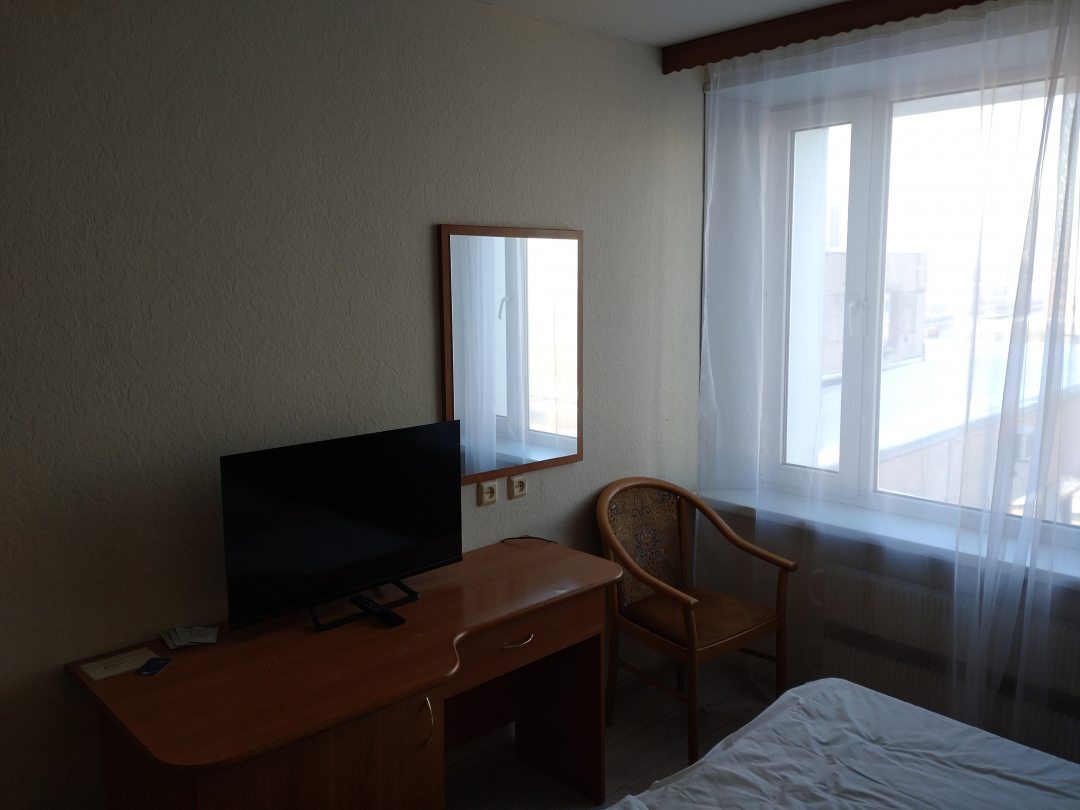 В номере чисто, чистое белье. Есть холодильник, телевизор, встроенный шкаф для одежды. Хорошее кафе на первом этаже, свежие, вкусные продукты. Туалет и ванная комната общая на два номера. Все хорошо. Спасибо администратору гостиницы за вежливое и уважительное отношение.