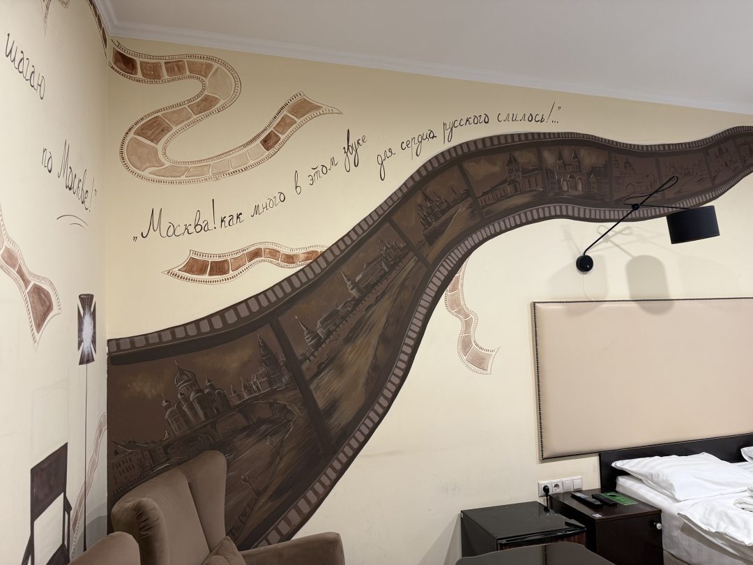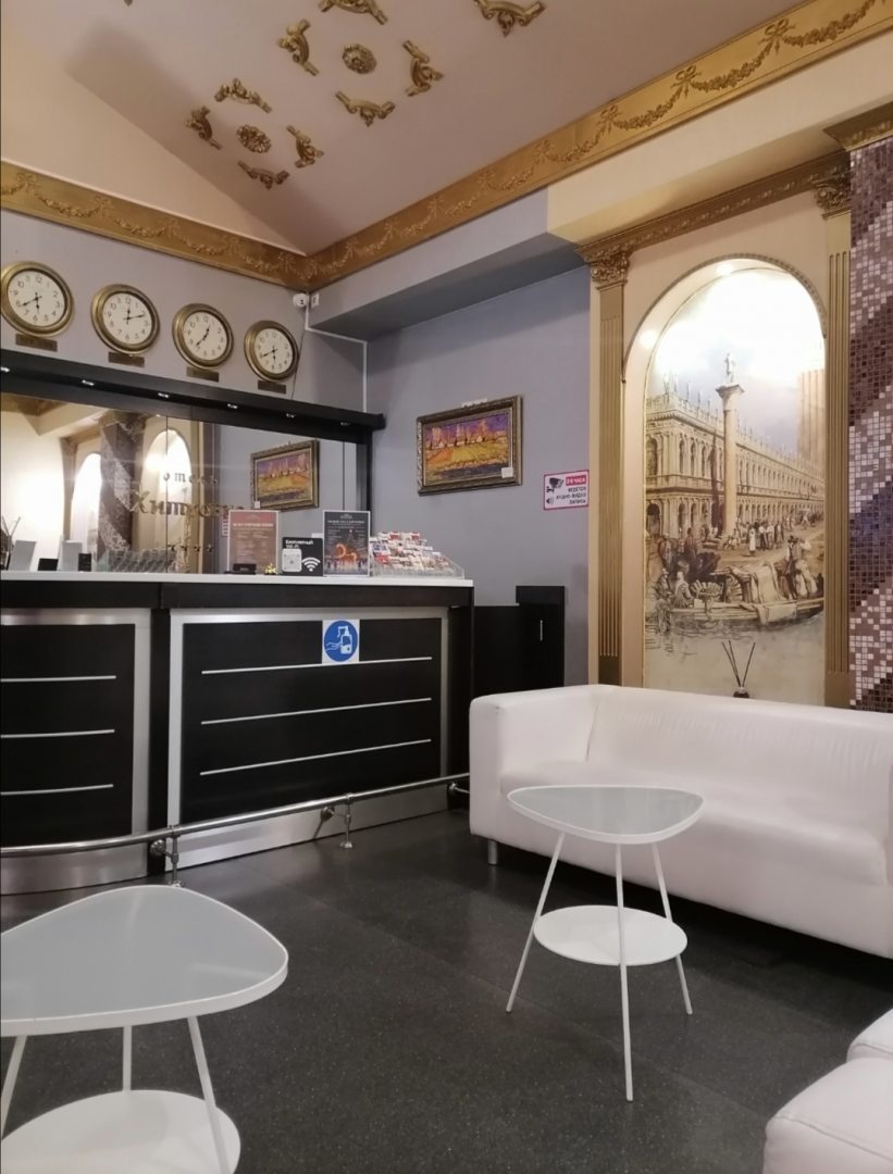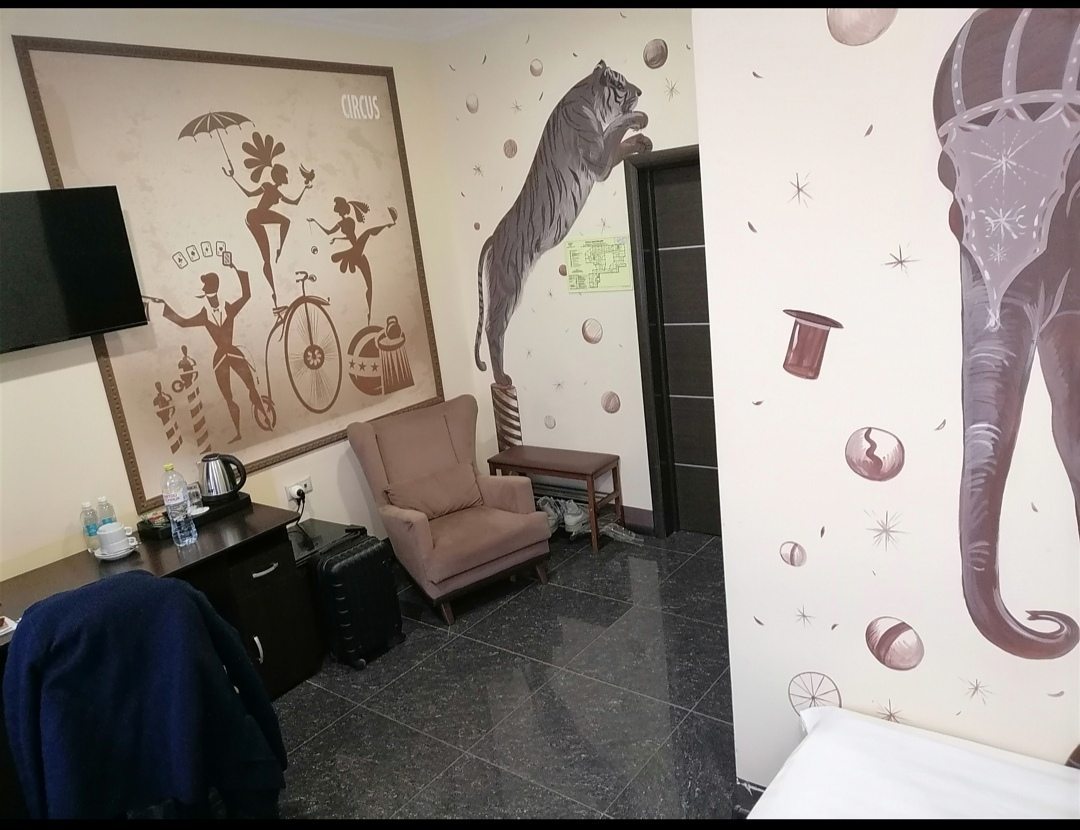 Помпезно во входной зоне, у мужа было день рождение, поздравили пироженым в номер. Есть ресторан, но дороговат. Приветливый персонал на ресепшен. Немного удивило название номеров тематических на дверях. На попался "цирк". Так и были расписаны стены. Слышен звон колокольни. Много церквушек рядом.