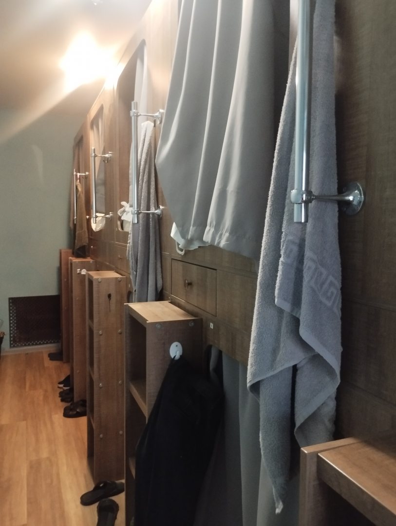 К размещению представлены женские, мужские, двухместные и семейные номера. Среди удобств кондиционер, индивидуальные розетки, светильники, шкафчики и шторки на кроватях. В общем доступе стиральная машина, санузел с душевыми и гладильные принадлежности.