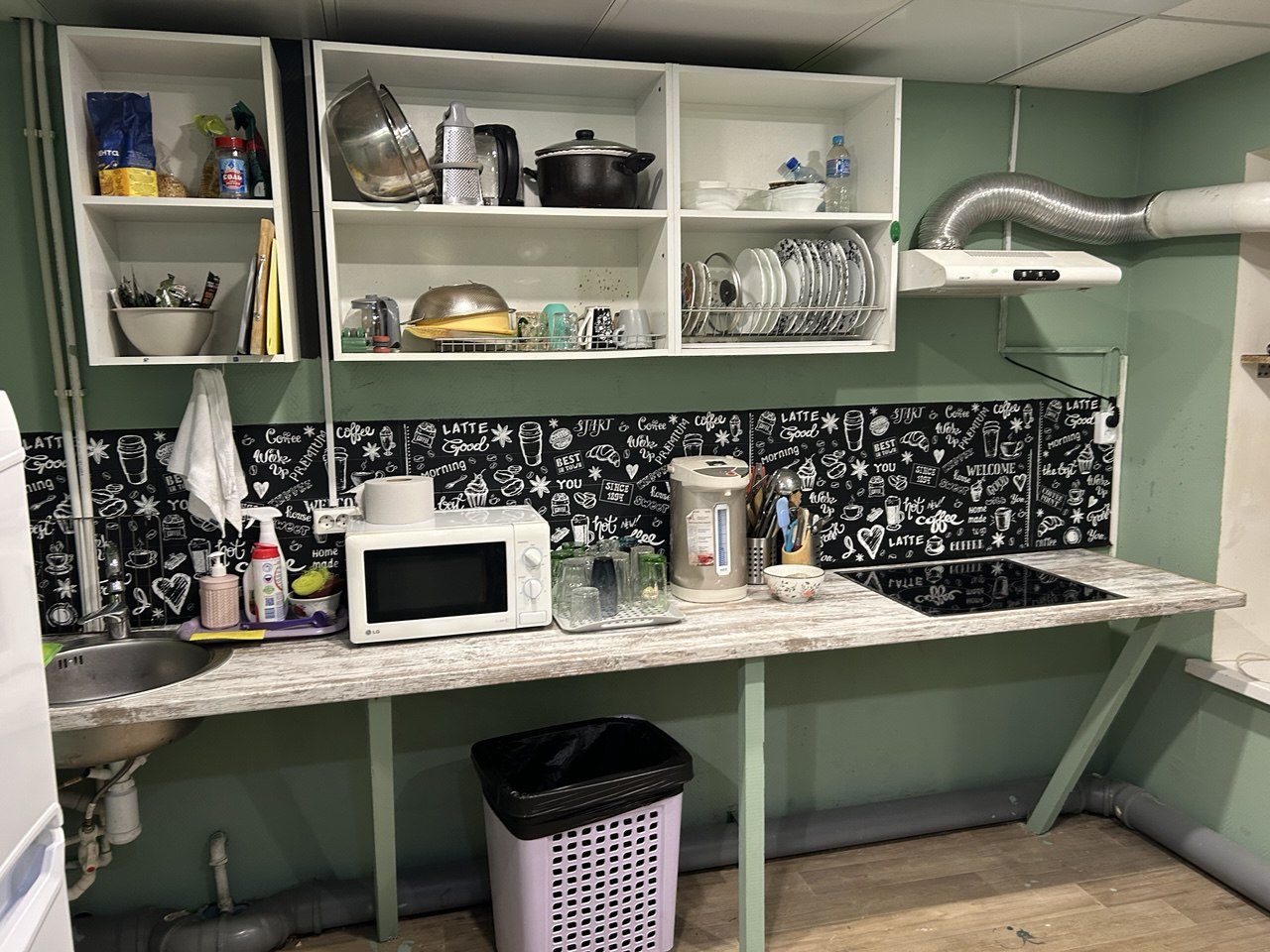 Общая кухонная зона оснащена варочной панелью, микроволновой печью, чайником, вытяжкой, посудой. Пообедать можно в одном из ближайших кафе.