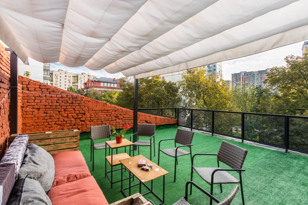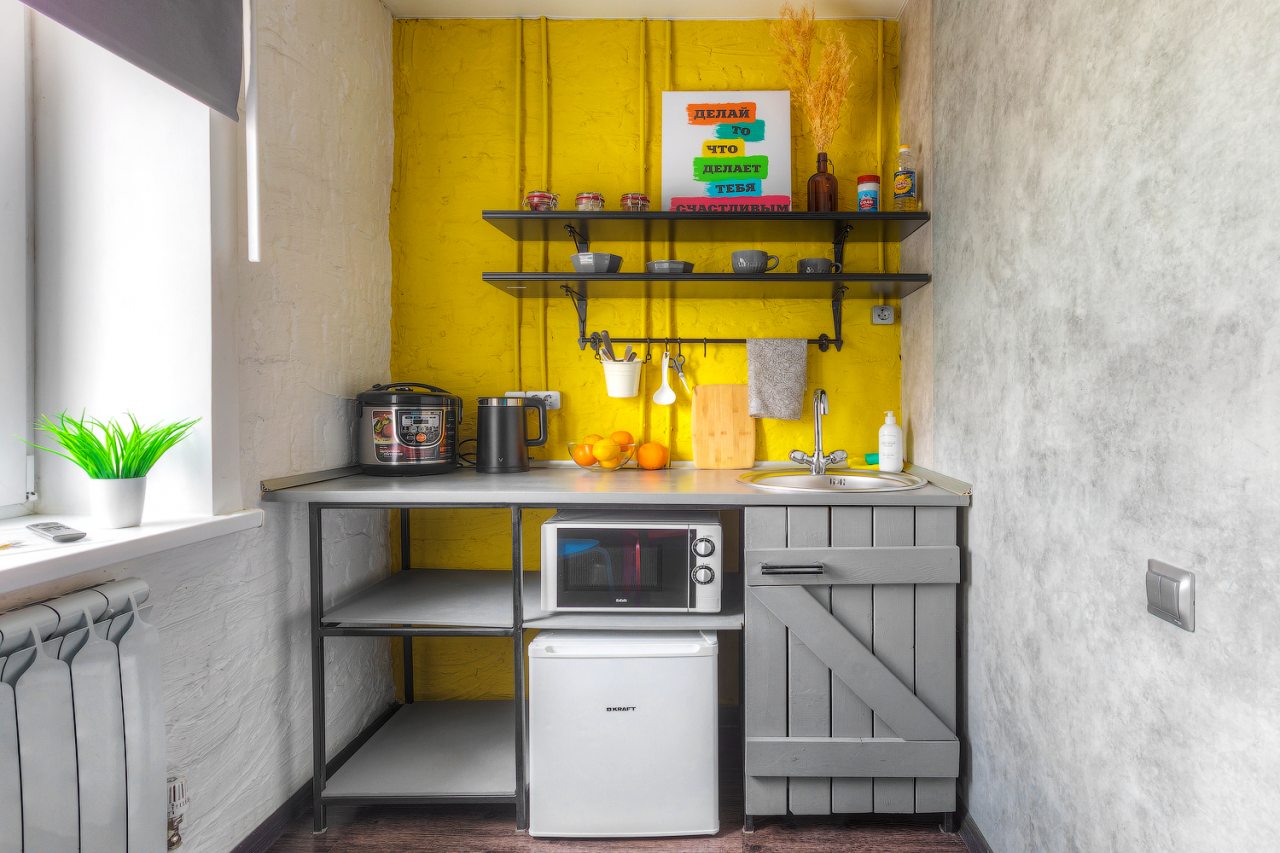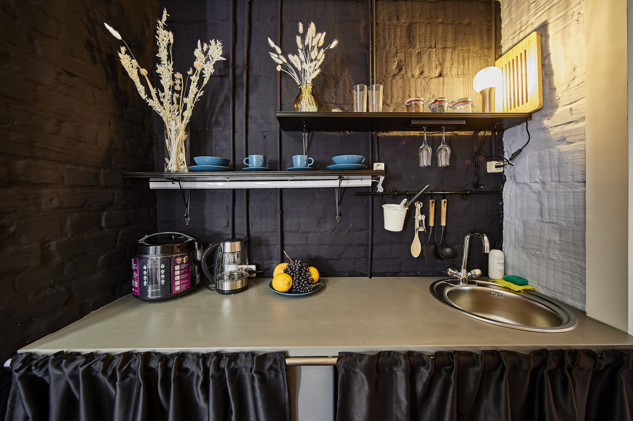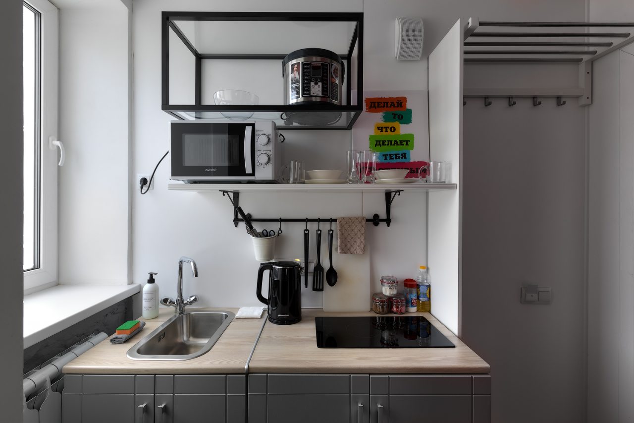 Для самостоятельного приготовления блюд и организации перекусов в некоторых номерах оборудована мини-кухня со всеми необходимыми принадлежностями. В общем доступе у гостей кухонная зона с выходом на террасу, где можно пообедать и насладиться времяпровождением с друзьями.