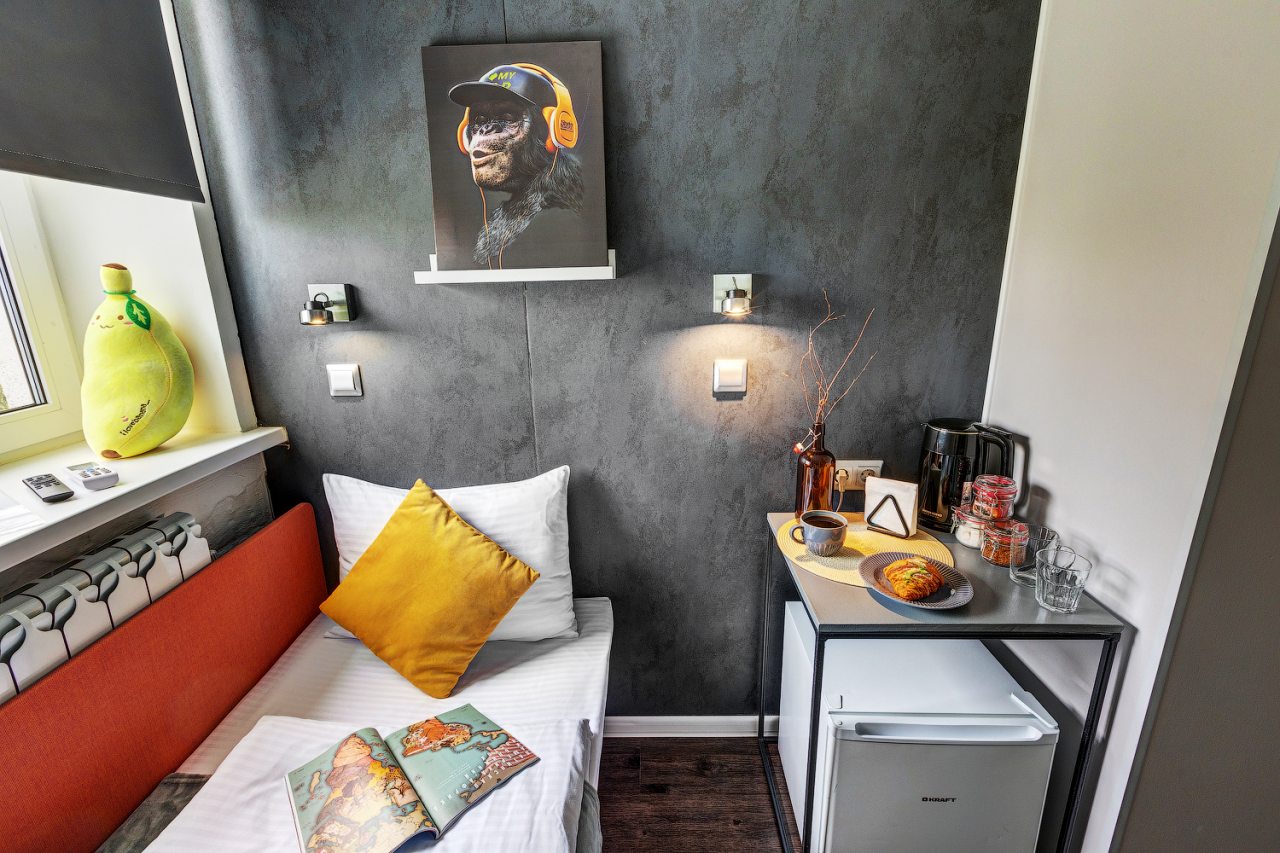 Попался улучшенный номер - понравился. Хороший современный ремонт, чисто, маленькая кухня есть - чайник, микроволновка и холодильник под рукой. Хороший коридор, в котором можно разместить все чемоданы. Шкафа нет, но много вешалок, еще и тапочки были. Порадовало, что в ванной есть крючки на двери - это вечная проблема в гостиницах)) Есть зона хранения багажа на 1 этаже - пригодилась, удобно. А на 4 этаже есть общая кухня и веранда)