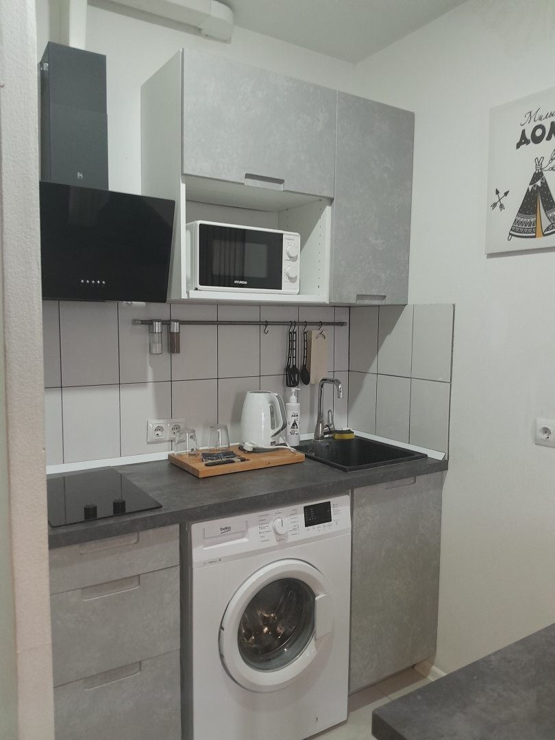 Апартаменты превзошли все ожидания, очень стильная компактная студия. Только ванная комната немного выбивается из композиции, совсем не подходит к интерьеру остальной части квартиры. Тем не менее там тоже все хорошо, нет проблем с водой и неприятных запахов, есть чистые полотенца и гели для душа.