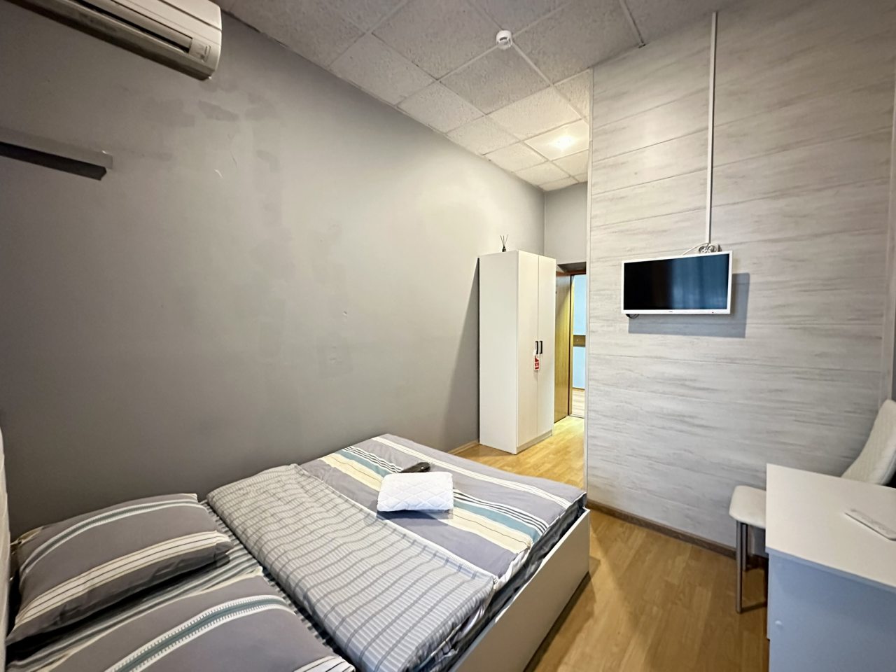 Для гостей подготовлены двухместные номера в современном стиле. Они оснащены мебель и техникой для комфортного времяпровождения: удобное спальное место, телевизор для просмотра передач, столик и открытая зона хранения одежды. В санузле установлен душ и есть средства гигиены.