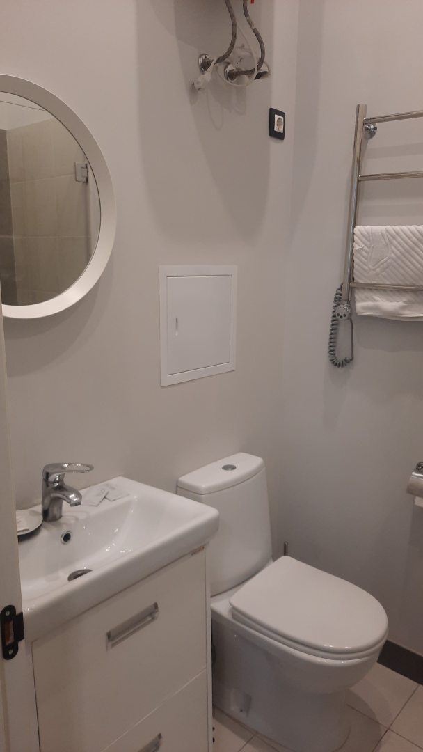 В номере своя ванная комната, в ванной комнате душевая кабинка, раковина, унитаз, по площади тоже прилично, есть полотенцесушитель.