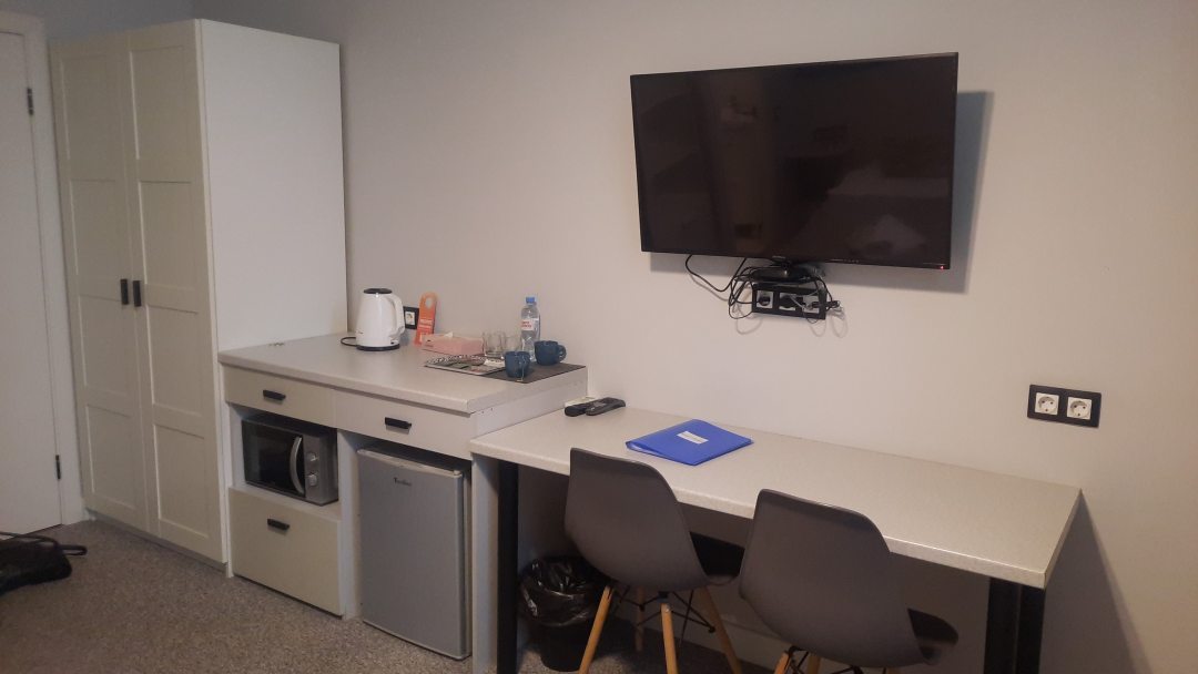 В номере телевизор, микроволновка, холодильник, чайник, пара пакетиков чая зеленого и черного.
