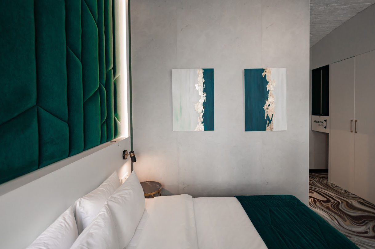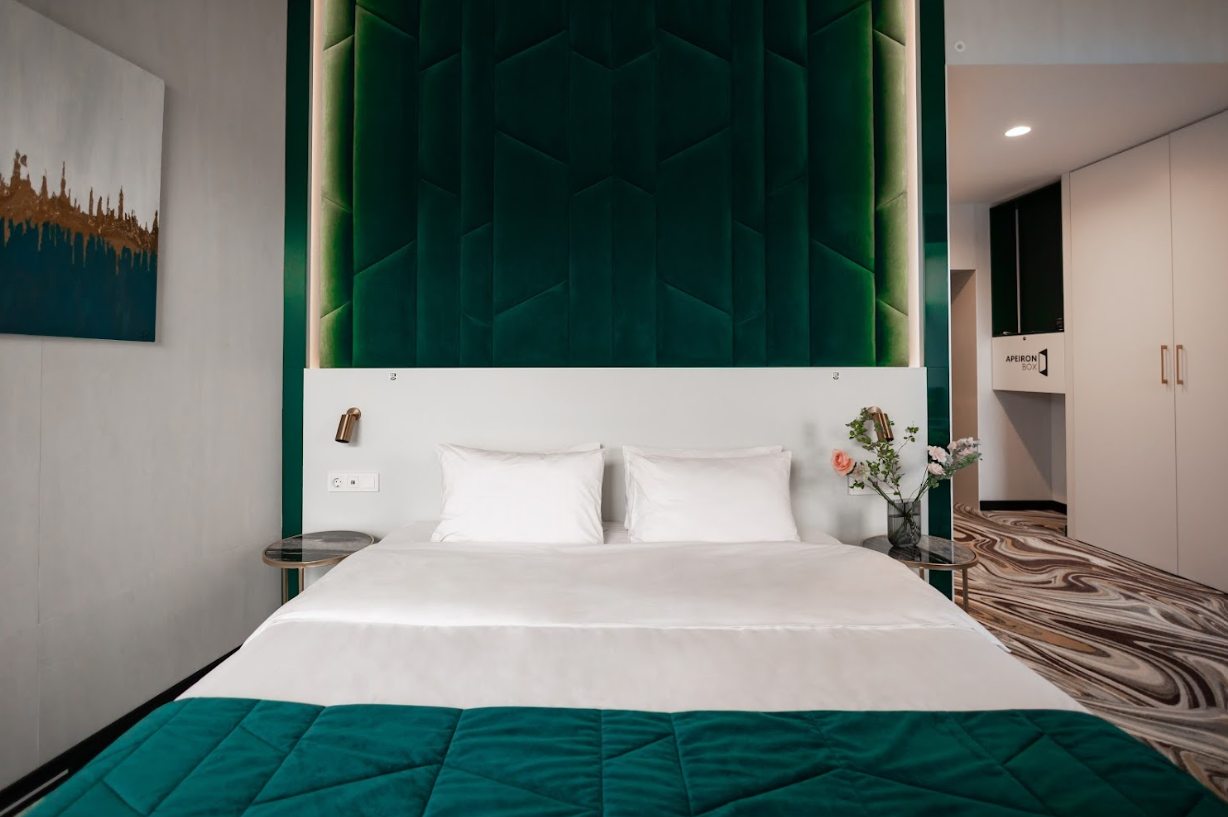 «ApeironSpace» — уникальный отель, в котором благодаря системе «Умный дом» вы можете настроить шторы, кондиционер, смарт-ТВ по вашему вкусу. К размещению представлены номера разного уровня комфорта. Среди удобств плазменный телевизор, скоростной Wi-Fi, хорошая звукоизоляция, сейф и ванная комната. Гостей обеспечивают мягкими халатами, полотенцами и косметическими средствами.