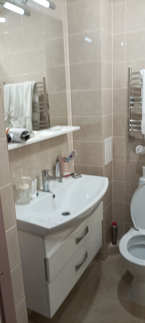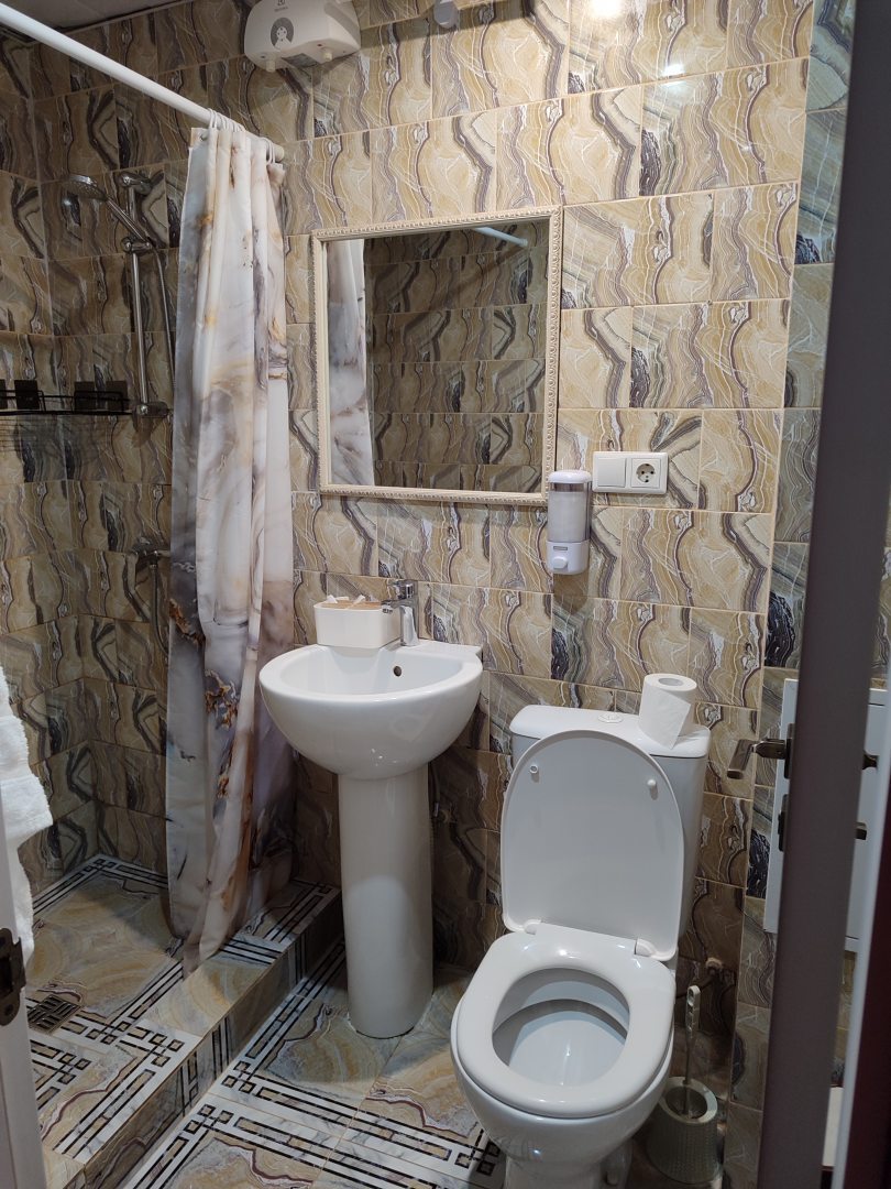 В номере душ , туалет . Всё необходимое ( жидкое мыло , шампунь , гель для душа , щетки и зубная паста ) имеется.