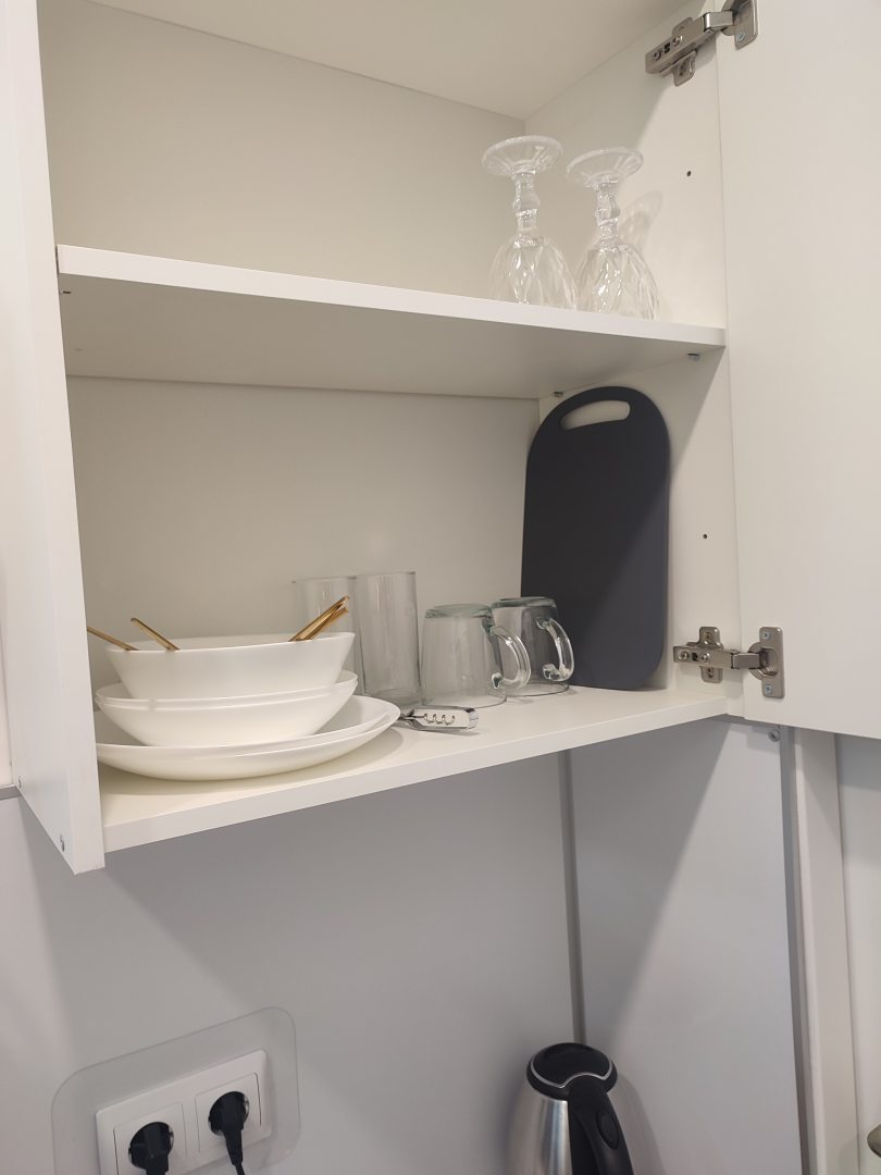 Для организации перекуса и чаепитий предусмотрены СВЧ-печь, посуда, чайник, красивая обеденная зона.