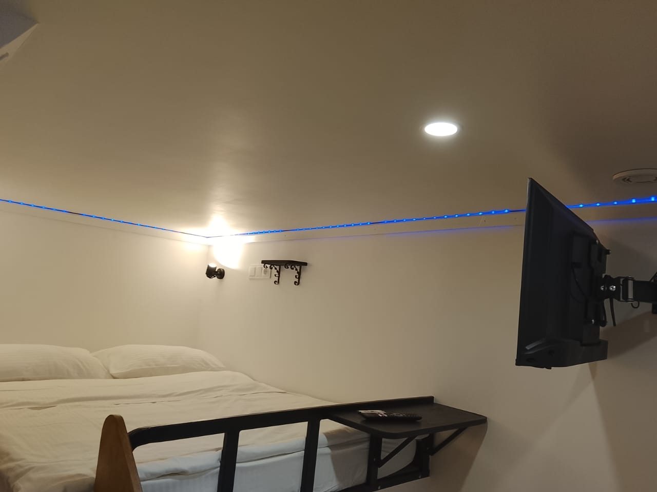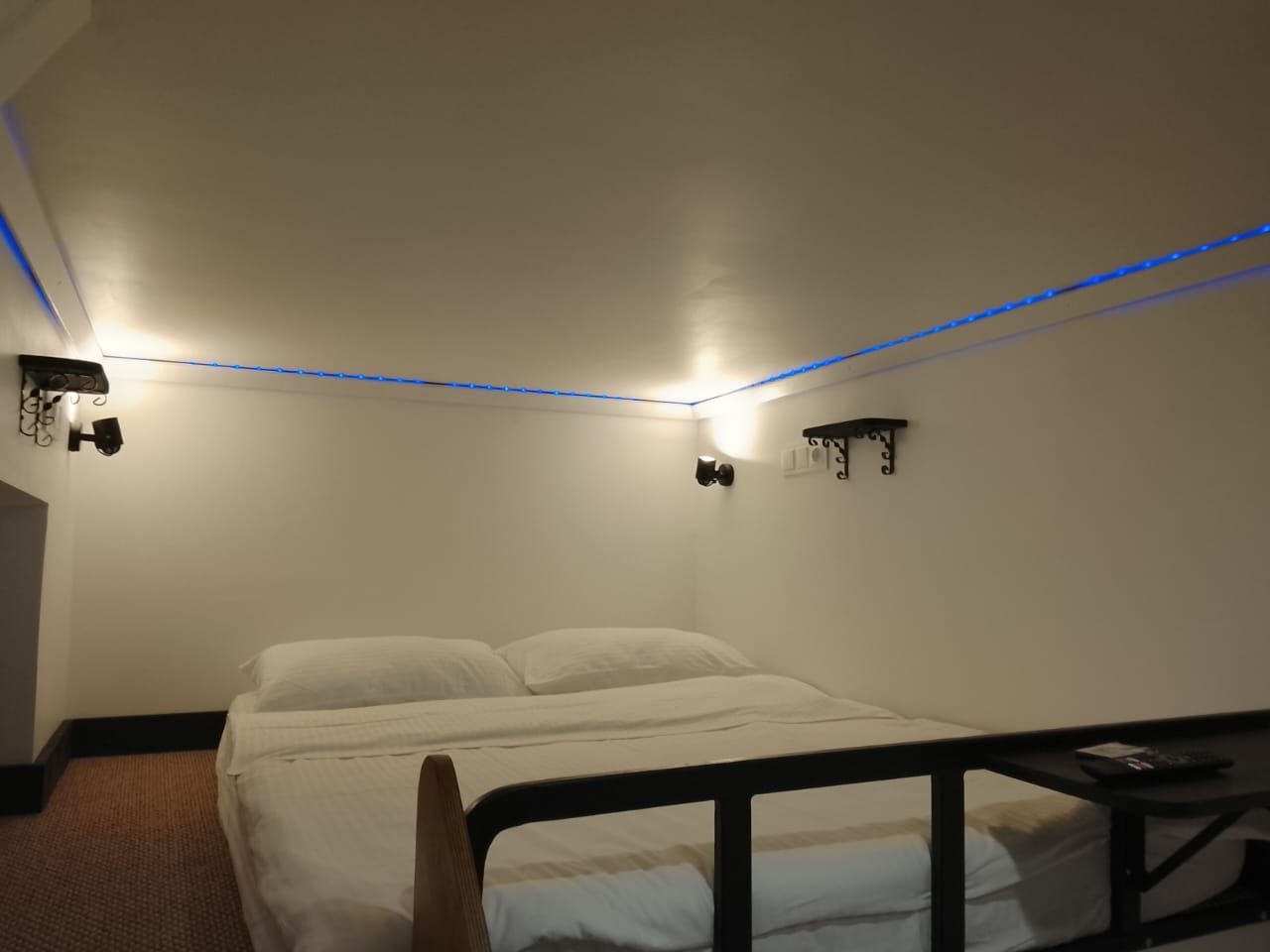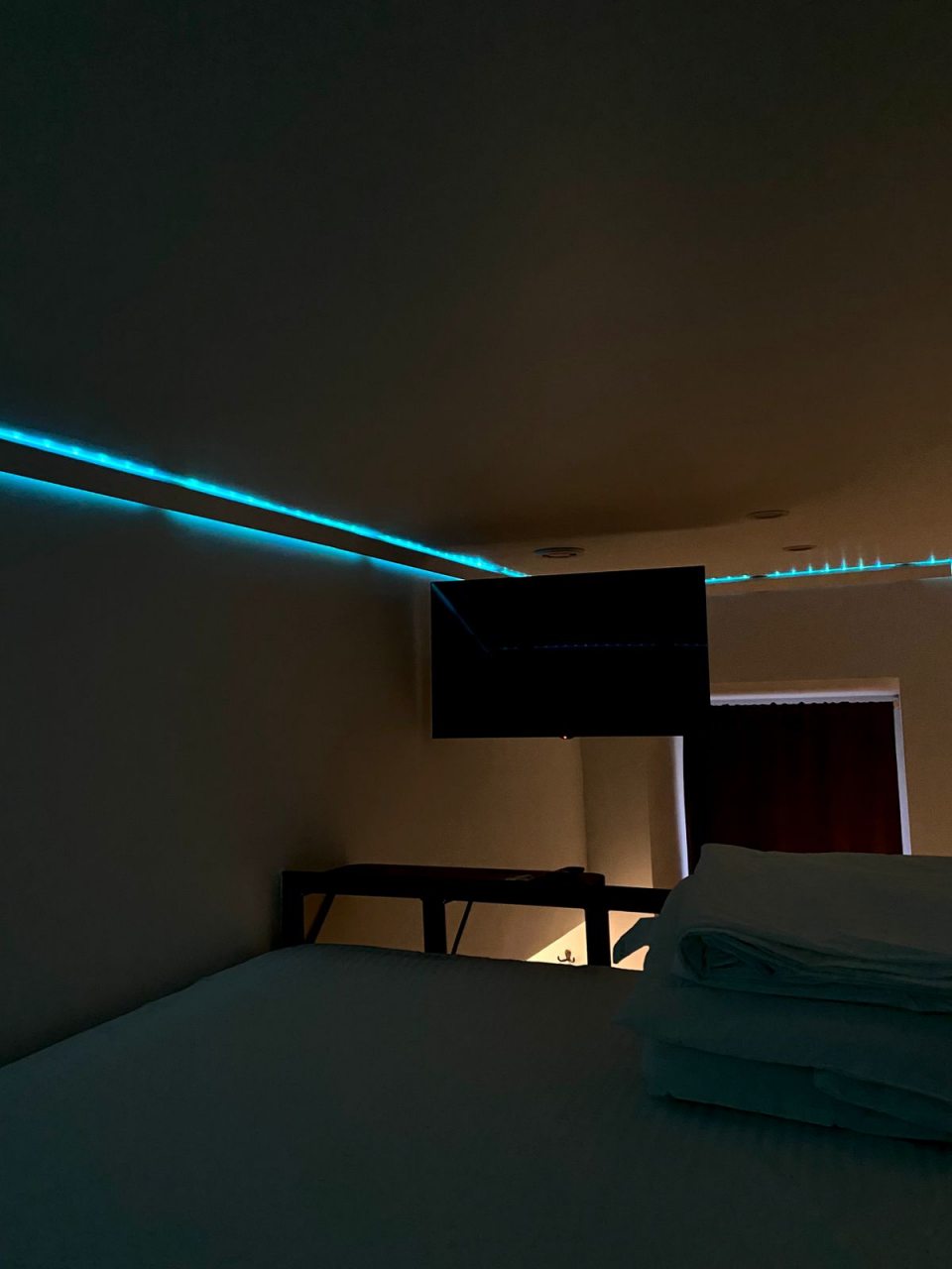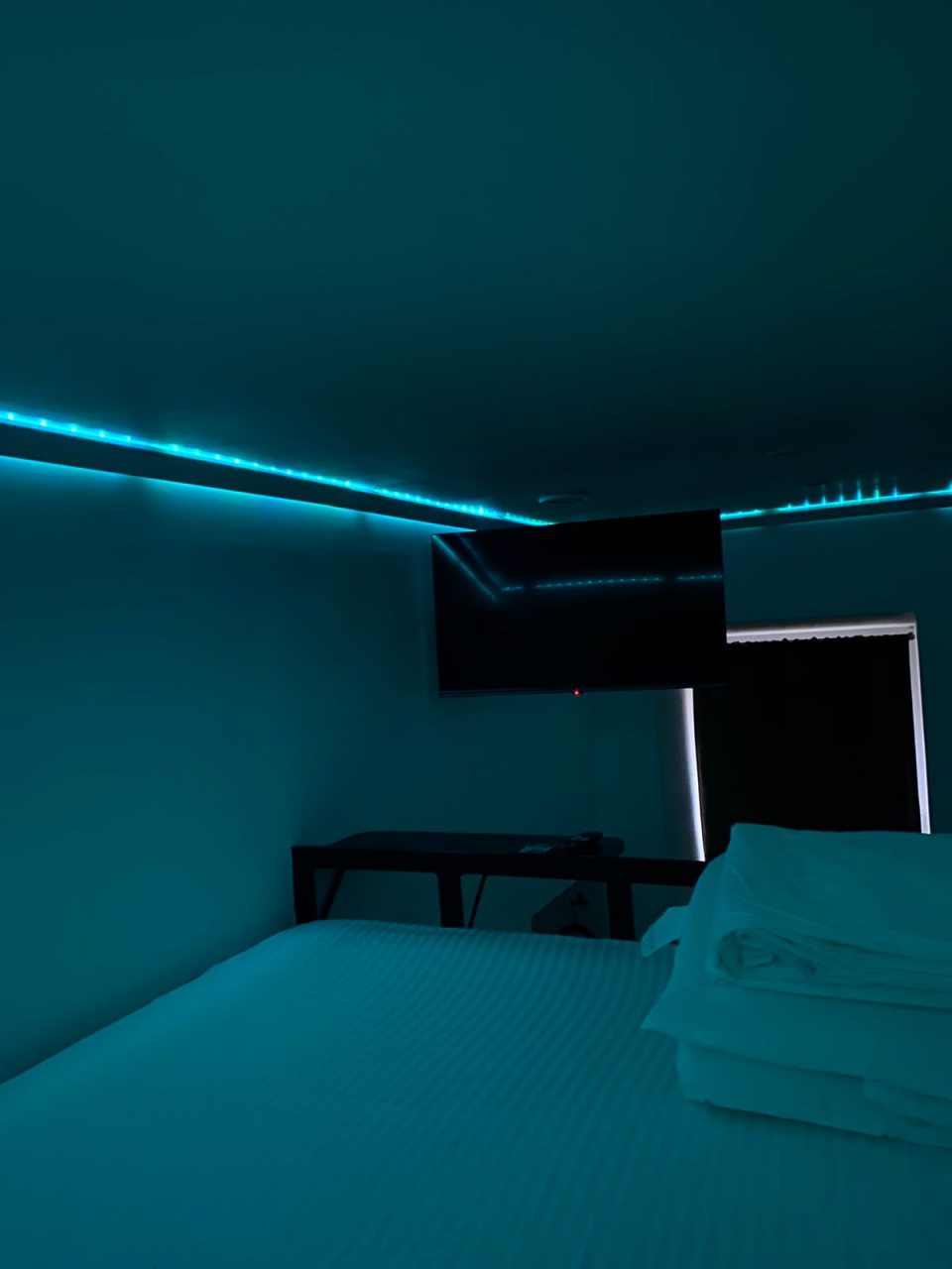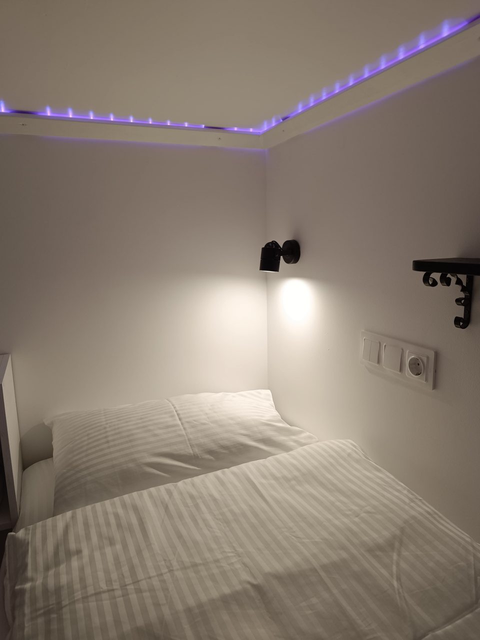 Номер чистый, полноценне освещение в центре номера и над спальным местом, так же есть дополнительное освещение по периметру номера, проходящее как в зоне кровати так и в зоне основной клмнаты. У дополнительного освещения много режимов различающихся по цвету и интенсивности освещения.